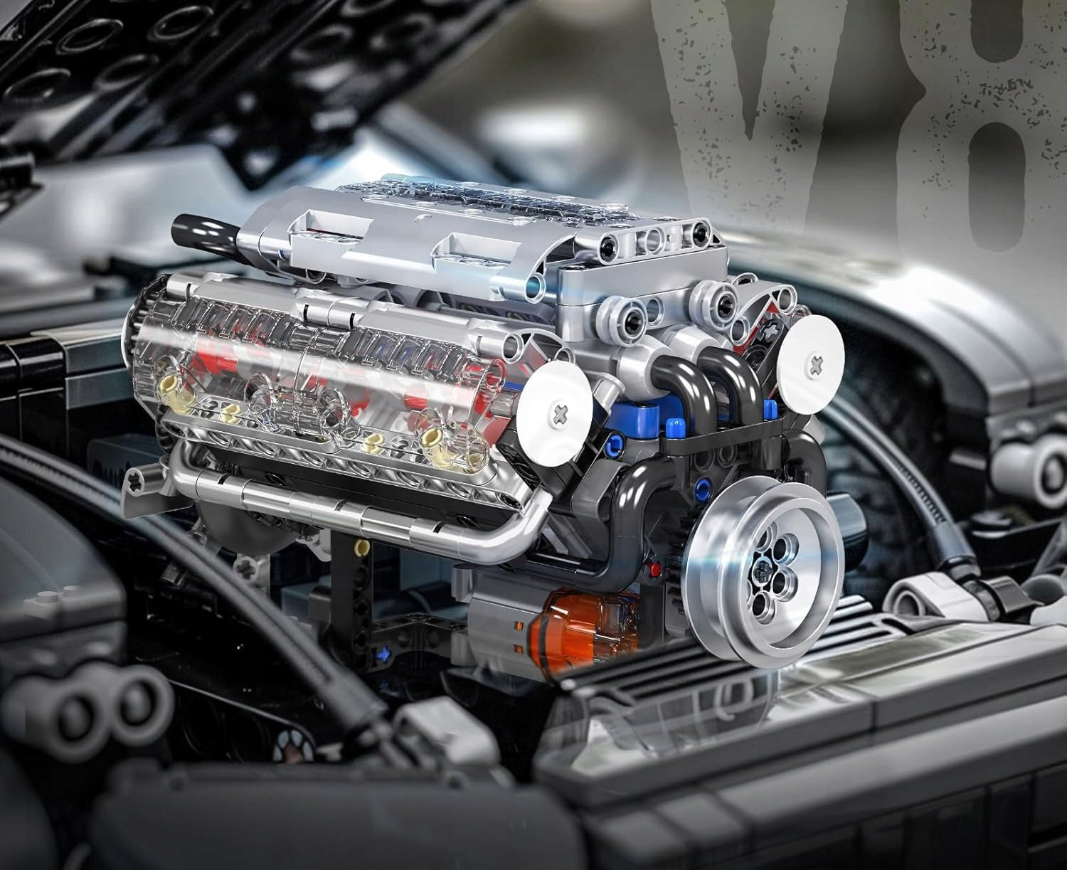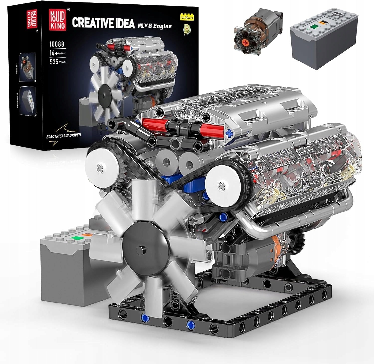 Konstruktorius MOULD KING 10088 V8 benzininis variklis 535 detalės – techninis modelis su judančiais stūmokliais