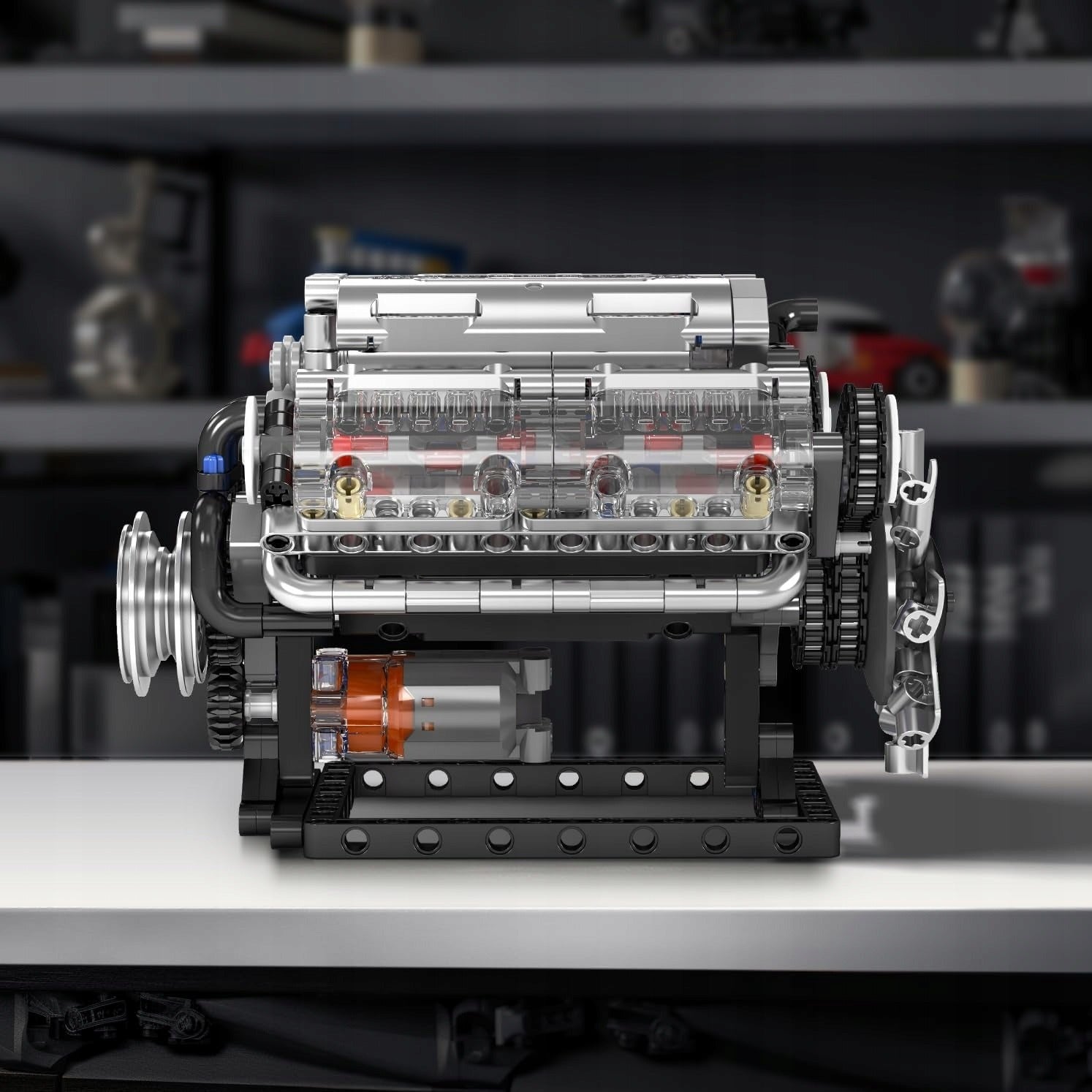 MOULD KING 10088 V8 benzininio variklio konstruktorius – tai įspūdingas 535 detalių rinkinys, leidžiantis kiekvienam iš arti pažinti tikro V8 variklio veikimą. Šis techninis modelis atkartoja autentiškus mechaninius procesus – nuo stūmoklių judėjimo, alkūninio veleno darbo iki turbokompresoriaus bei išmetimo sistemos veikimo. Skaidrus cilindrų dangtis suteikia galimybę matyti, kaip tiksliai juda stūmokliai ir vožtuvai, o įjungus komplekte esančią bateriją variklis atgyja – sukasi velenas, dirba ventiliatorius, o visa konstrukcija tampa gyva. Tai puikus pasirinkimas technikos entuziastams, vaikams nuo 10 metų, taip pat suaugusiems kolekcionieriams, norintiems giliau suprasti inžinerijos pasaulį. Elegantiška dėžutė daro šį konstruktorių idealia dovana, kuri ne tik lavina techninį mąstymą, bet ir suteikia nepamirštamą statymo bei atradimų patirtį. MOULD KING kaladėlės visiškai suderinamos su kitų žinomų gamintojų „Technic“ serijos detalėmis, todėl jas galima derinti, kurti ir plėsti dar sudėtingesnius projektus.