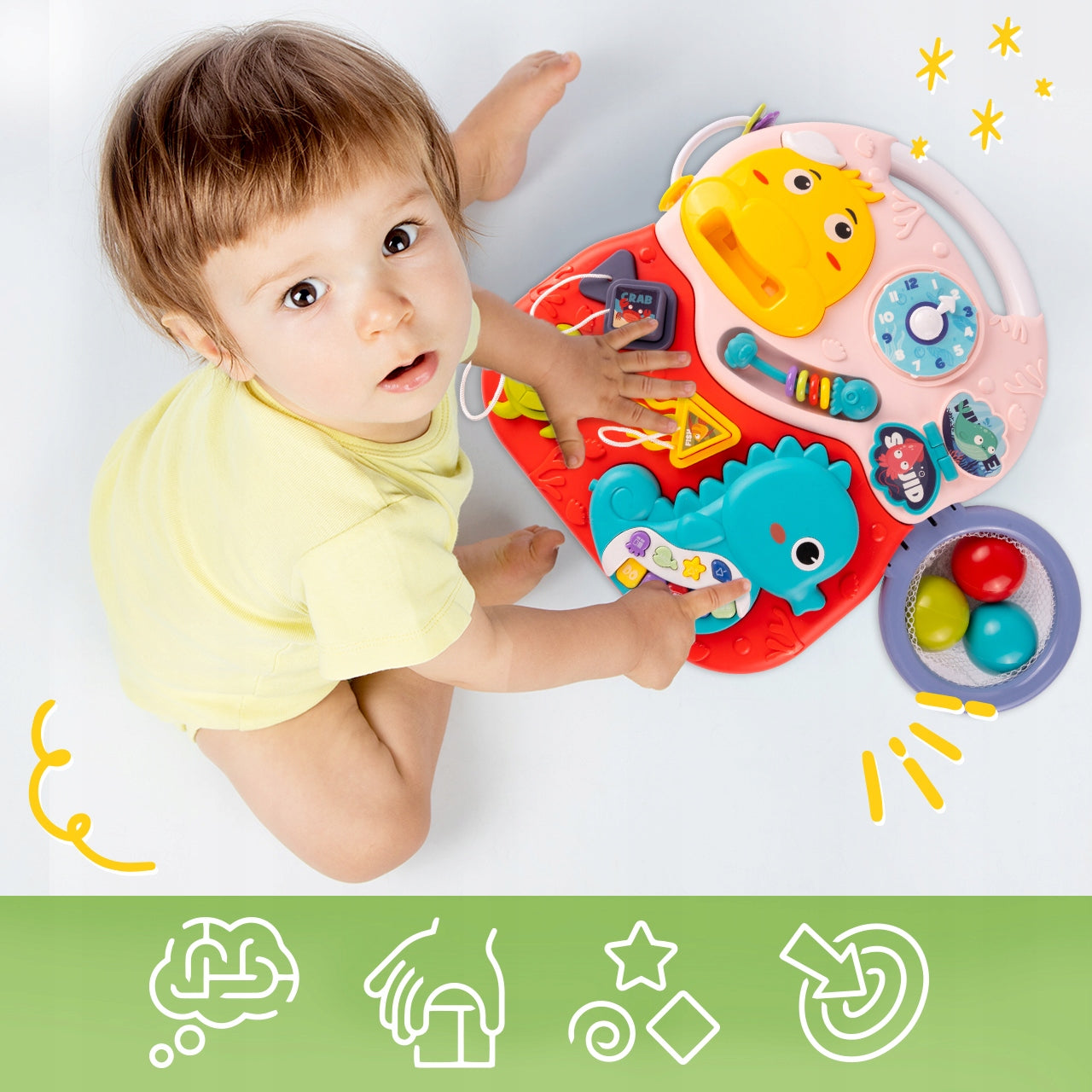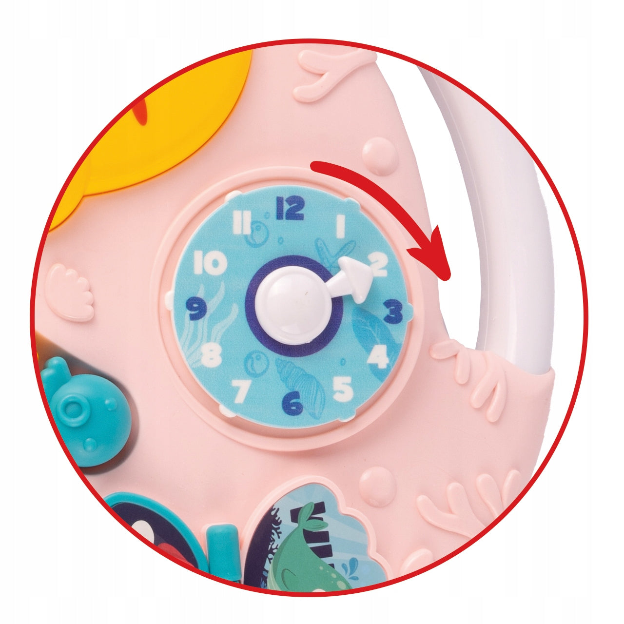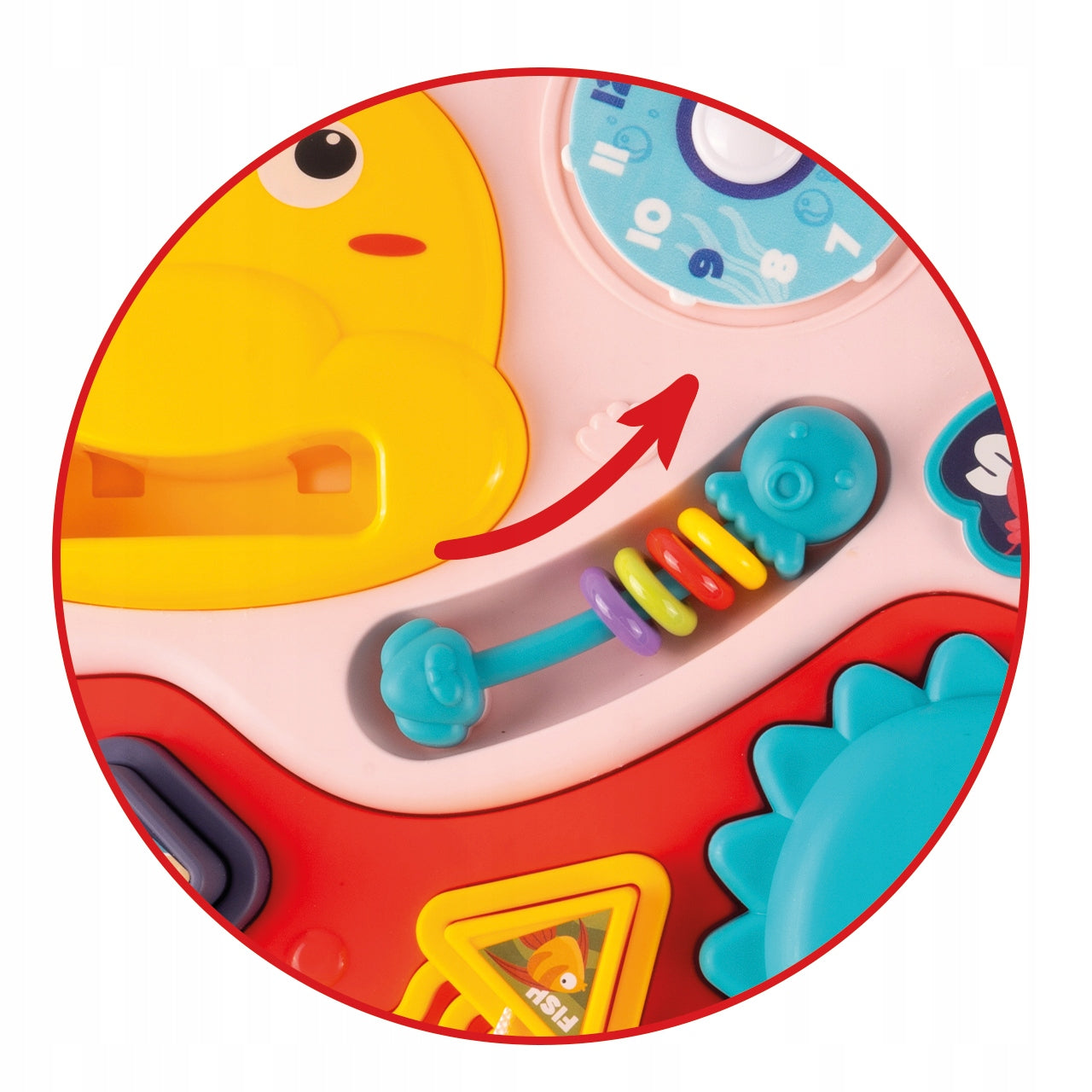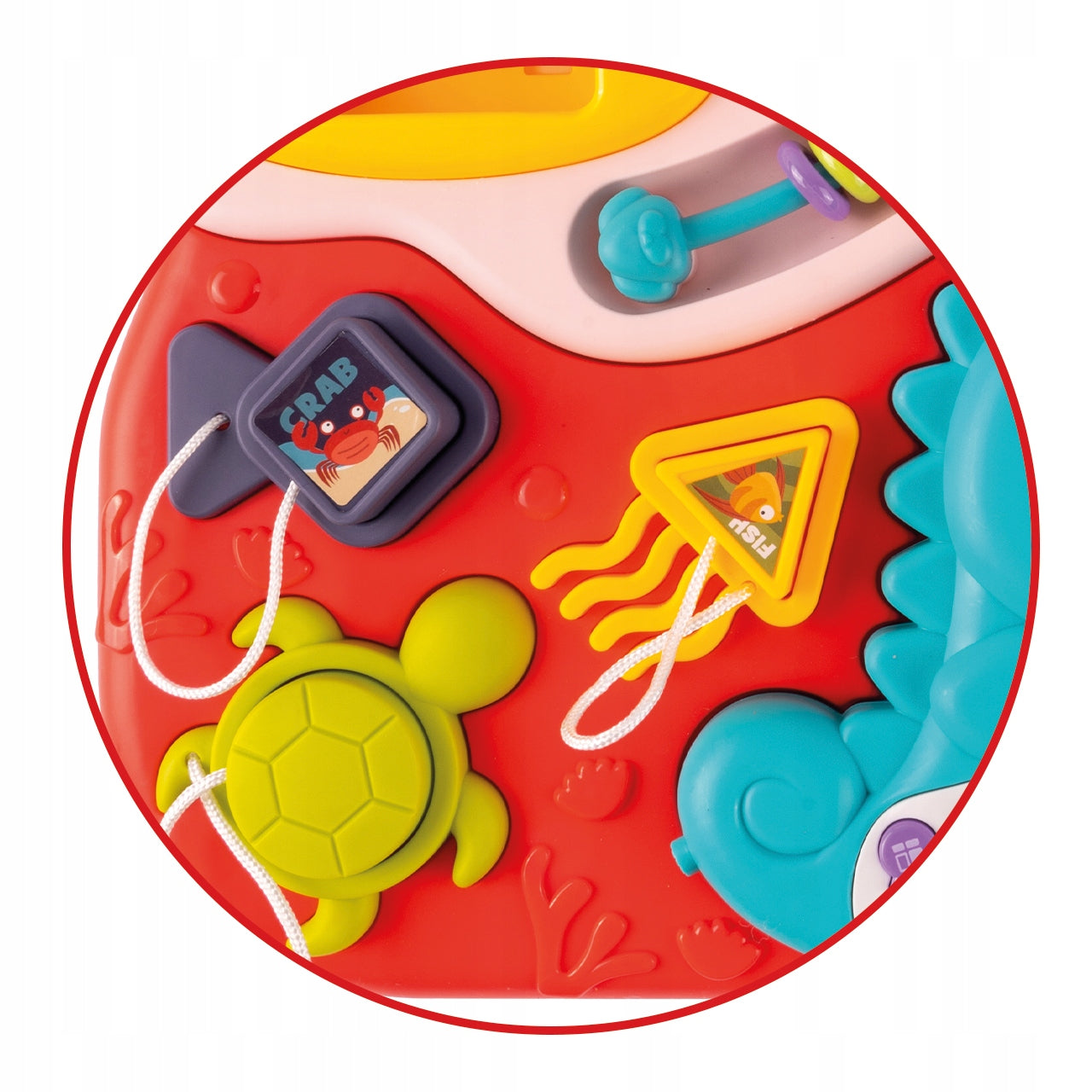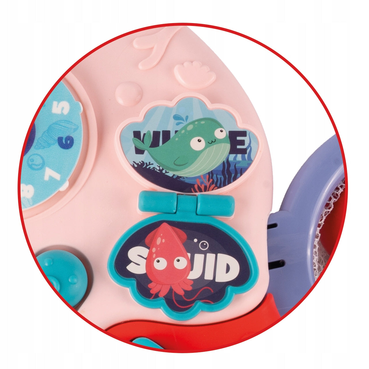 Šis edukacinis staliukas siūlo turiningą žaidimą, kuris stimuliuoja įvairius vaiko raidos aspektus. Vaikai gali lavinti smulkiąją motoriką žaisdami su besisukančiu laikrodžiu, perduodami elementus per kriauklę ar judindami spalvotus karoliukus ant specialios kilpos. Figūrų rūšiavimo užduotis, kurioje reikia teisingai priderinti aštuonkojo, vėžliuko ir žuvytės formeles, moko atpažinti formas ir spalvas, lavina loginį mąstymą bei rankų judesių tikslumą. Visi elementai yra saugiai integruoti, kad vaikas galėtų tyrinėti juos savarankiškai, o ryškūs jūros gyvūnų motyvai daro žaidimą dar patrauklesnį ir įtraukiantį.