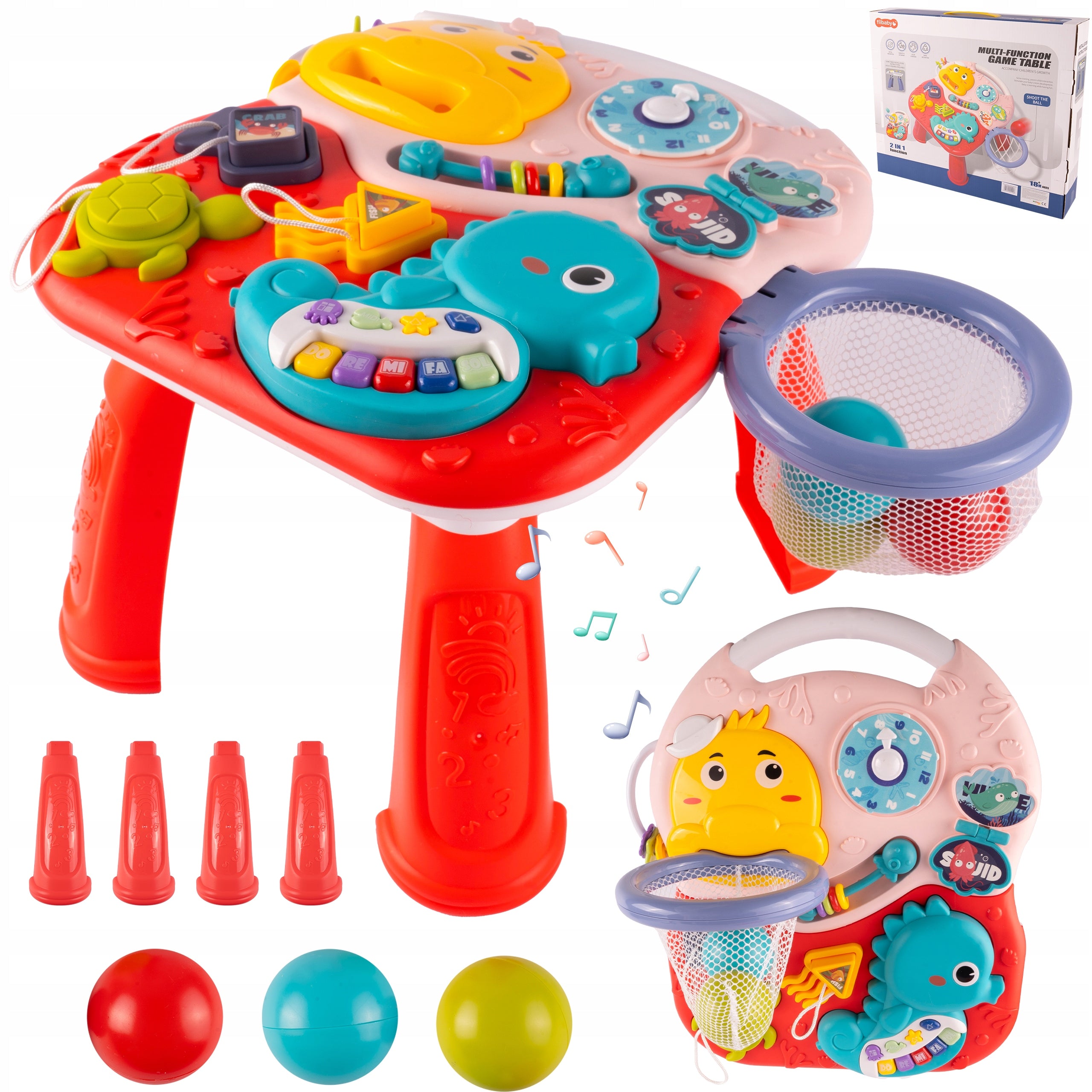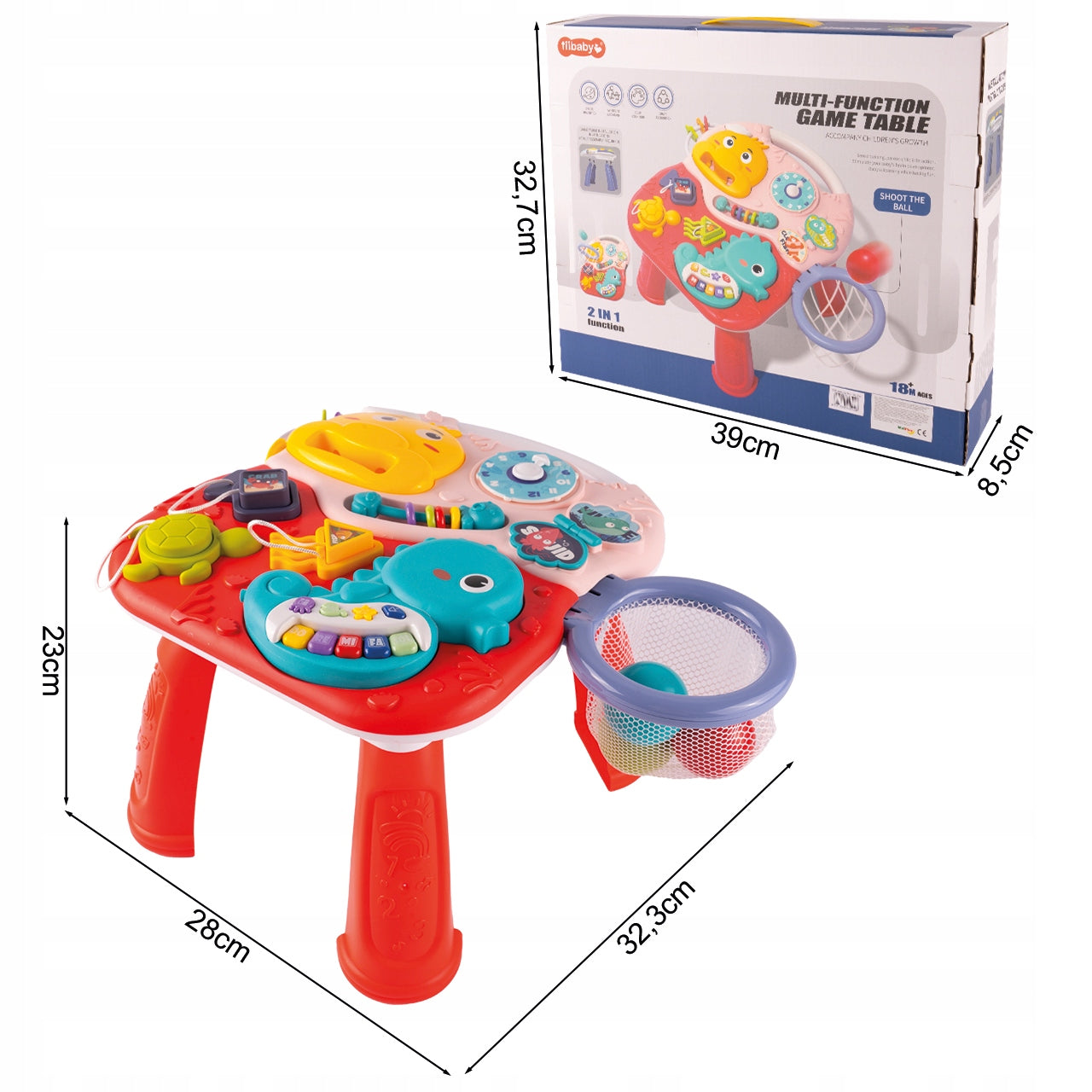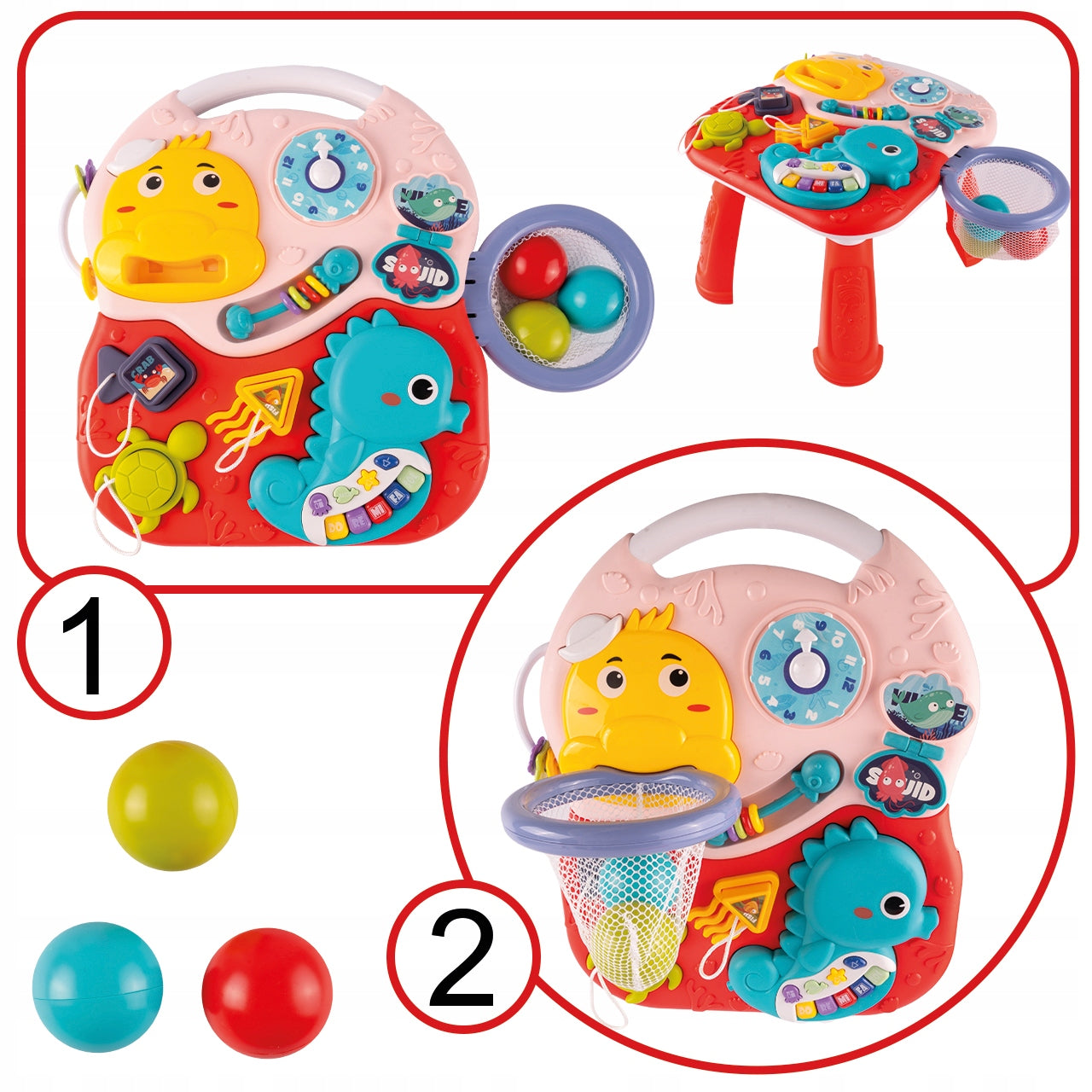 Šis edukacinis staliukas yra itin universalus, nes jį galima naudoti dviem būdais. Pirma, kaip tradicinį lavinamąjį stalą su visomis interaktyviomis funkcijomis. Antra, pasitelkus komplekte esančius priedus, jis lengvai transformuojamas į krepšinio metimo treniruočių komplektą. Ant staliuko galima pritvirtinti krepšinio lanką, o trys mažosios kamuoliukų leidžia vaikui treniruoti taiklumą ir koordinaciją. Toks derinys sujungia mokomąsias pramogas su aktyviu fiziniu judėjimu, skatinant sveikus įpročius nuo mažens. Tai puiki galimybė vaikui išbandyti skirtingas žaidimo formas ir lavinti įvairius įgūdžius viename žaisle.
