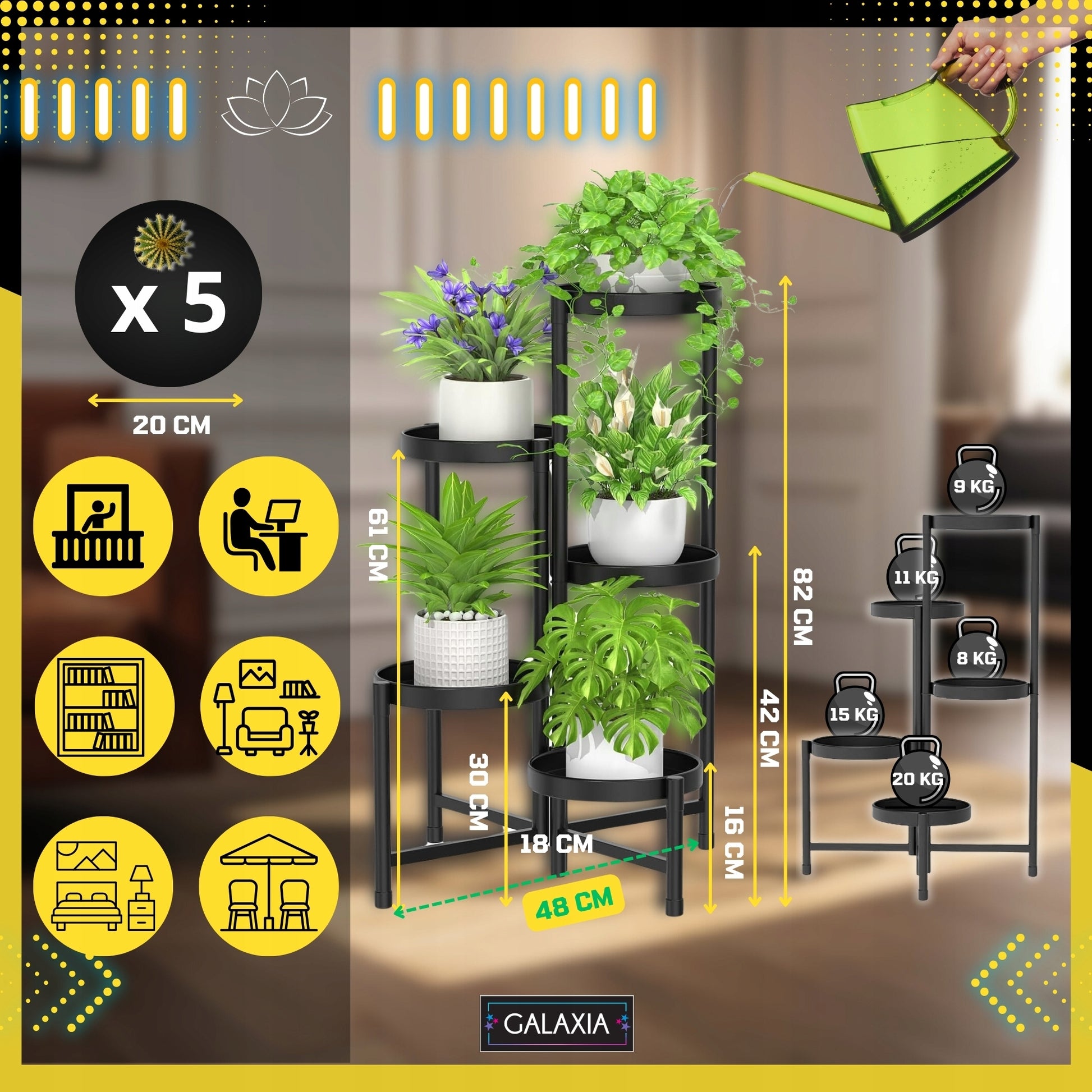 Ieškote stilingo ir praktiško būdo augalams išdėstyti namuose ar lauke? 5 lygių metalinis gėlių stovas iš patikimo prekės ženklo GALAXIA™ – tai puikus pasirinkimas tiek mažiems butams, tiek erdviems interjerams. Dėl tvirtos metalo konstrukcijos, modernaus dizaino ir atsparumo drėgmei šis stovas idealiai tinka svetainėje, miegamajame, biure ar net balkone ir sode. Asimetriškai išdėstytos lentynos užtikrina optimalų šviesos pasiskirstymą visiems augalams, o elegantiška matinė juoda spalva harmoningai dera prie įvairių interjero stilių – nuo lofto iki skandinaviško.