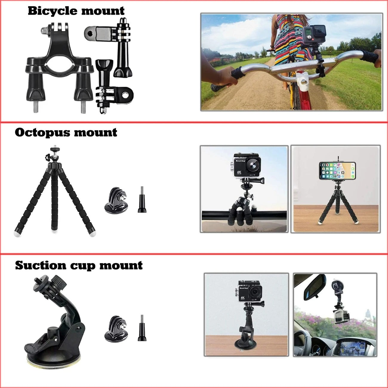 Universalus 20 vnt. veiksmo kameros priedų rinkinys – tai idealus pasirinkimas visiems nuotykių, sporto ir kelionių entuziastams, norintiems užfiksuoti aukštos kokybės kadrus bet kokiomis sąlygomis. Šis komplektas suderinamas su visais populiariausiais veiksmo kamerų modeliais, tokiais kaip GoPro Hero 13/12/11/10/9/8/7/6/5/4, Insta360, DJI Osmo Action 3/4/5, SJCAM, APEMAN, AKASO ir kitais. Rinkinį sudaro krūtinės diržas, galvos diržas, plūduriuojanti rankena vandens sportui, trikojis (octopus) stovas, dviratininko laikiklis, siurbtuko laikiklis automobiliui, riešo diržas ir daugybė kitų adapterių bei priedų įvairiems filmavimo kampams. Visi komponentai yra tvirti, patvarūs ir patogūs naudoti – idealiai tinka ekstremalioms sąlygoms.
