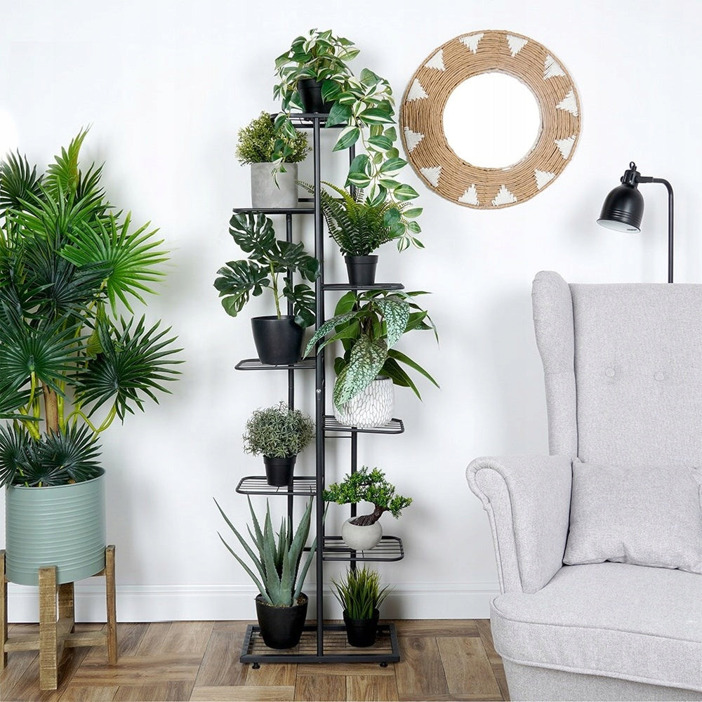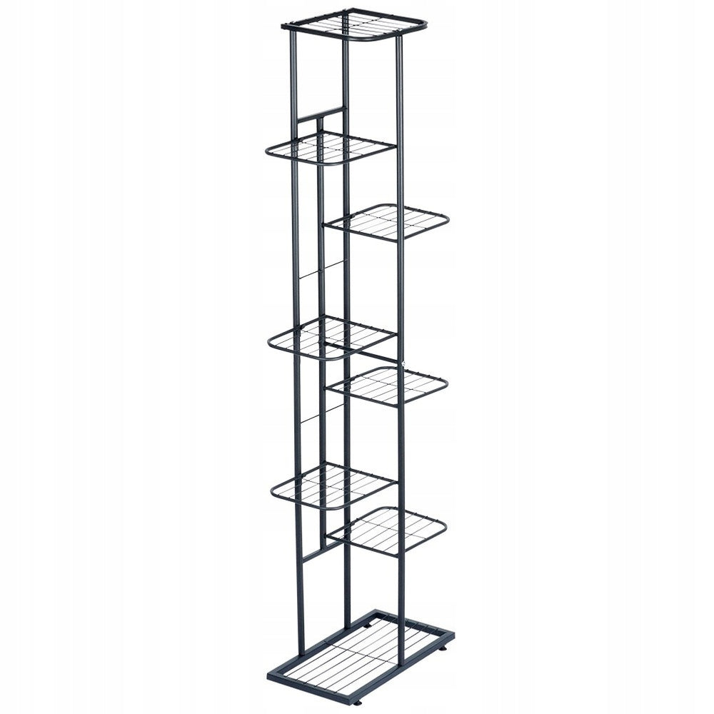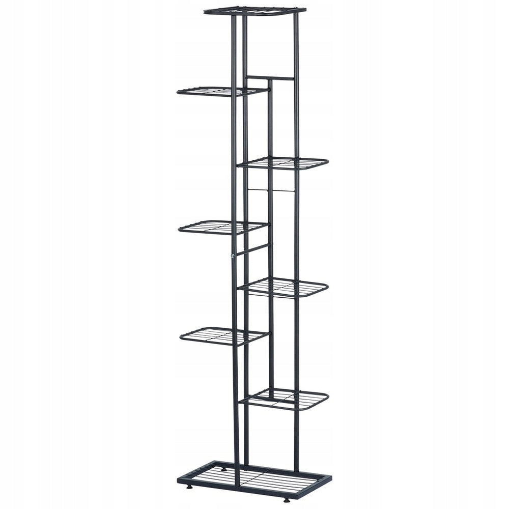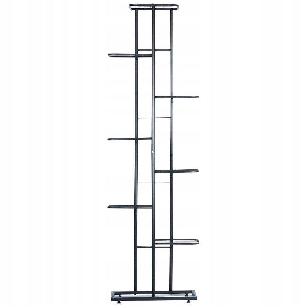 Šis gėlių stovas sukurtas atlaikyti laiko išbandymus ir kasdienį naudojimą. Jo konstrukcija pagaminta iš aukštos kokybės metalo, padengto elegantiška juoda, matinė spalva. Tai ne tik suteikia jam pramoninio stiliaus, bet ir užtikrina atsparumą korozijai ir ilgaamžiškumą. Apačioje esanti stačiakampė lentyna yra erdviausia (41 x 22 cm), joje patogiai sutalpinsite dvi didesnes vazonas. Likusios septynios lentynos, matmenimis apie 22,5 x 19 cm, bei viršutinė 24 x 21,5 cm lentyna, puikiai tinka įvairaus dydžio vazonams ir dekoracijoms, leidžiant sukurti dinamišką ir vizualiai patrauklią kompoziciją. Bendras konstrukcijos svoris yra 2009 g, kas papildomai liudija apie jo tvirtumą.