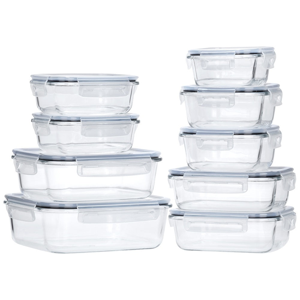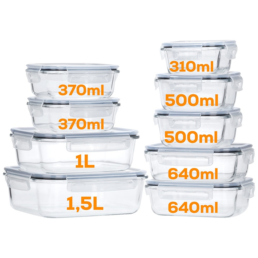 Šis išsamus 9 vienetų stiklinių maisto laikymo konteinerių rinkinys apima įvairių dydžių ir formų indus, sukurtus patenkinti visus jūsų maisto laikymo poreikius. Konteineriai yra suprojektuoti taip, kad juos būtų patogu laikyti – didžiausias konteineris gali talpinti visus likusius, optimizuojant virtuvės erdvę.