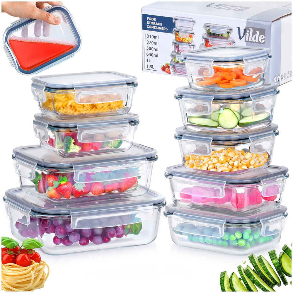 Šis 9 vienetų stiklinių maisto laikymo konteinerių rinkinys yra puikus sprendimas tvarkingam ir saugiam maisto produktų laikymui jūsų virtuvėje. Pagaminti iš aukštos kokybės borosilikatinio stiklo, šie indai yra patvarūs, atsparūs aukštoms ir žemoms temperatūroms, todėl idealiai tinka įvairiausiems maisto produktams laikyti – nuo šviežių daržovių iki pagamintų patiekalų ar birios produkcijos. Skaidrios dangteliai su silikoniniu sandarikliu ir tvirtais užsegimais užtikrina maksimalų sandarumą, išlaikant maisto šviežumą ir skonį ilgiau. Rinkinys sukurtas patogumui, leidžiantis lengvai organizuoti maisto atsargas ir taupyti vietą virtuvės spintelėse.