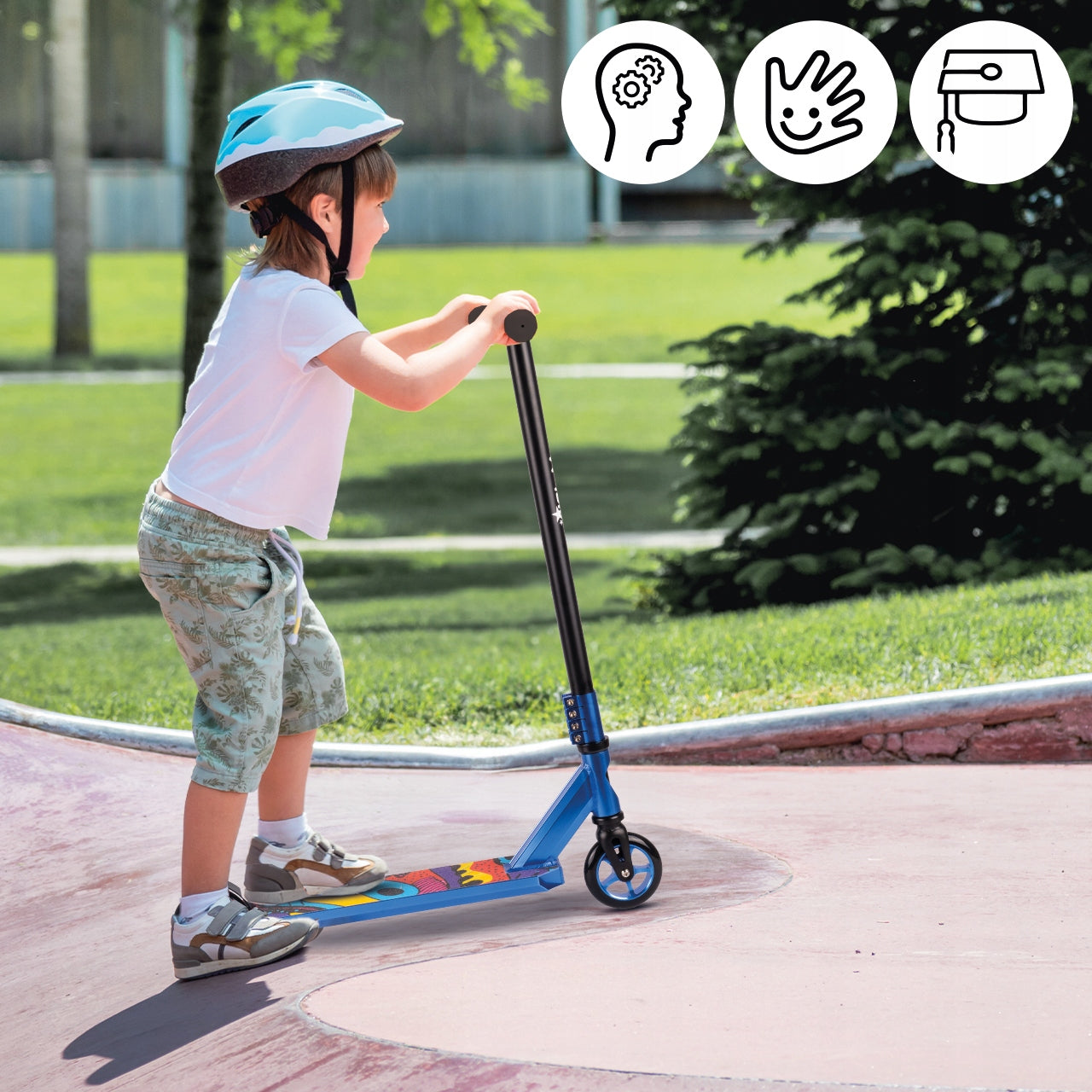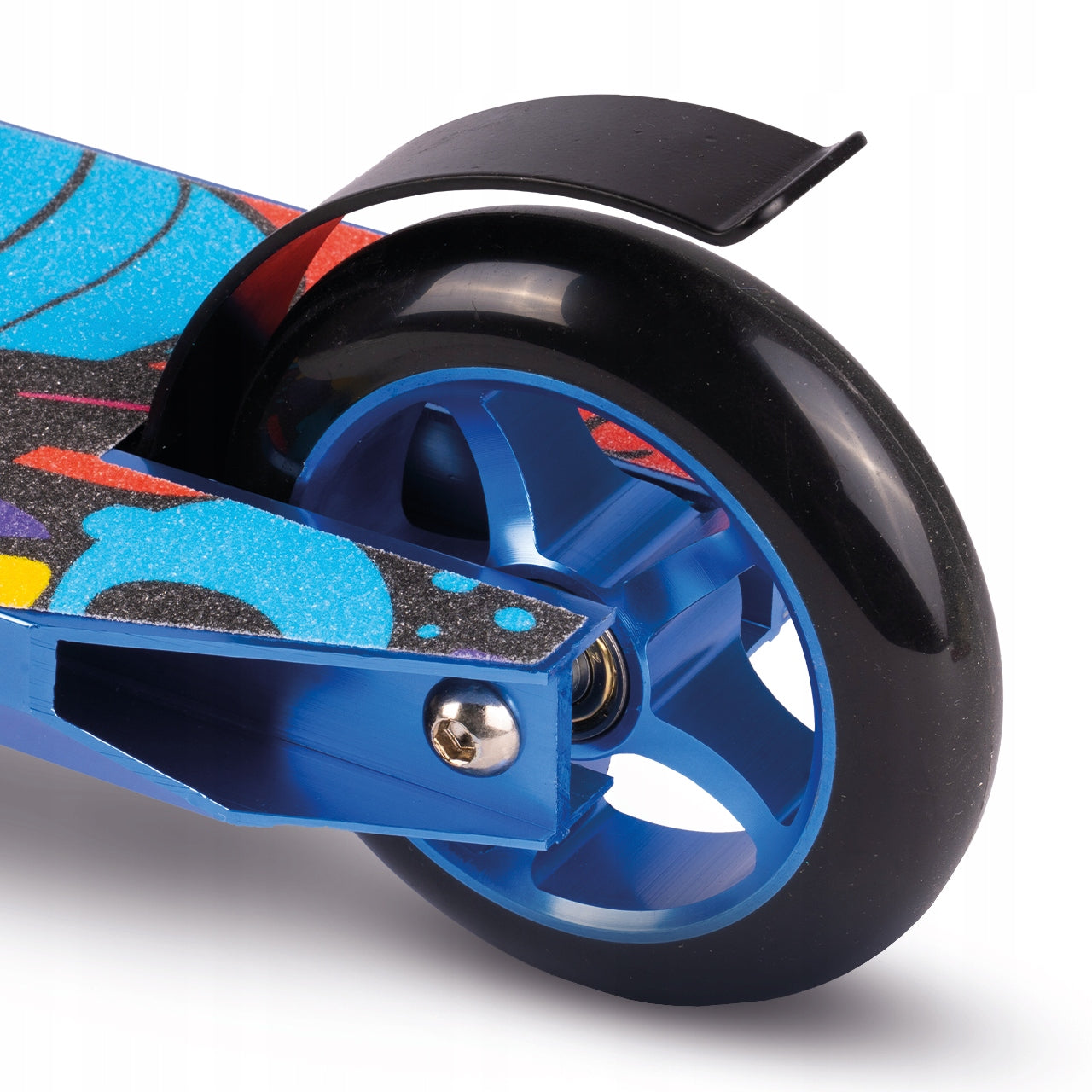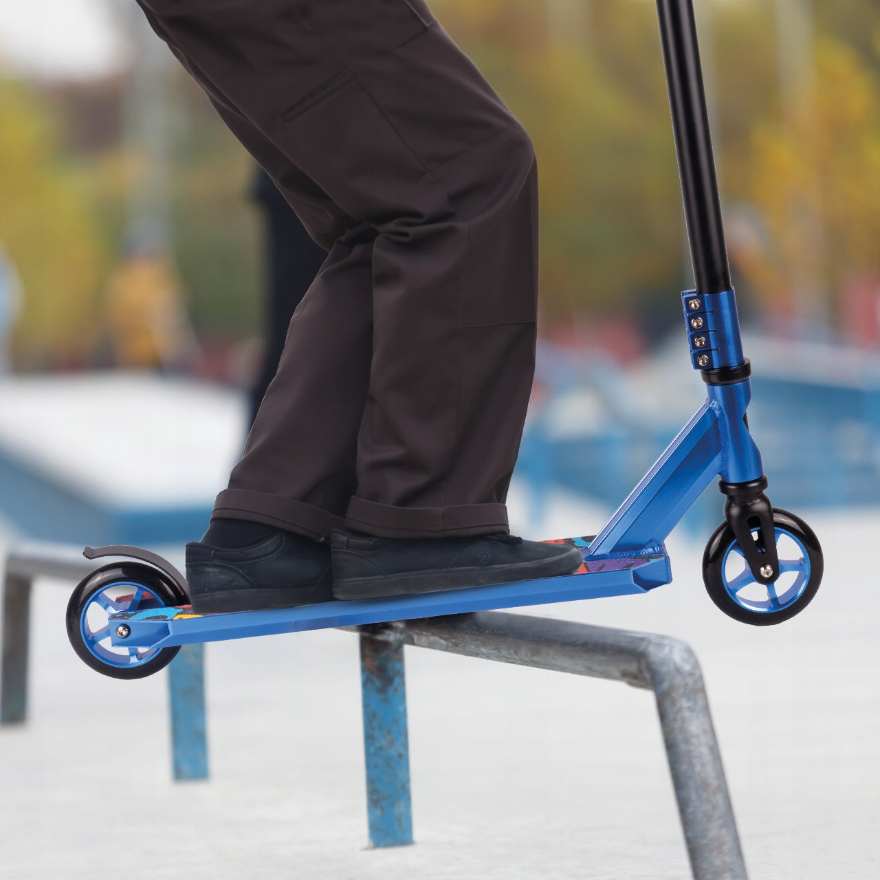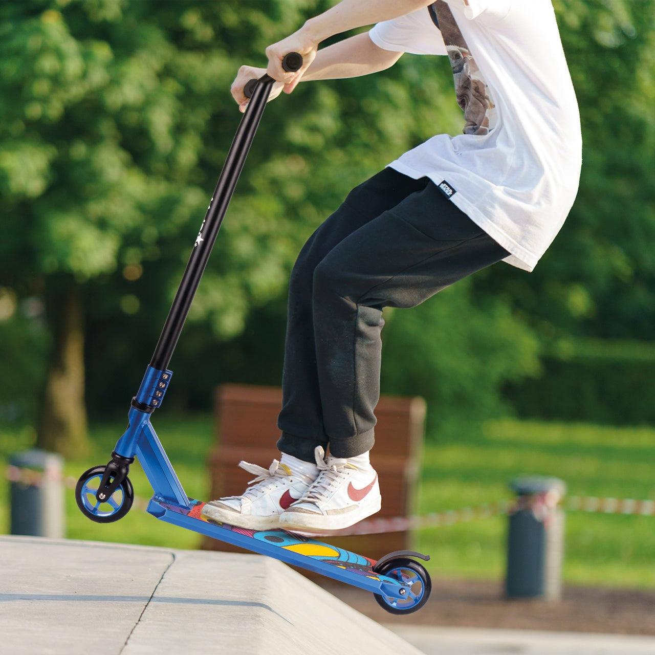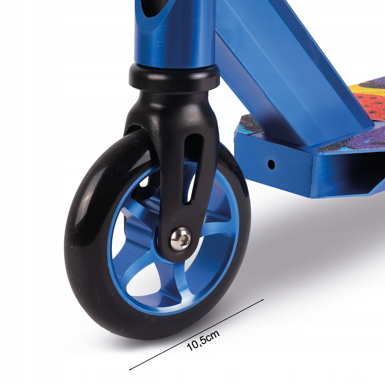 Šis tvirtas paspirtukas sukurtas atlaikyti intensyvų naudojimą ir įvairius triukus. Sutvirtinta T formos vairas suteikia puikų stabilumą atliekant šuolius ir manevrus, o neslystantis padas užtikrina maksimalią kontrolę net ir dinamiškiausio važiavimo metu. 105 mm skersmens PU ratukai pasižymi puikia sukibimu su danga ir ilgaamžiškumu, todėl galėsite drąsiai mėgautis kiekviena kelione, jausdami pasitikėjimą ir saugumą. Jo vos 3,3 kg svoris leidžia lengvai jį transportuoti, o ryški grafika ant platformos traukia akį.