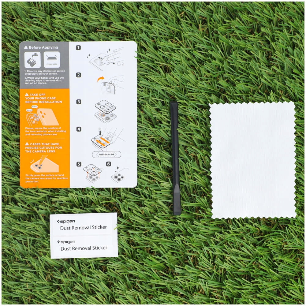 Kiekvienoje Spigen Glas.tR Optik Pro Ez Fit pakuotėje rasite viską, kas reikalinga greitam ir tiksliam apsauginių stiklų montavimui, kad galėtumėte kuo greičiau mėgautis patikima savo iPhone kamerų apsauga.