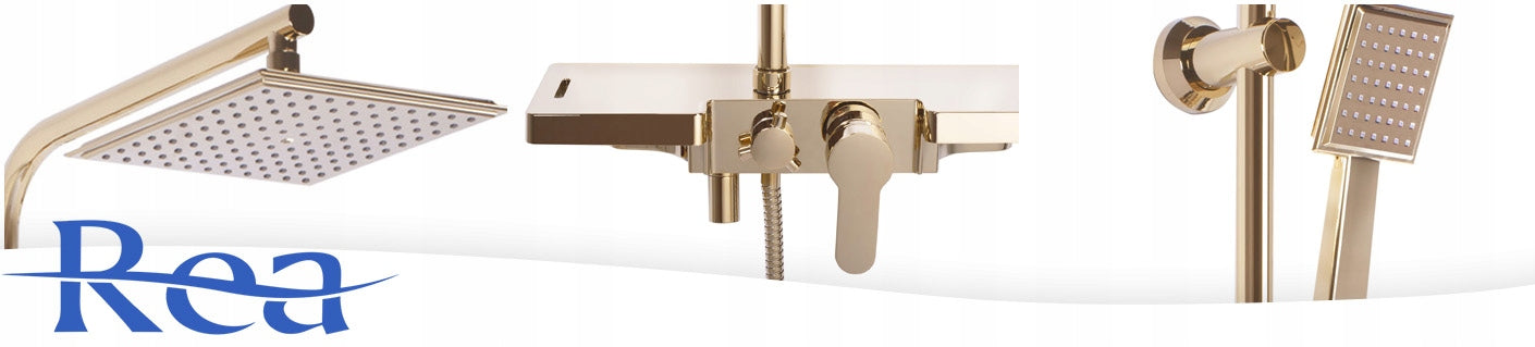 Gamintojas: Rea - Vonios kambarys su vaizdu. Maišytuvas: Vienrankis, lengvai valdomas. Medžiagos: Aukštos kokybės, atsparios korozijai. Spalva: Blizgi auksinė. Matmenys: Bendras aukštis 105 cm, lietaus dušo galvutė 21x21 cm. Žarnos ilgis: 150 cm, užtikrinantis judėjimo laisvę. Montavimas: Sieninis. Papildomai: „Anti-Calc“ sistema nuo kalkių apnašų. Priežiūra: Valymui naudokite tik minkštas, švelnias šluostes ir pH neutralius ar citrinos rūgšties pagrindo valiklius. Niekada nemaišykite valymo priemonių ir kruopščiai nuplaukite švariu vandeniu po valymo. Vengti garinių valytuvų ir stiprių rūgštinių (acto, druskos) ar šarminių valiklių.