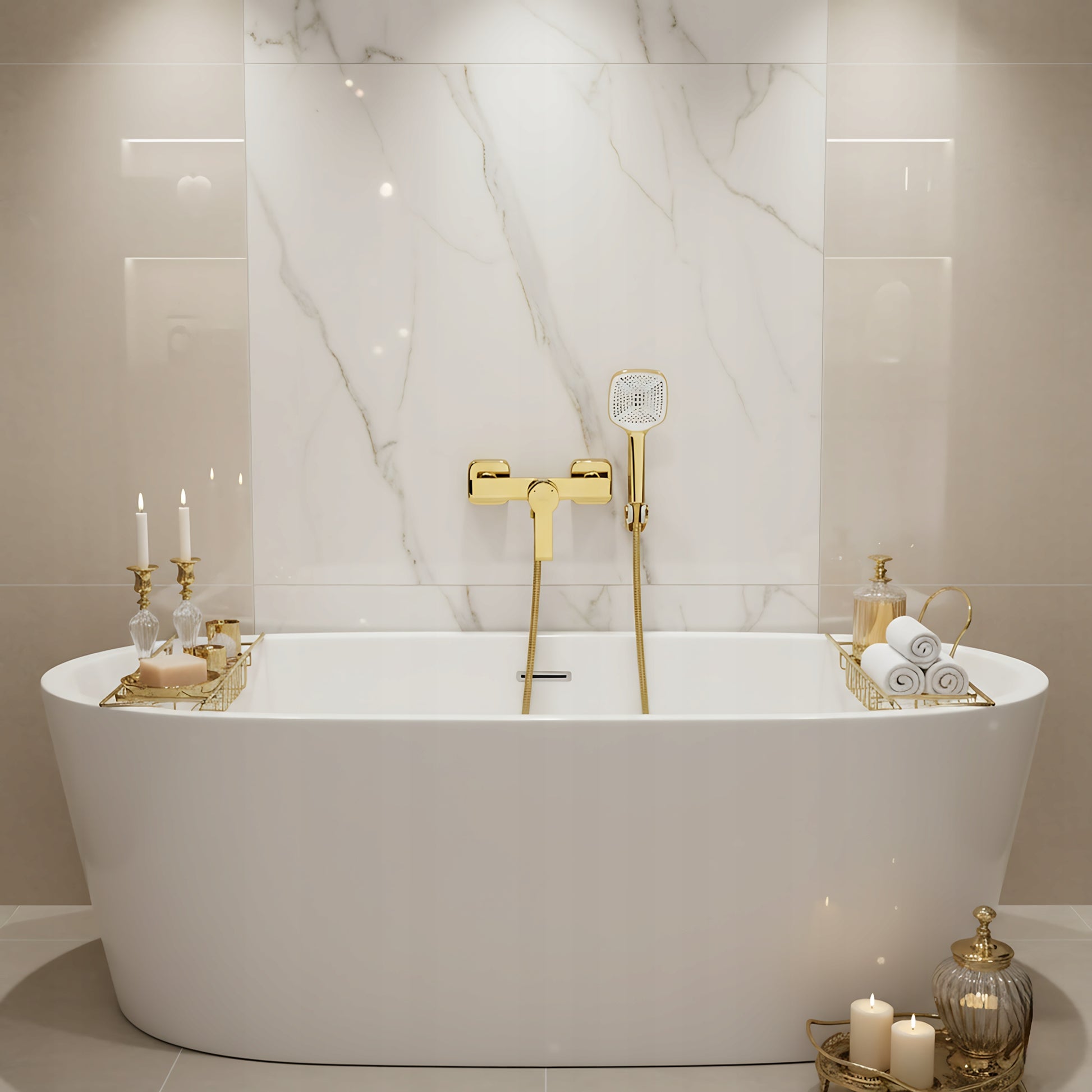 - Prabangi išvaizda: Blizganti aukso apdaila suteikia vonios kambariui išskirtinio žavesio ir prabangos pojūtį, puikiai tinka glamūrinio, modernaus ar Art Deco stiliaus interjerams.