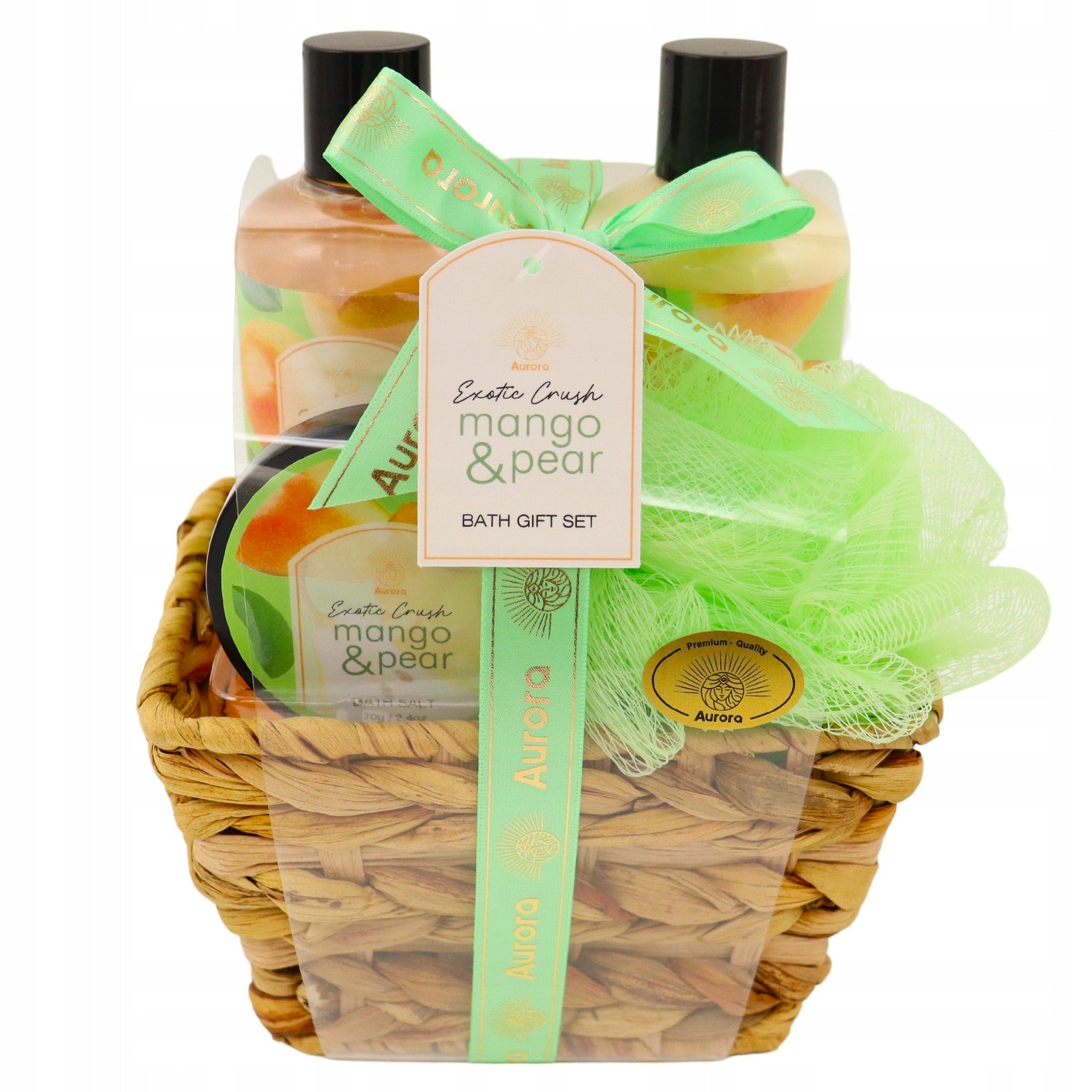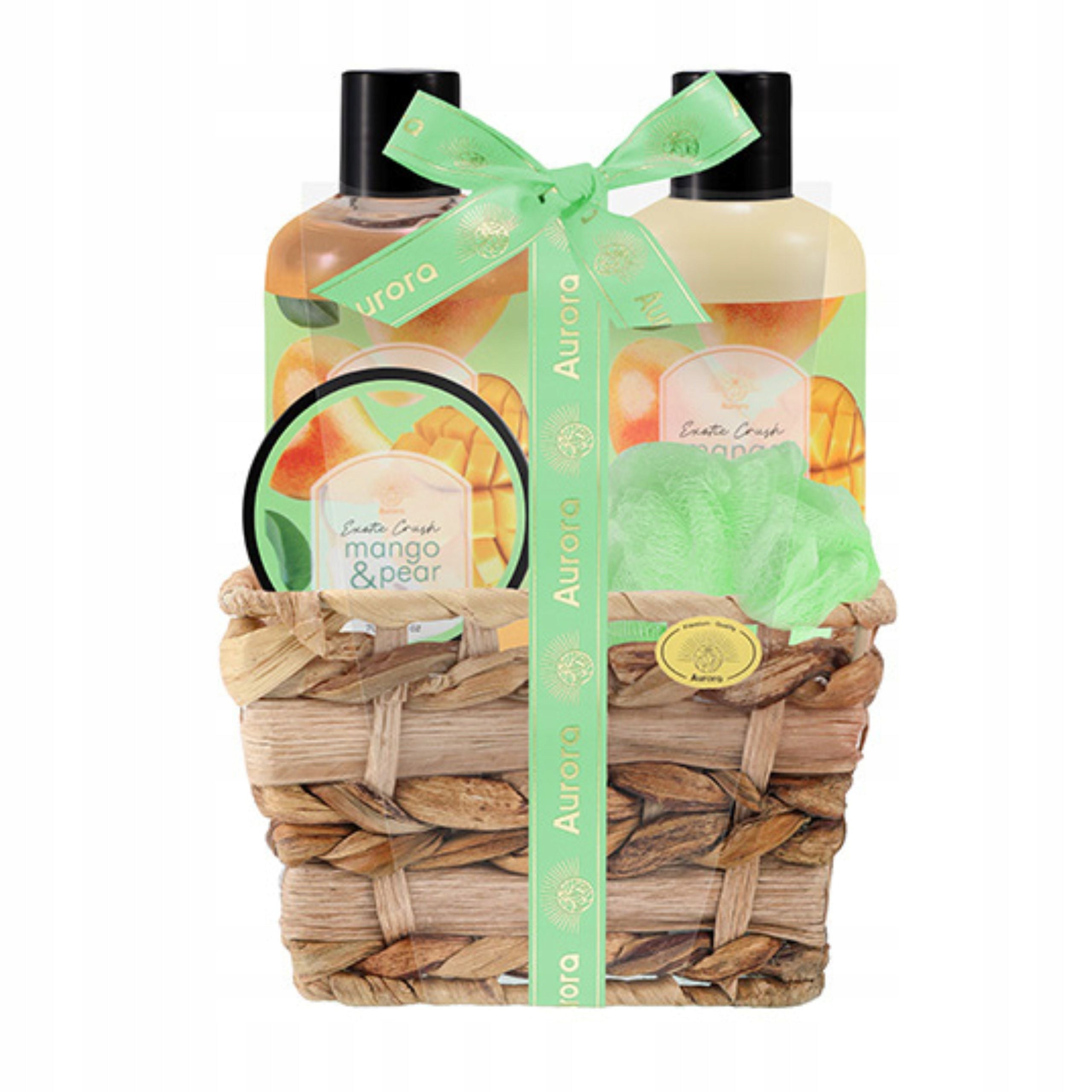 Aurora Dovanų rinkinys 4 kosmetikos priemonės pintame krepšelyje Mango ir kriaušės