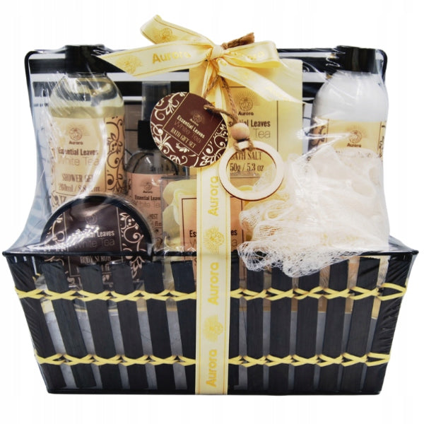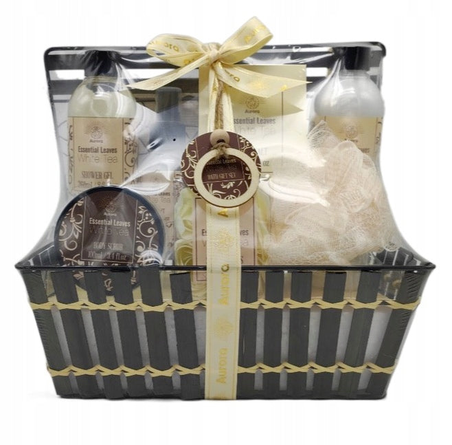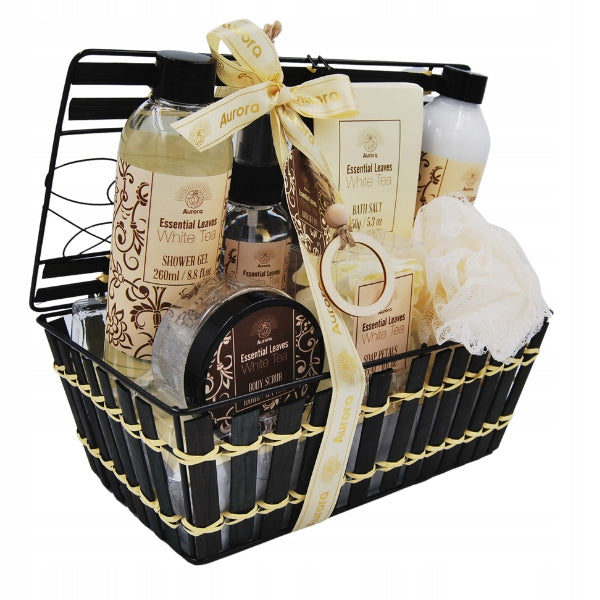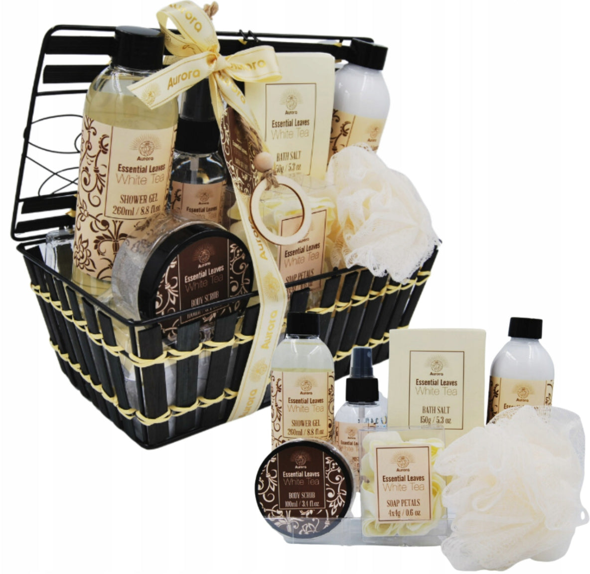 Aurora Dovanų rinkinys 7 kosmetikos priemonės metaliniame krepšelyje baltoji arbata