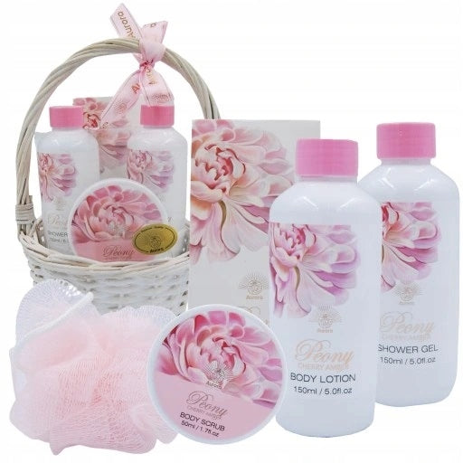 Aurora Dovanų rinkinys su kosmetika nertiniame krepšelyje su bijūnu Kalėdoms