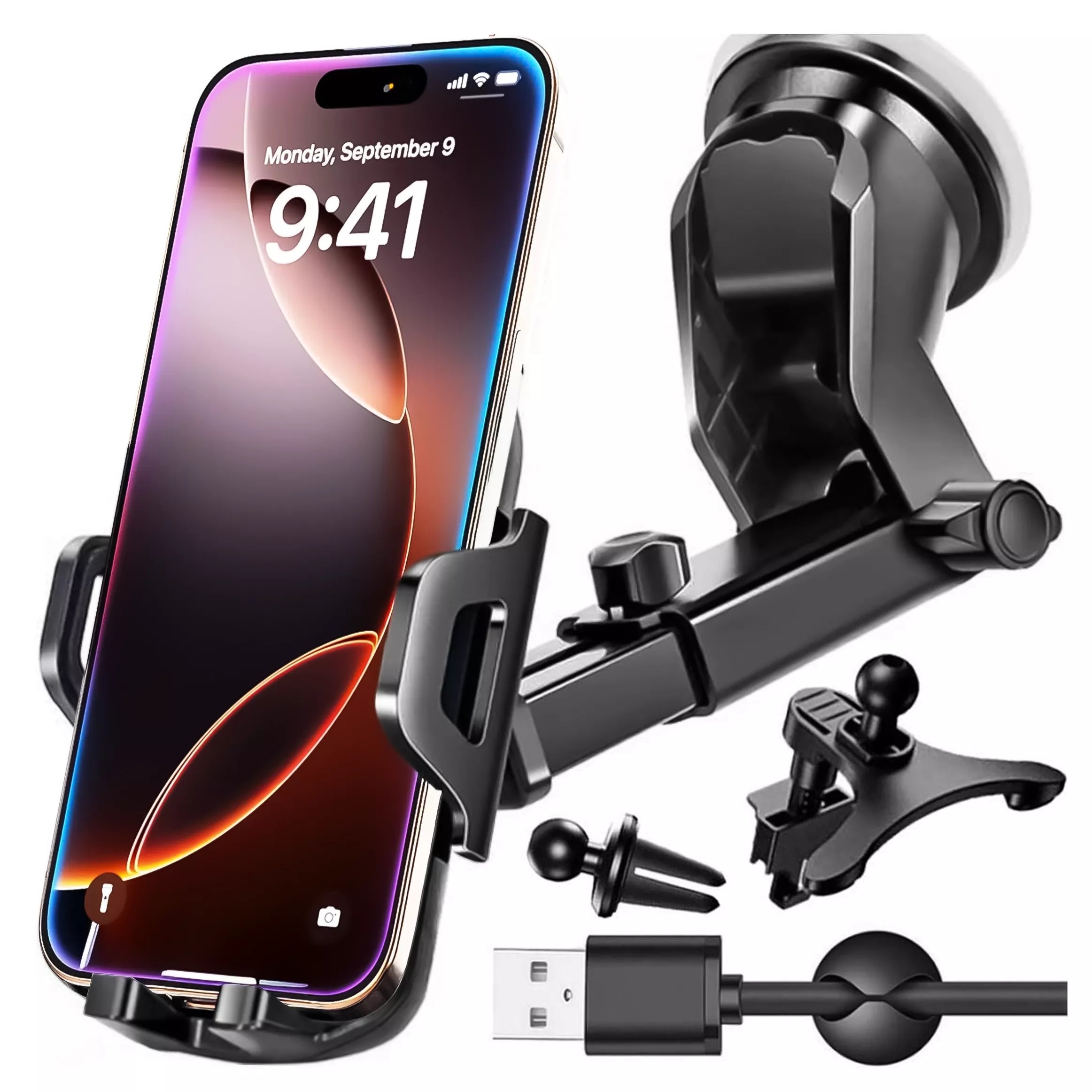 - Stiprus fiksavimas: Daugkartinio naudojimo siurbtukas ir reguliuojamos svirtys užtikrina stabilų telefono laikymą.