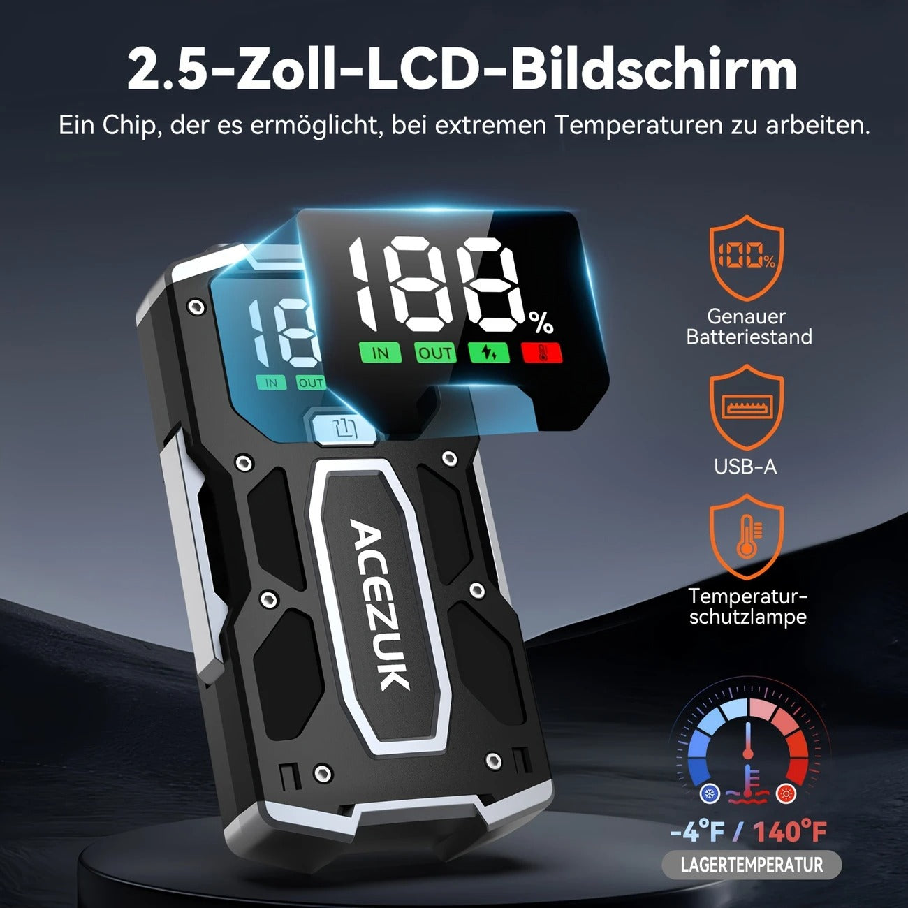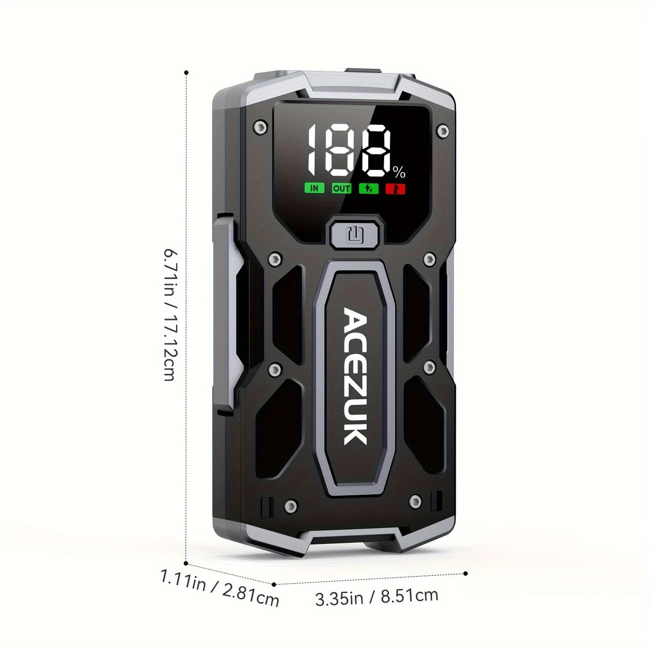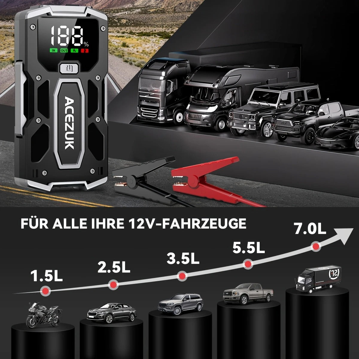 Šis šuolių starteris – tai tavo asmeninis gelbėtojas kelyje. 12V galia užveda benzininius variklius iki 7.0L ir dyzelinius iki 5.5L, net esant -20°C šalčiui ar +60°C karščiui. Tai ne tik automobilio užvedėjas – tai ir nešiojamas power bankas tavo telefonui bei avarinis LED žibintuvėlis su SOS funkcija. Didesnis, ryškesnis LCD ekranas leidžia matyti visą informaciją aiškiai ir greitai – jokio spėliojimo.