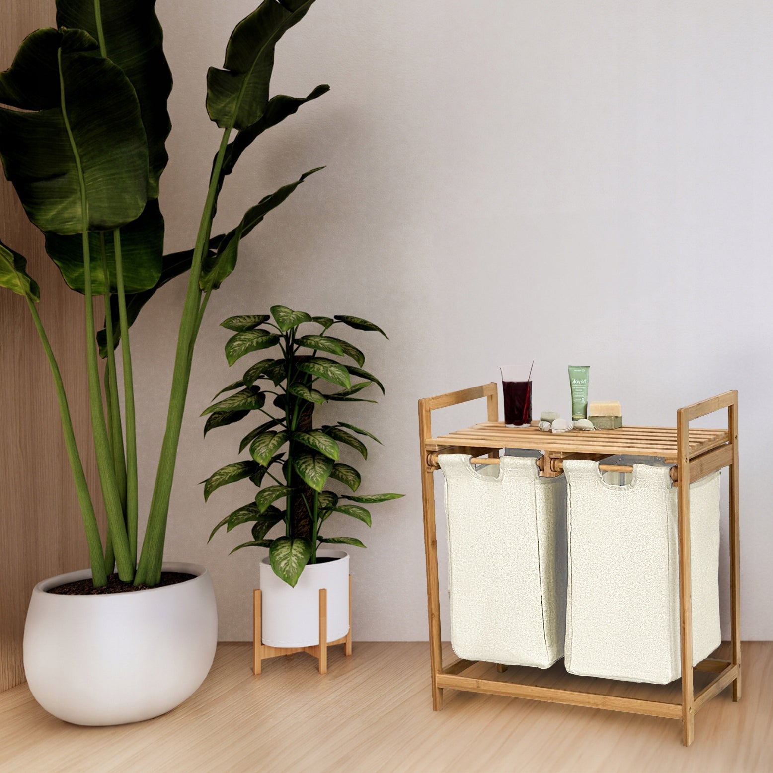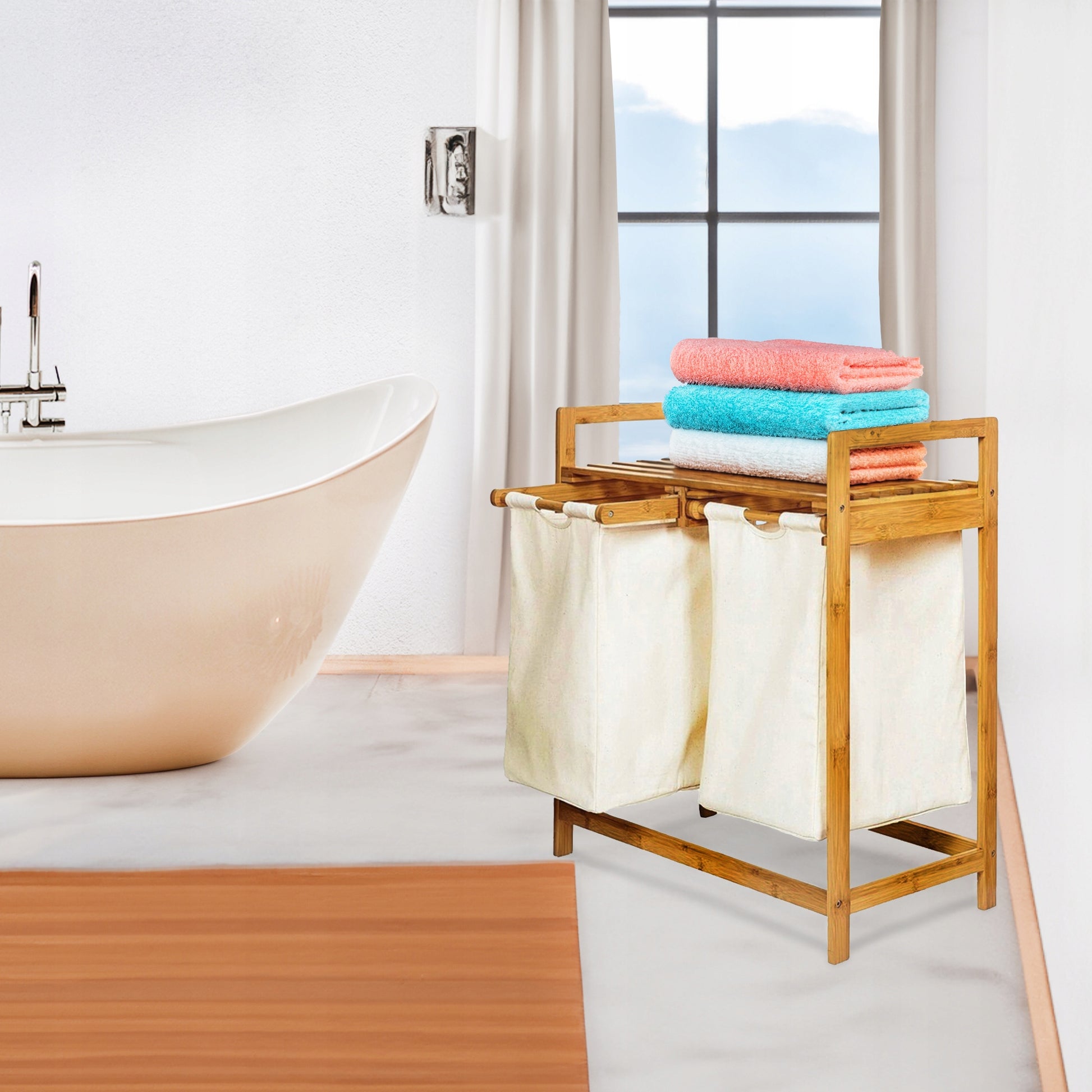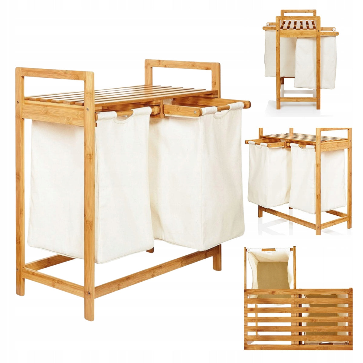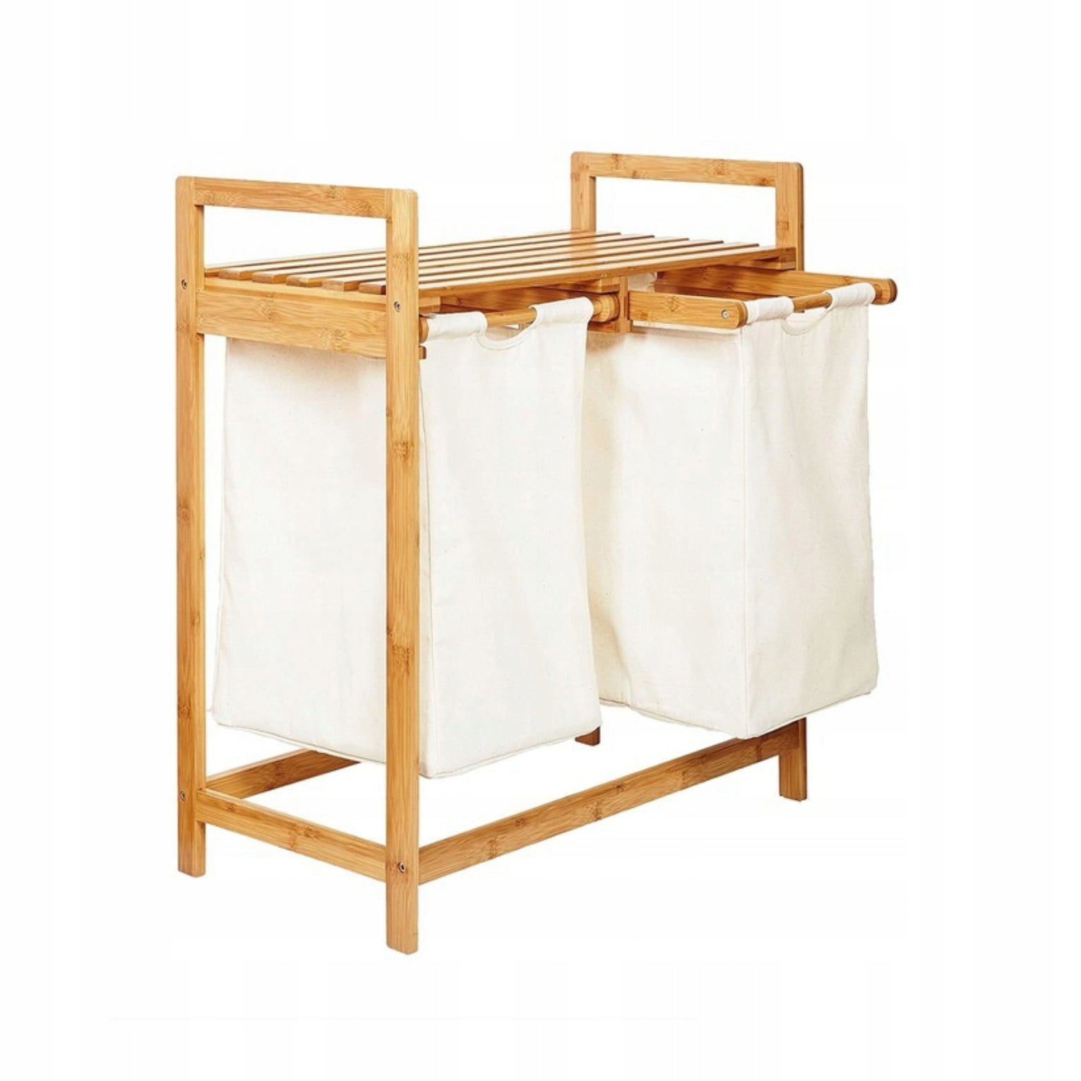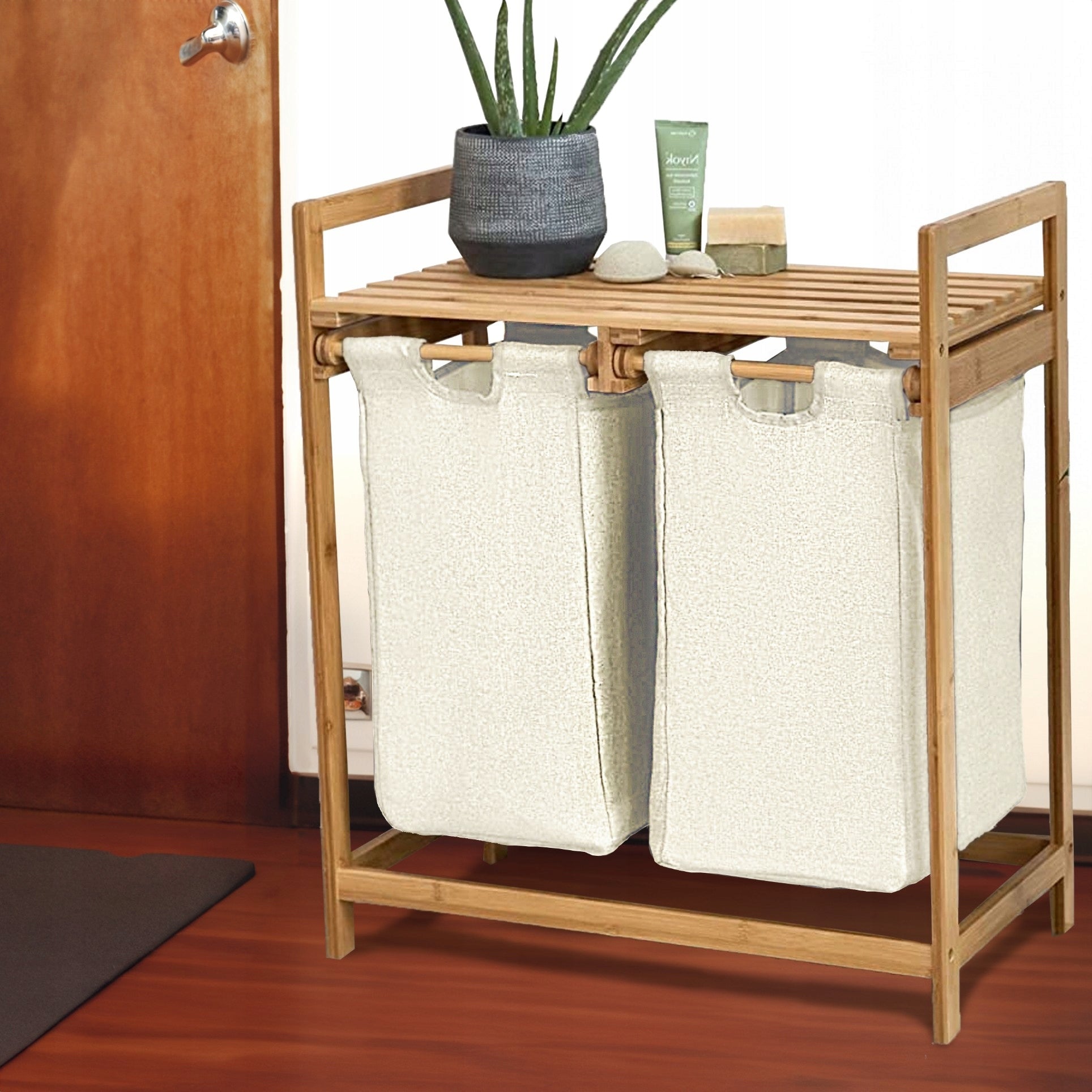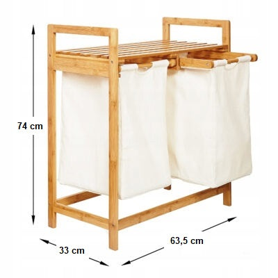 Bambukinė skalbinių dėžė su lentyna, dviejų skyrių, 73x64x33, smėlio spalvos
