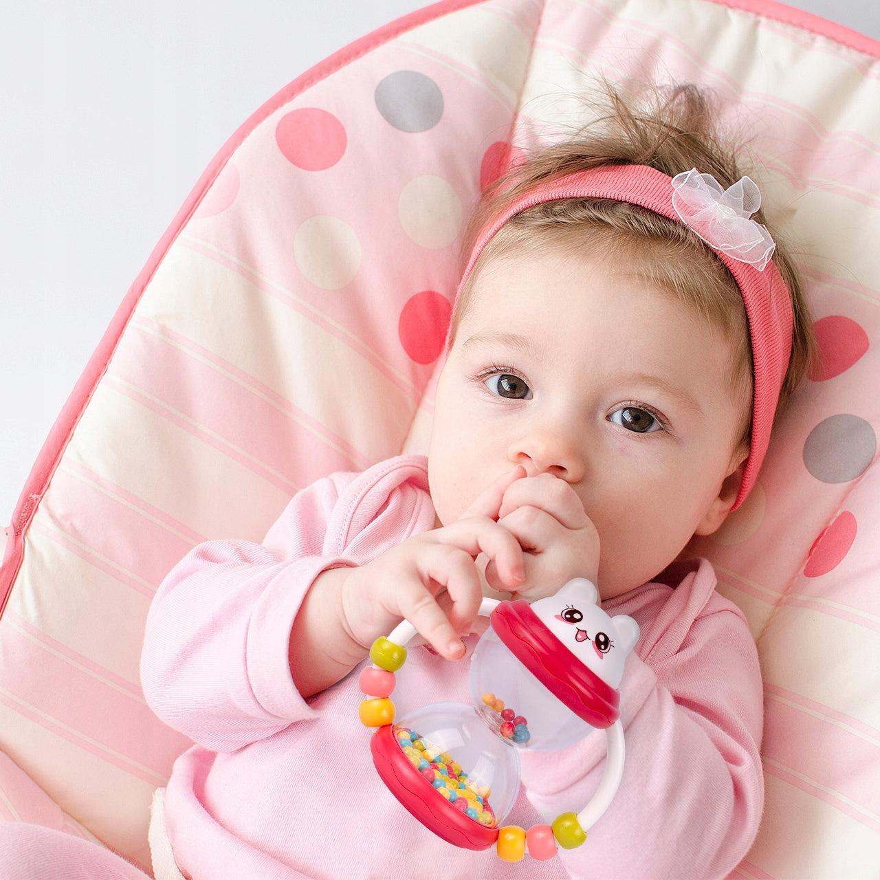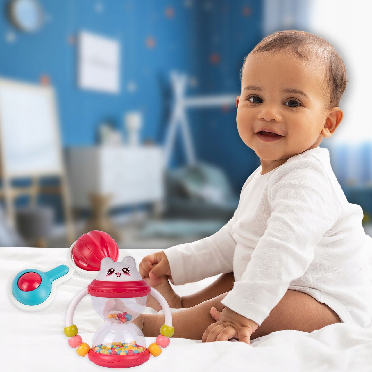 Šis rinkinys sukurtas taip, kad suteiktų visapusišką pojūčių stimuliaciją. Ryškios spalvos ir skirtingos formos pritraukia vaiko dėmesį ir padeda jam mokytis skirti spalvas bei formas. Judančios detalės ir malonūs garsai lavina regą ir klausą. Žaislai pagaminti iš saugių, netoksiškų medžiagų, todėl galite būti ramūs, kad jūsų mažylis žaidžia saugiai.