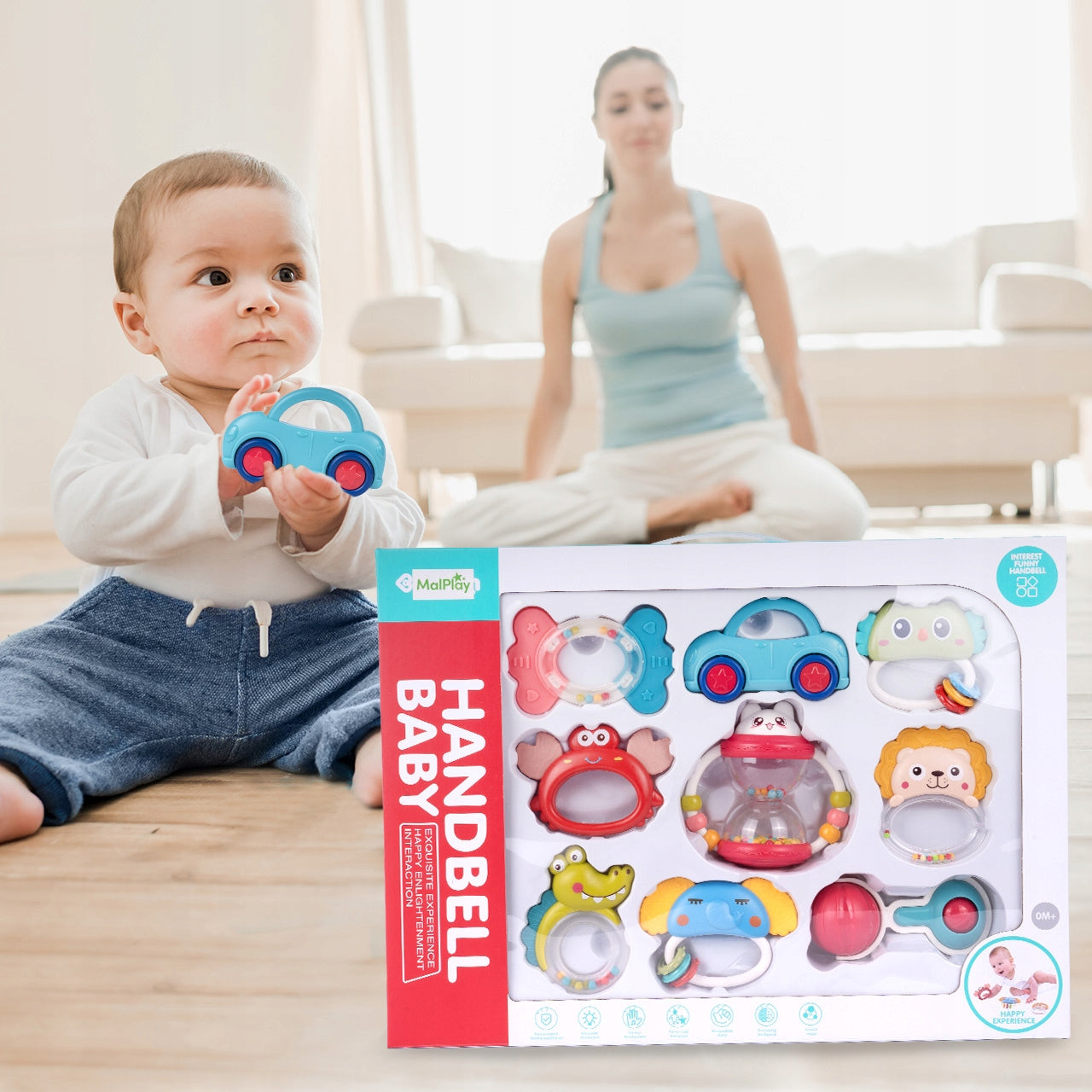 Dėžutėje rasite kruopščiai atrinktą 9 žaislų rinkinį, kuris užtikrins ilgalaikį pramogą ir lavinimą: