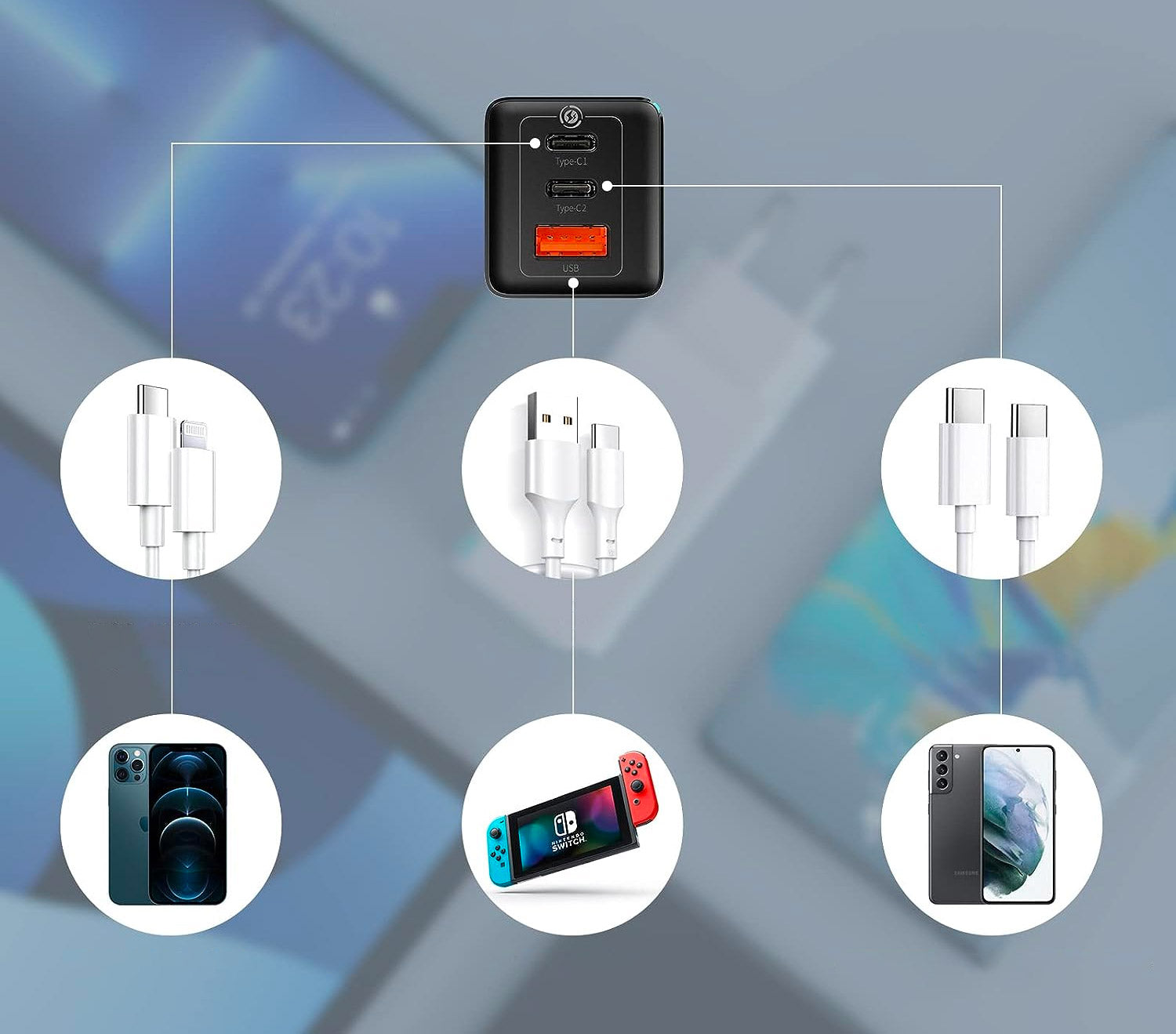 - Universalumas: Du USB-C ir vienas USB-A prievadas leidžia vienu metu krauti tris skirtingus įrenginius.