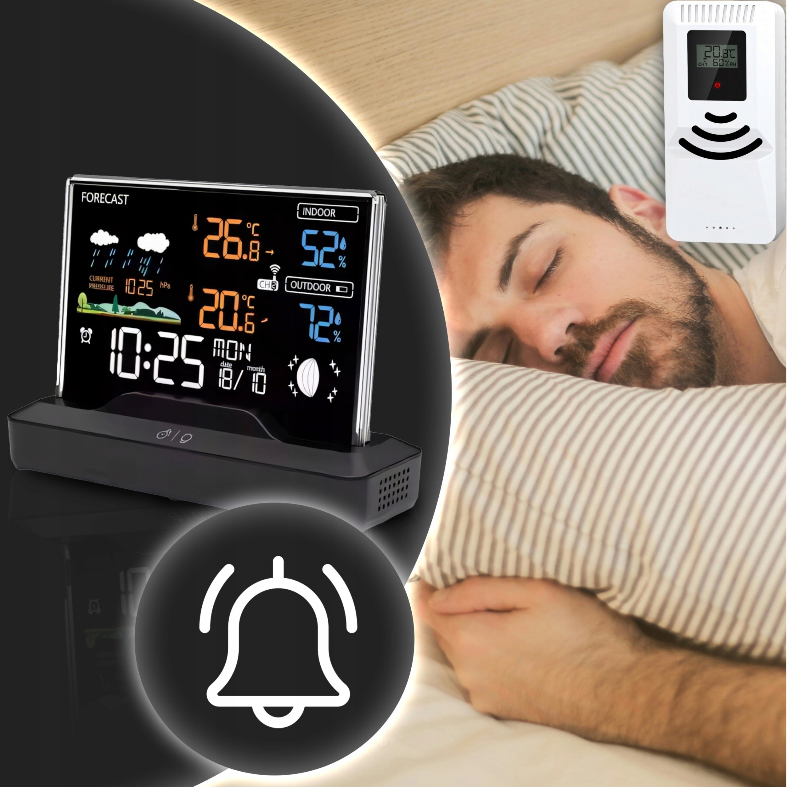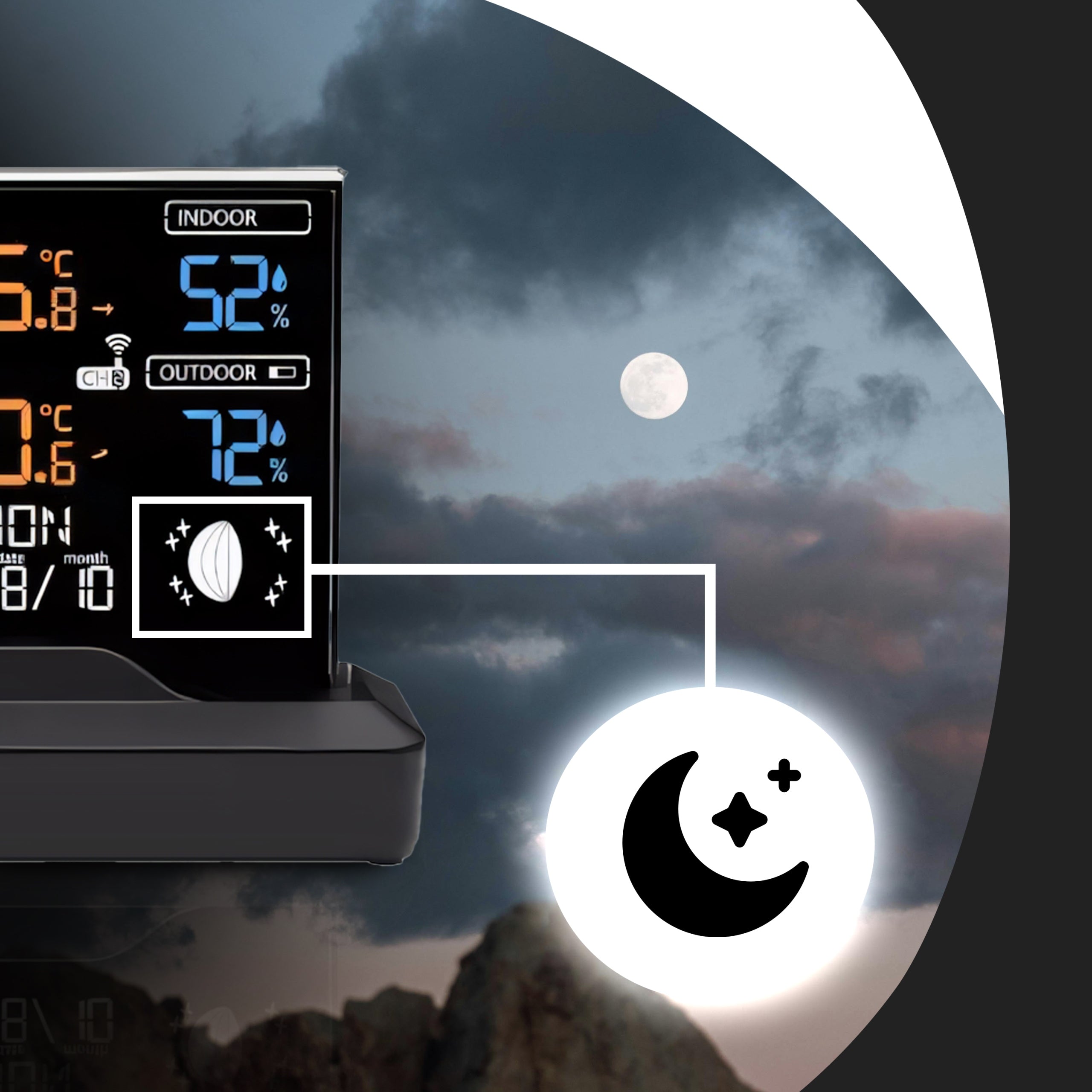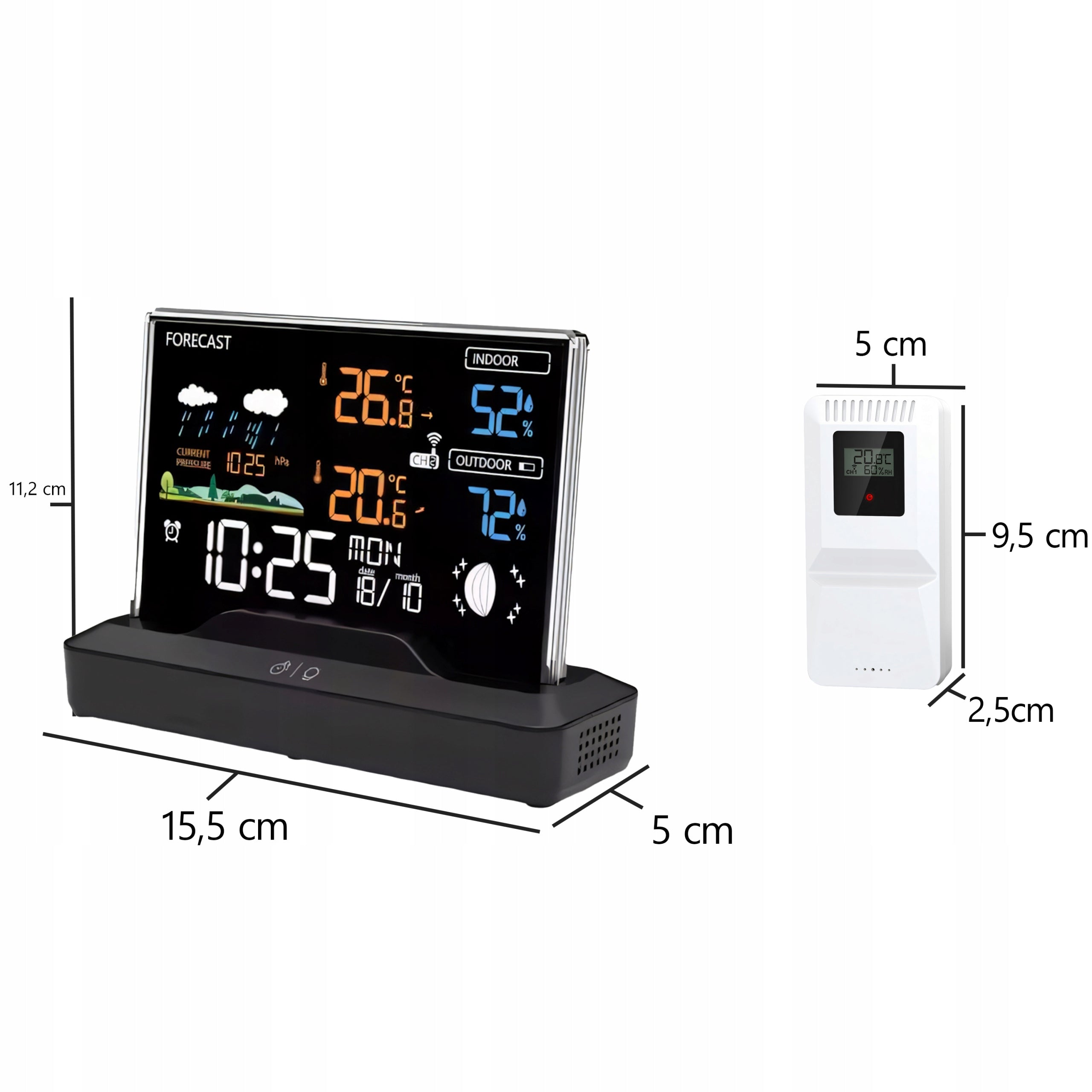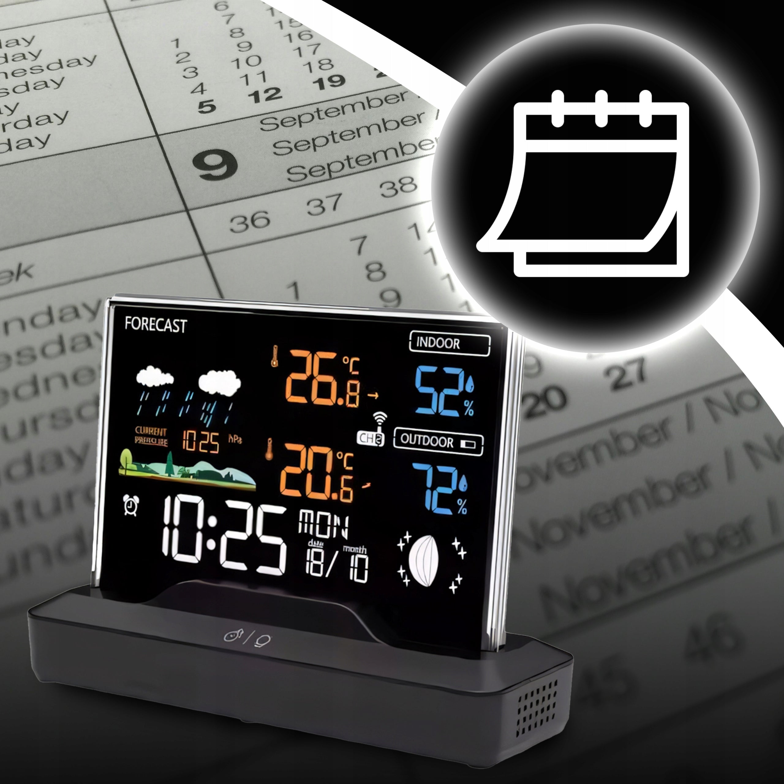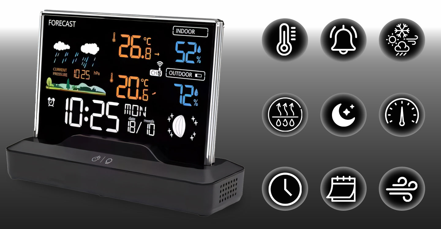 - Daugiafunkcionalumas: Temperatūra, drėgmė, slėgis, orų prognozė, laikrodis, žadintuvas, mėnulio fazės – viskas viename įrenginyje.