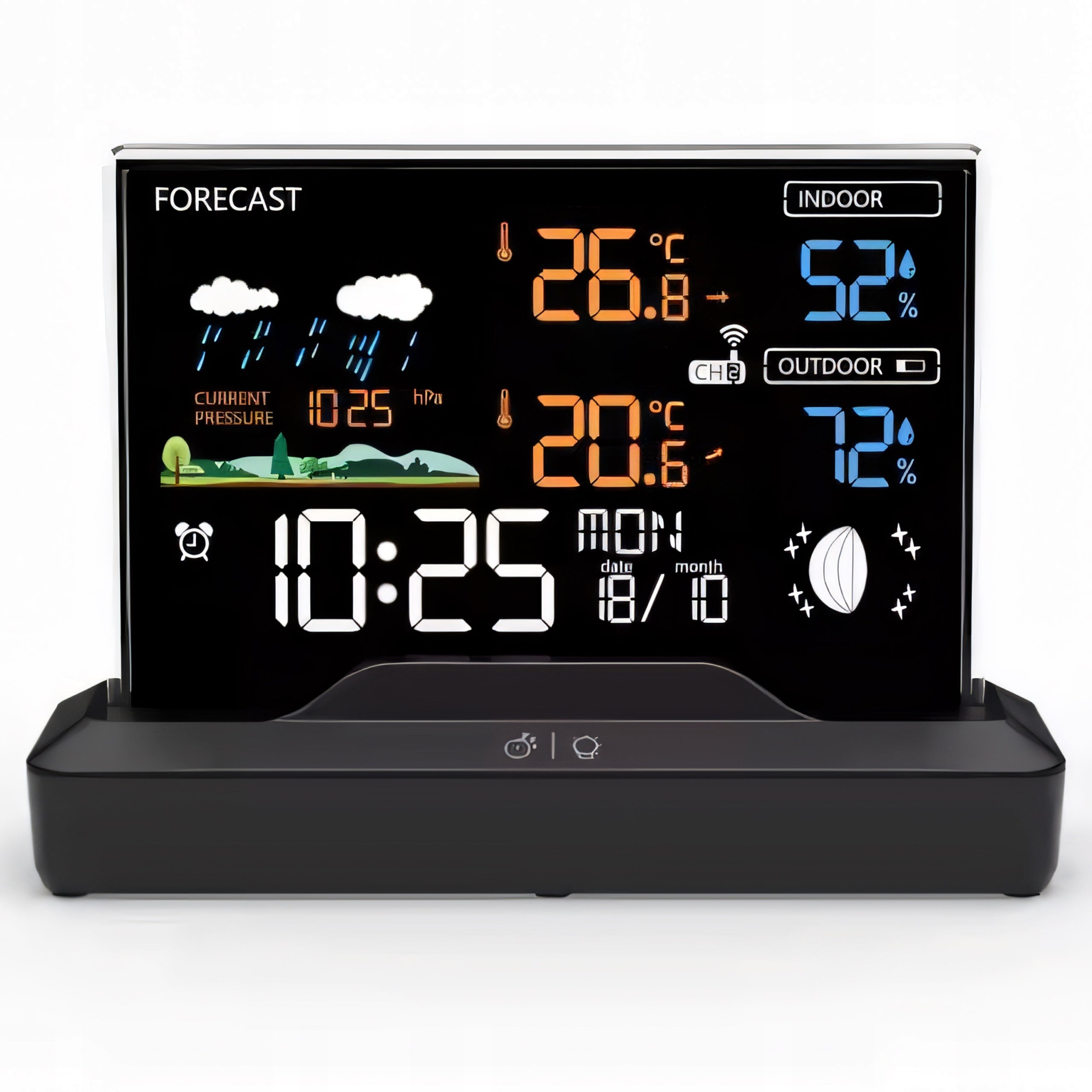 Susipažinkite su pažangiausia belaidžio ryšio orų stotele, kuri taps nepakeičiama Jūsų namų ar biuro dalimi. Šis modernus prietaisas ne tik tiksliai matuoja temperatūrą, drėgmę ir atmosferos slėgį, bet ir teikia orų prognozę bei rodo mėnulio fazes. Dėl didelio ir aiškiai skaitomo LCD ekrano su reguliuojamu apšvietimu, visa reikalinga informacija pasiekiama akimirksniu, net ir esant prastam apšvietimui ar iš didesnio atstumo. Stotis automatiškai sinchronizuoja laiką su DCF signalu, todėl visada turėsite tikslų laiką ir datą.