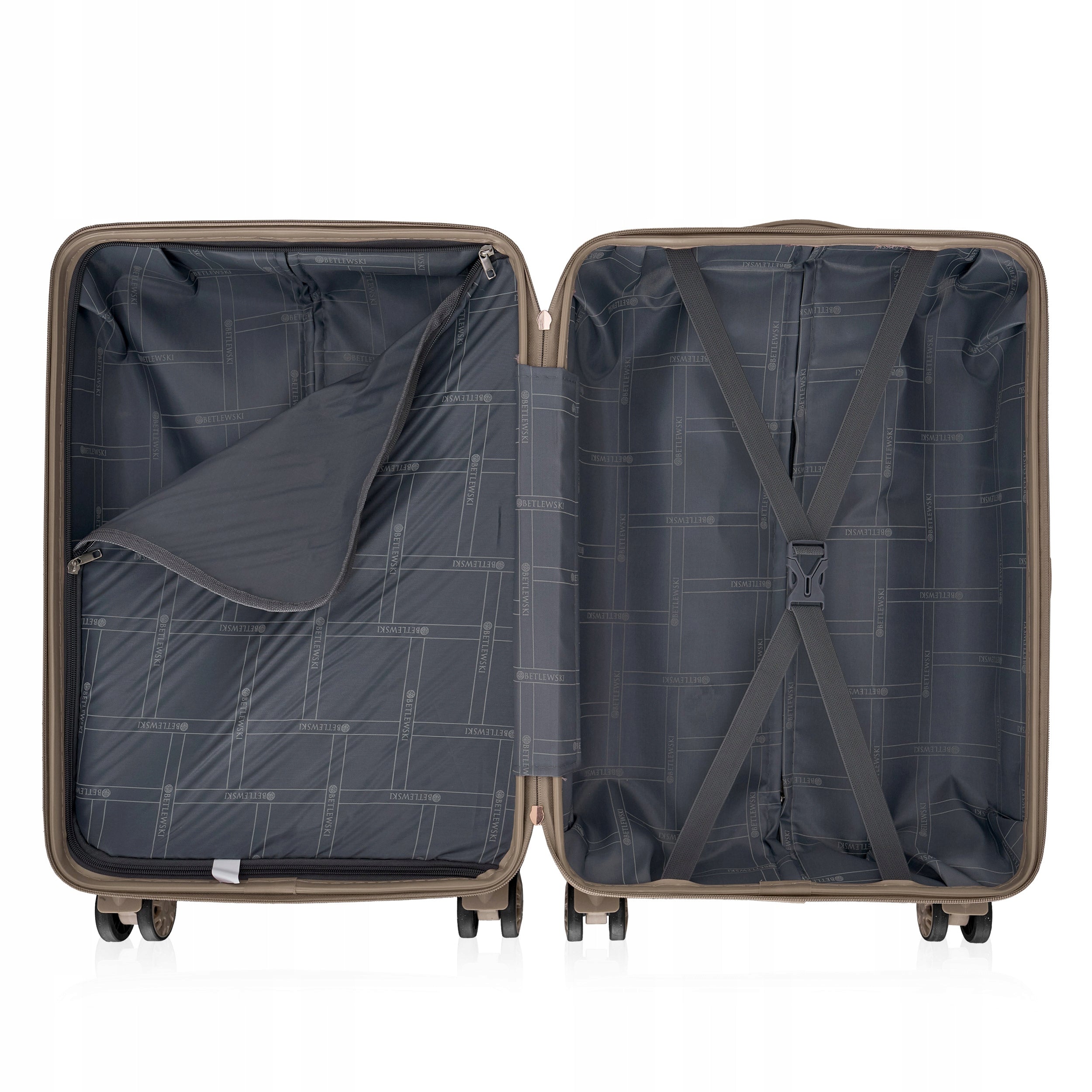 Vidinis lagamino dizainas apgalvotas iki smulkiausių detalių, siekiant užtikrinti Jūsų daiktų tvarkingumą ir saugumą. Lagamino viduje rasite elegantišką, tvirtą poliesterio pamušalą su Betlewski logotipu. Pagrindinis skyrius susideda iš dviejų dalių, kurias atskiria užtraukiama pertvara, leidžianti efektyviai suskirstyti Jūsų daiktus. Elastingi, reguliuojami diržai padeda tvirtai pritvirtinti bagažą, apsaugant jį nuo sujudimo kelionės metu. Taip pat yra papildomas skyrius su užtrauktuku, skirtas smulkesniems daiktams laikyti.