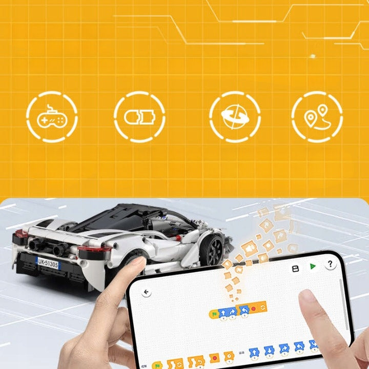 - Pilnai sukonstruotas nuotoliniu būdu valdomas sportinis automobilis.