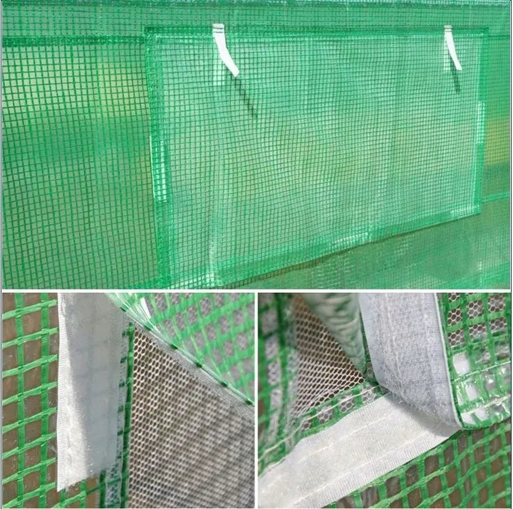 - Žalia PE plėvelė su užtraukiamu įėjimu ir 6 vėdinimo langais