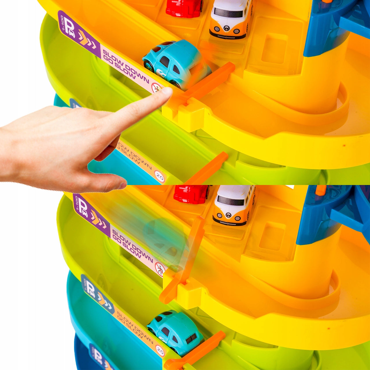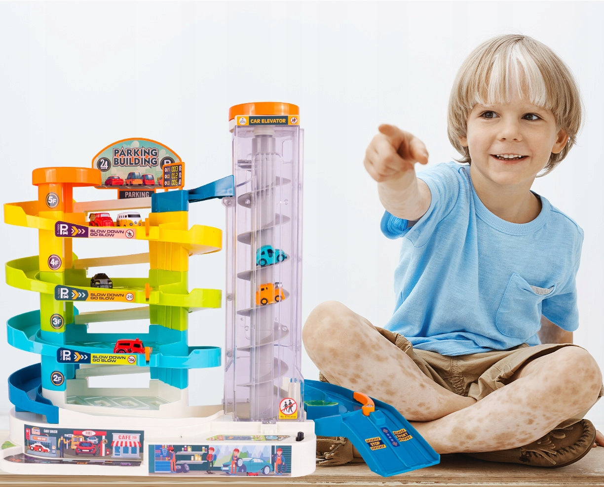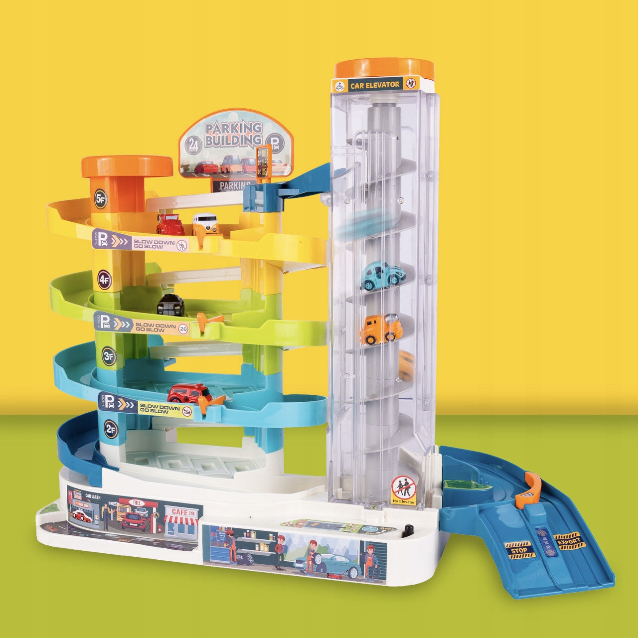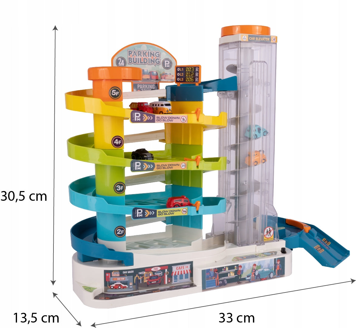 Šis parkingas – tai ne tik vieta automobiliams statyti, bet ir visa žaidimų aikštelė. Rankomis valdoma ar elektrinė automobilio vynas leidžia lengvai perkelti automobiliukus į aukščiausią lankytiną vietą. Nuo ten prasideda adrenalino kupini nuotykiai – automobiliukai leidžiasi sraigtasparnio formos rampomis, apsisuka aplink visą parkingą ir vėl grįžta į vyną arba išvažiuoja į lauką. Galimybė kontroliuoti eismą su šlagbaumais suteikia papildomo realistiškumo ir leidžia vaikui pajusti tikro parkingo prižiūrėtojo ar lenktynininko vaidmenį. Šis žaislas garantuoja, kad nuoboduliui tikrai nebus vietos!