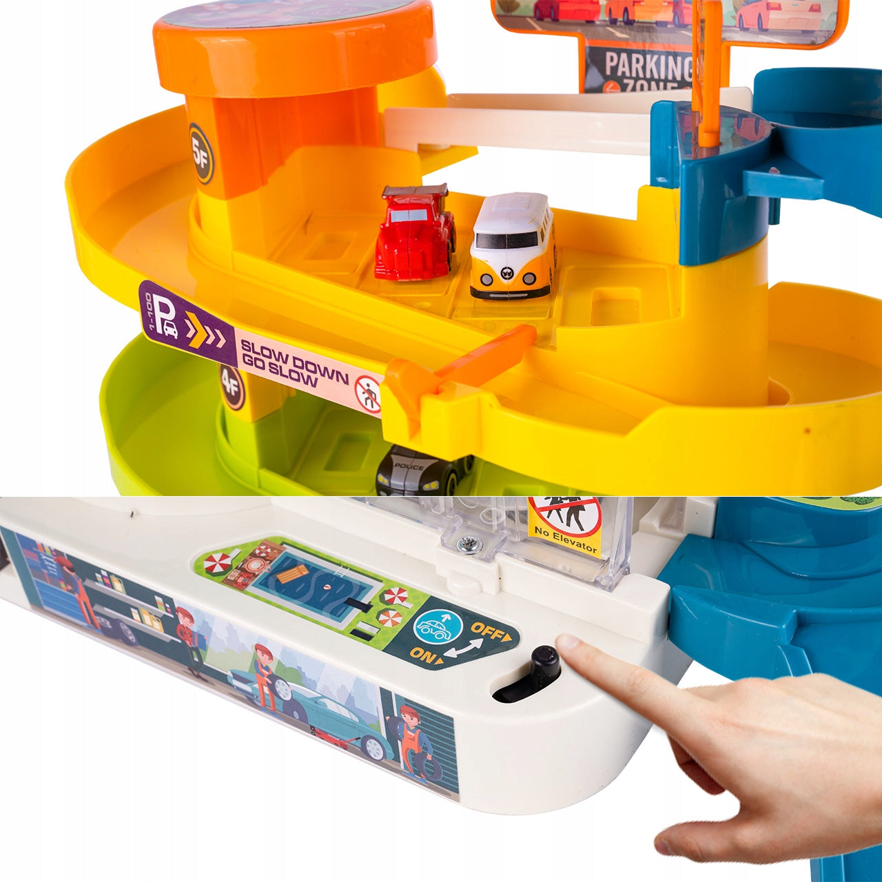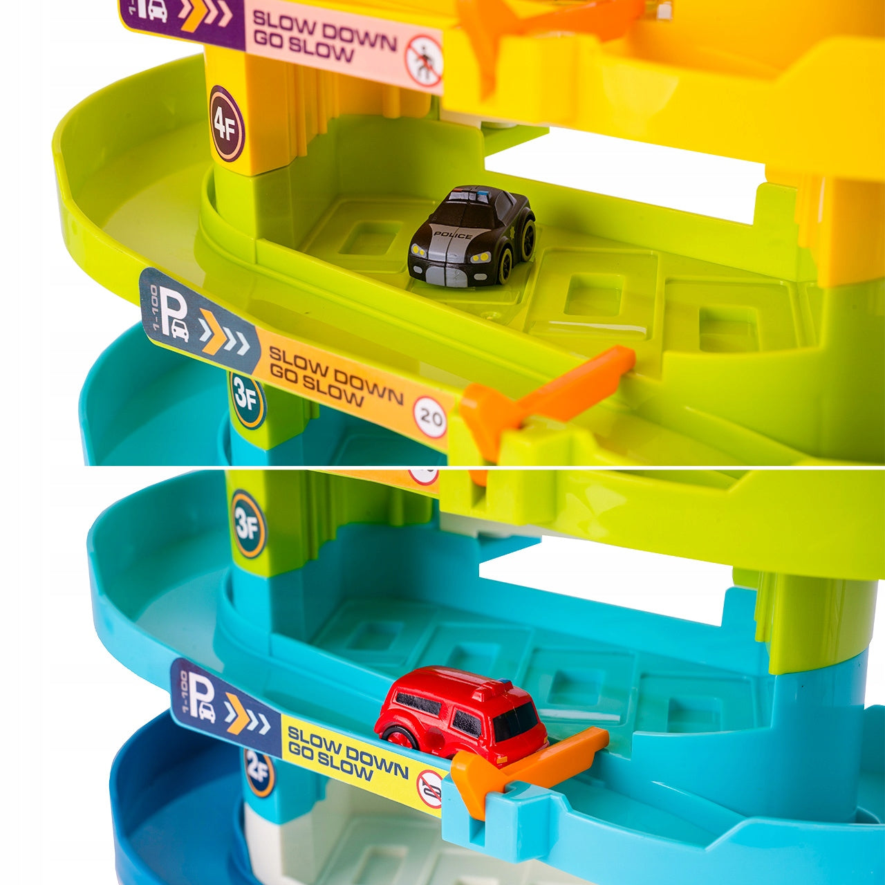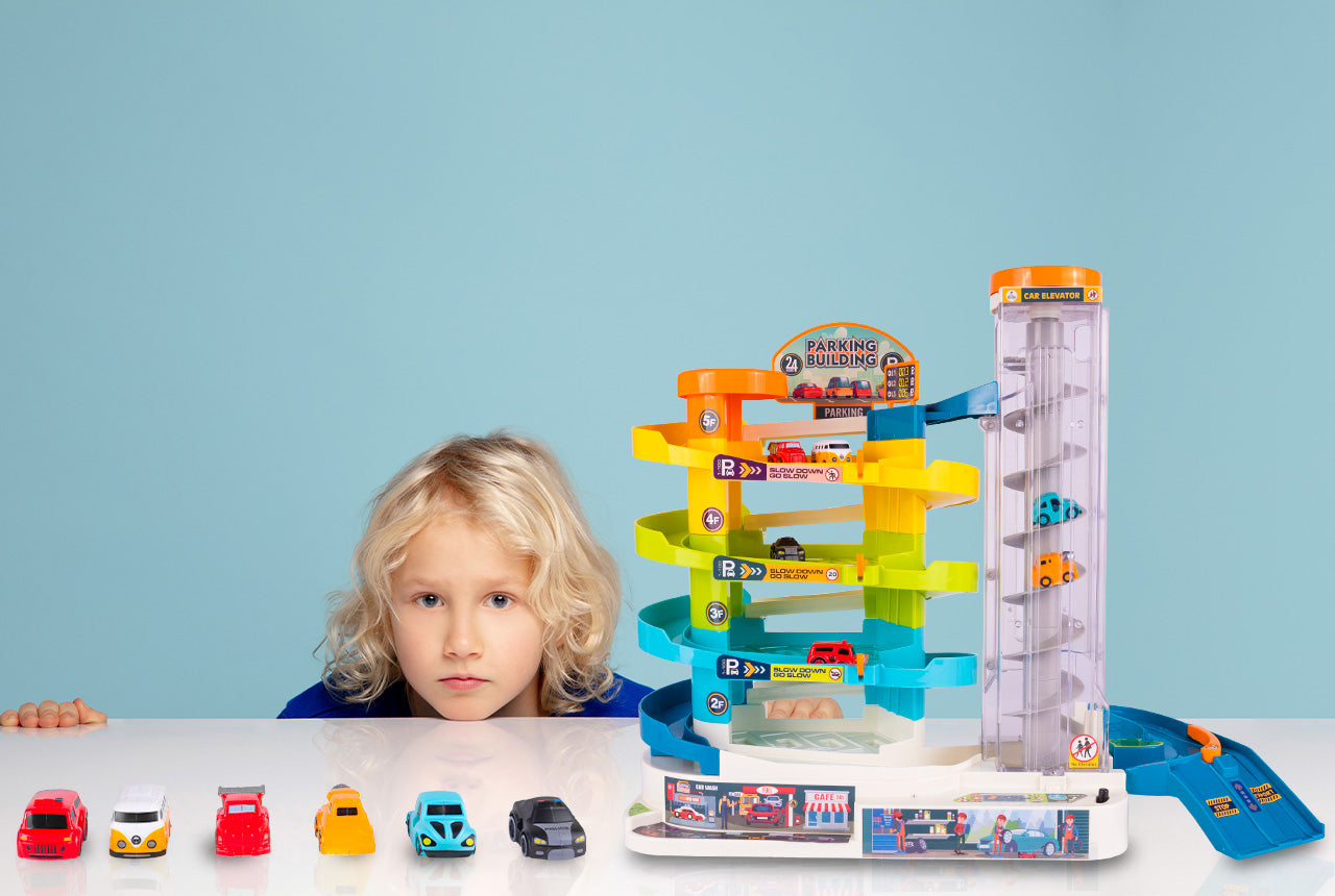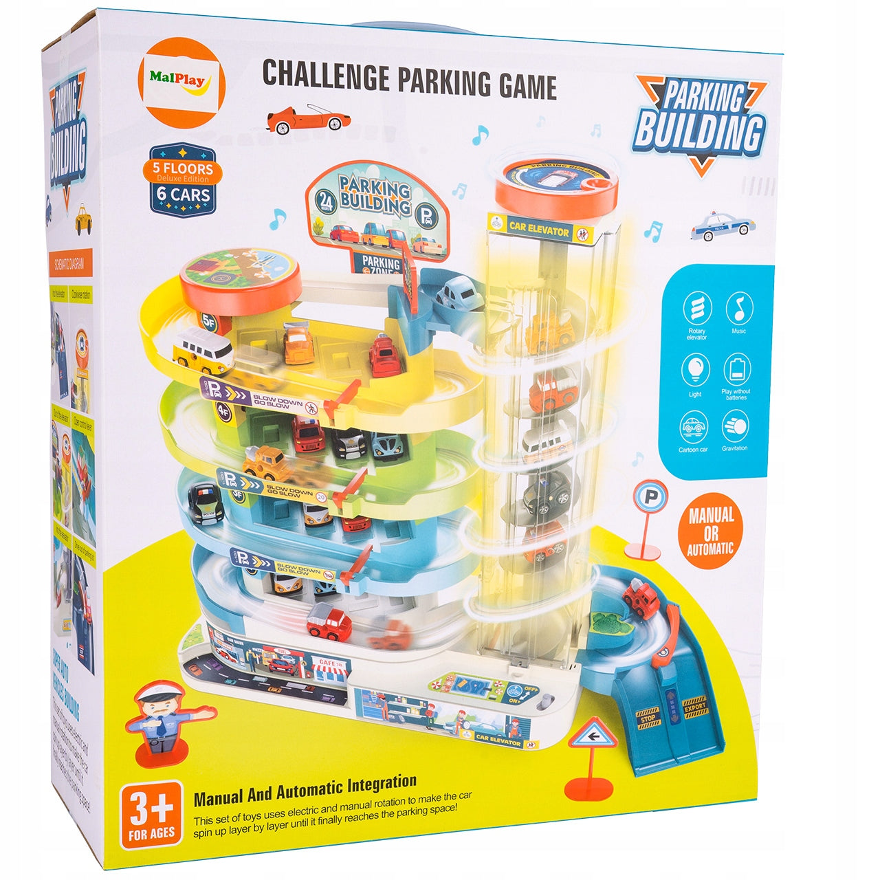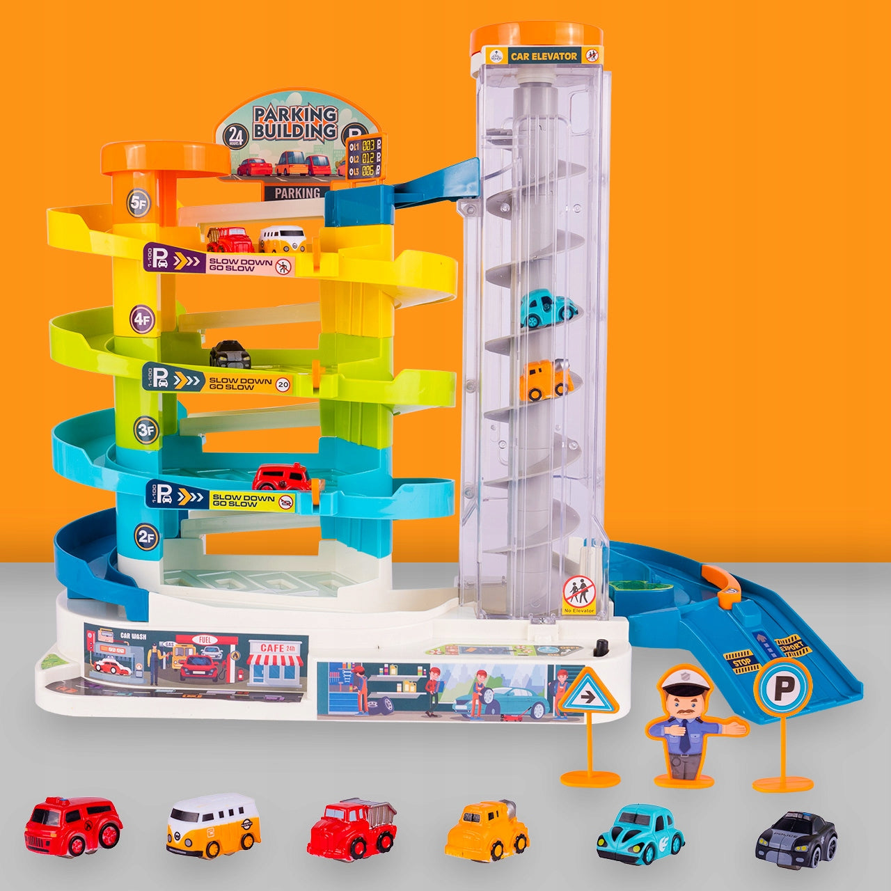 Šis parkingas – tai ne tik vieta automobiliams statyti, bet ir visa žaidimų aikštelė. Rankomis valdoma ar elektrinė automobilio vynas leidžia lengvai perkelti automobiliukus į aukščiausią lankytiną vietą. Nuo ten prasideda adrenalino kupini nuotykiai – automobiliukai leidžiasi sraigtasparnio formos rampomis, apsisuka aplink visą parkingą ir vėl grįžta į vyną arba išvažiuoja į lauką. Galimybė kontroliuoti eismą su šlagbaumais suteikia papildomo realistiškumo ir leidžia vaikui pajusti tikro parkingo prižiūrėtojo ar lenktynininko vaidmenį. Šis žaislas garantuoja, kad nuoboduliui tikrai nebus vietos!