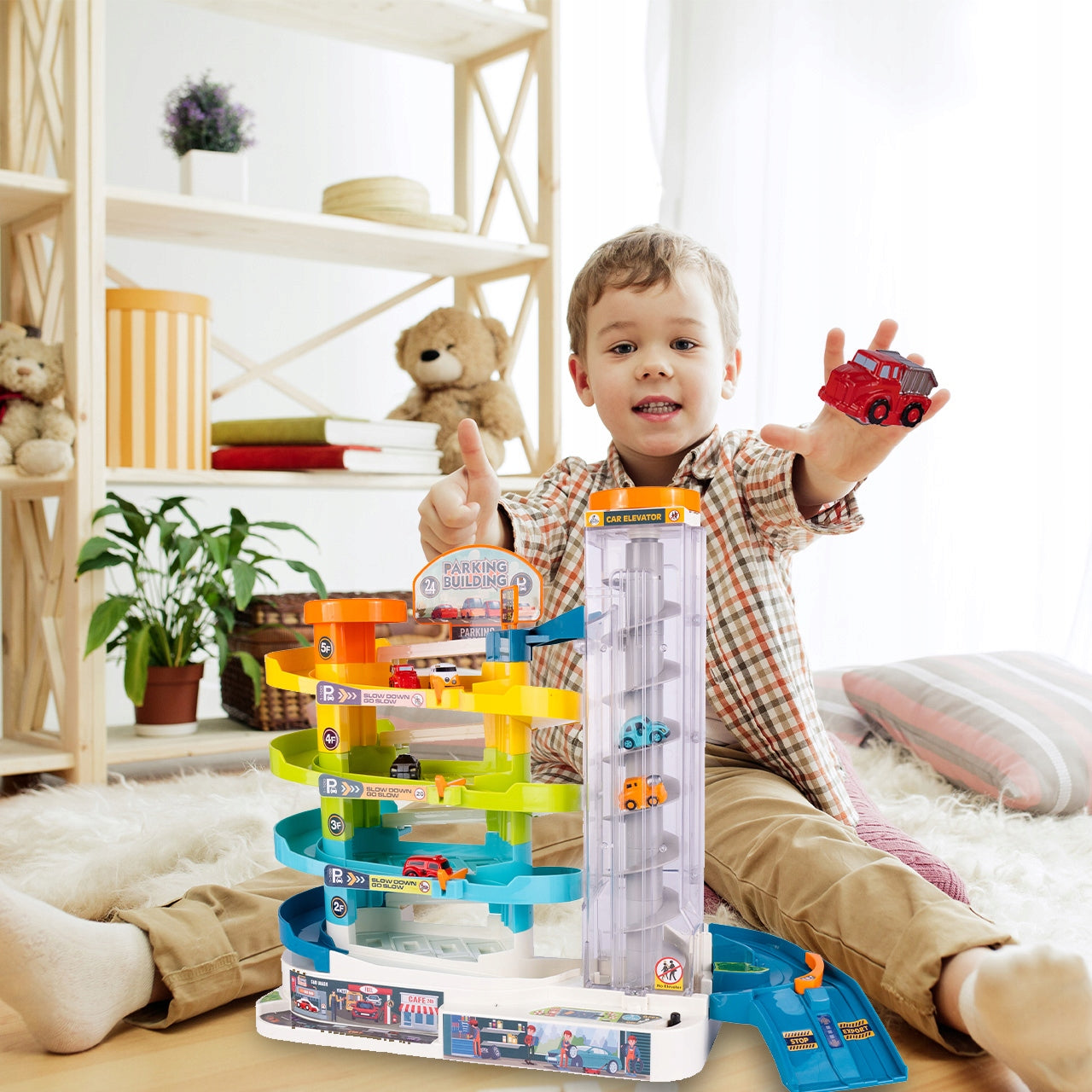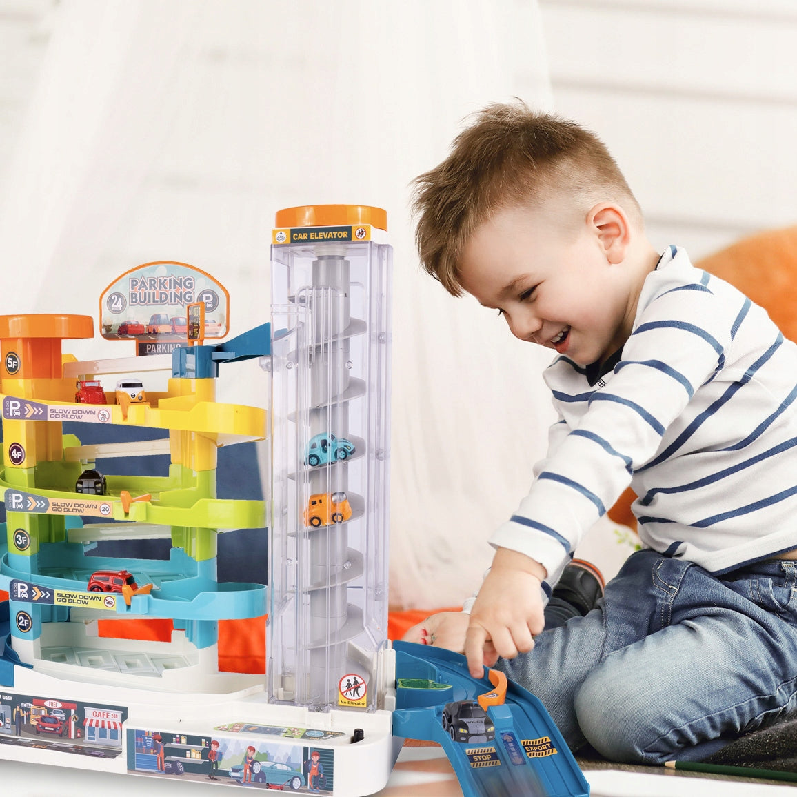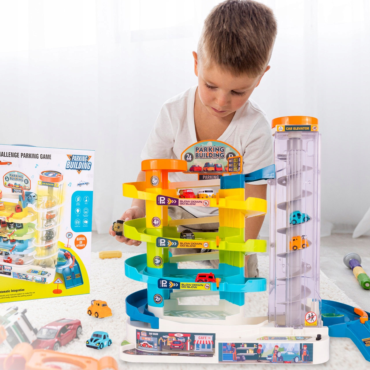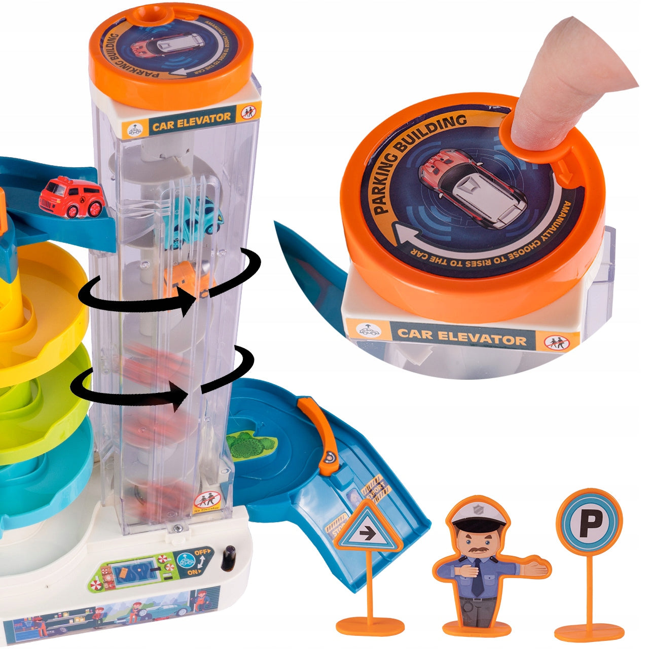 Šis parkingas – tai ne tik vieta automobiliams statyti, bet ir visa žaidimų aikštelė. Rankomis valdoma ar elektrinė automobilio vynas leidžia lengvai perkelti automobiliukus į aukščiausią lankytiną vietą. Nuo ten prasideda adrenalino kupini nuotykiai – automobiliukai leidžiasi sraigtasparnio formos rampomis, apsisuka aplink visą parkingą ir vėl grįžta į vyną arba išvažiuoja į lauką. Galimybė kontroliuoti eismą su šlagbaumais suteikia papildomo realistiškumo ir leidžia vaikui pajusti tikro parkingo prižiūrėtojo ar lenktynininko vaidmenį. Šis žaislas garantuoja, kad nuoboduliui tikrai nebus vietos!