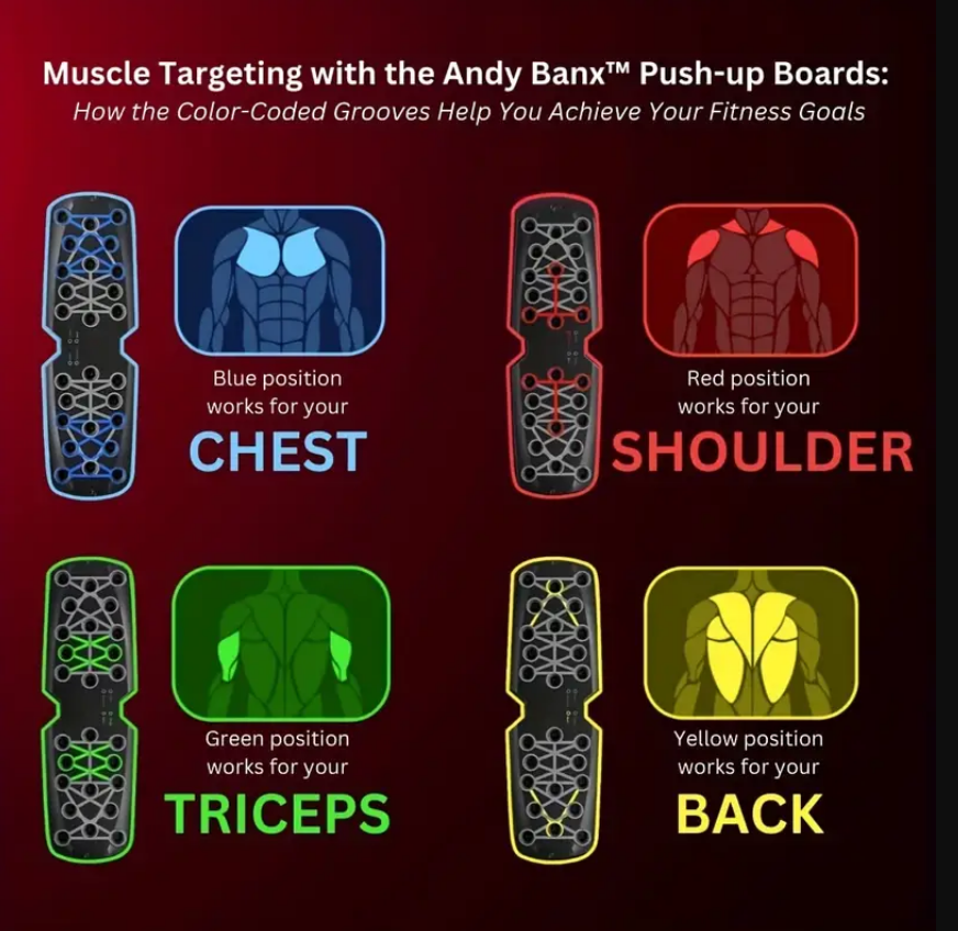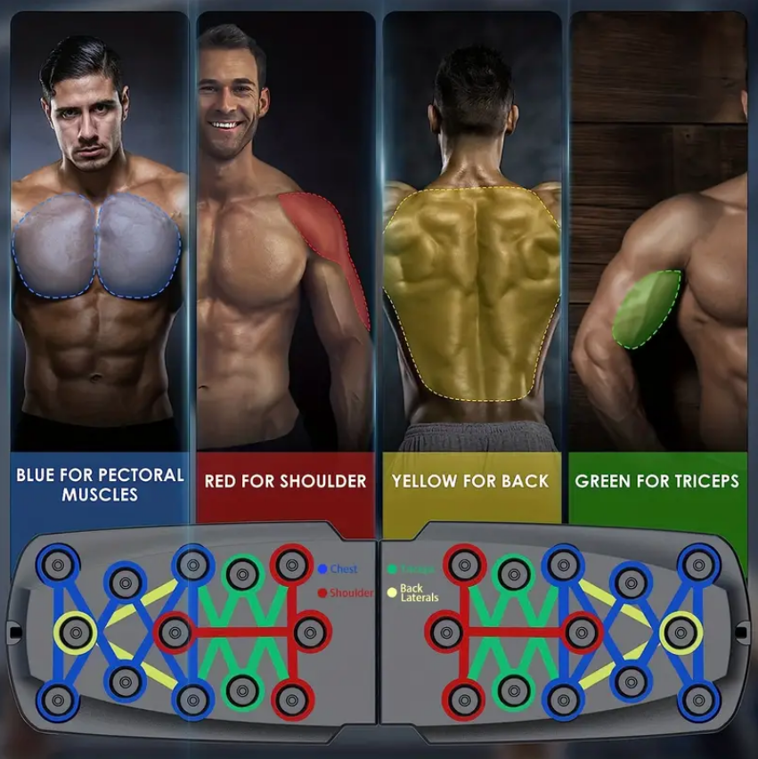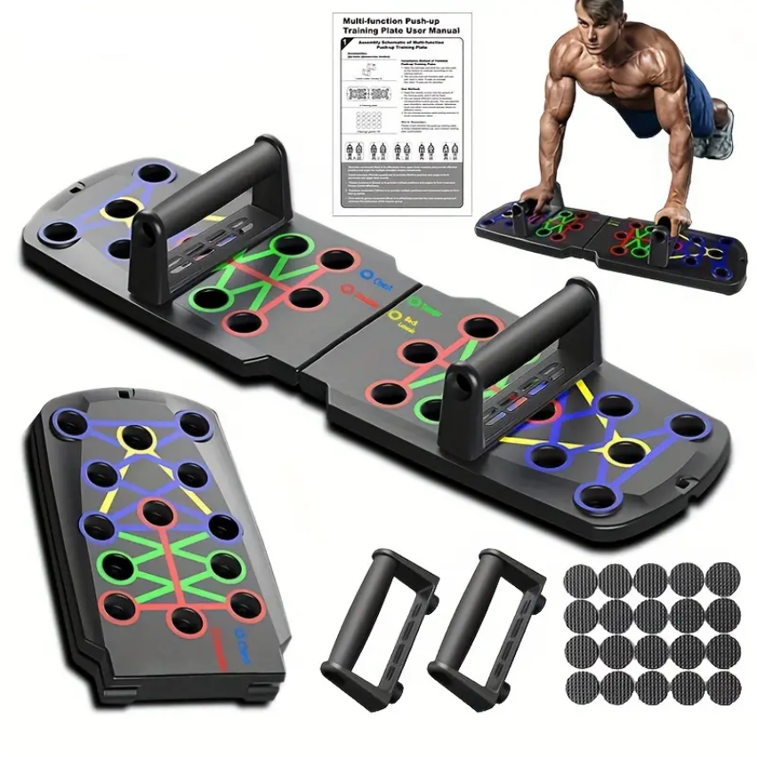 Daugiafunkcinė sulankstoma atsispaudimų lenta, skirta treniruotėms namuose ir sporto salėje – ugdykite stiprius krūtinės, tricepso, nugaros ir pečių raumenis. Pagerinkite bendrą kūno formą. Ant lentos kiekviena spalva yra priskirta konkrečiai raumenų grupei, todėl darydami atsispaudimus žinosite kurie raumenys tuo metu dirba labiausiai.