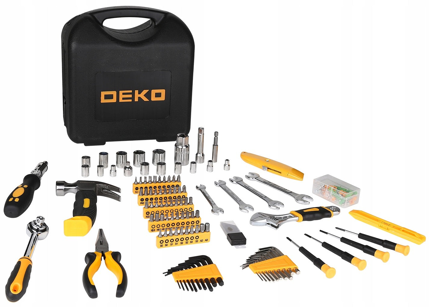 DEKO DKMT165 įrankių rinkinys lagamine 165 vnt. – raktai, terkšlė, atsuktuvai, plaktukas, šešiakampiai