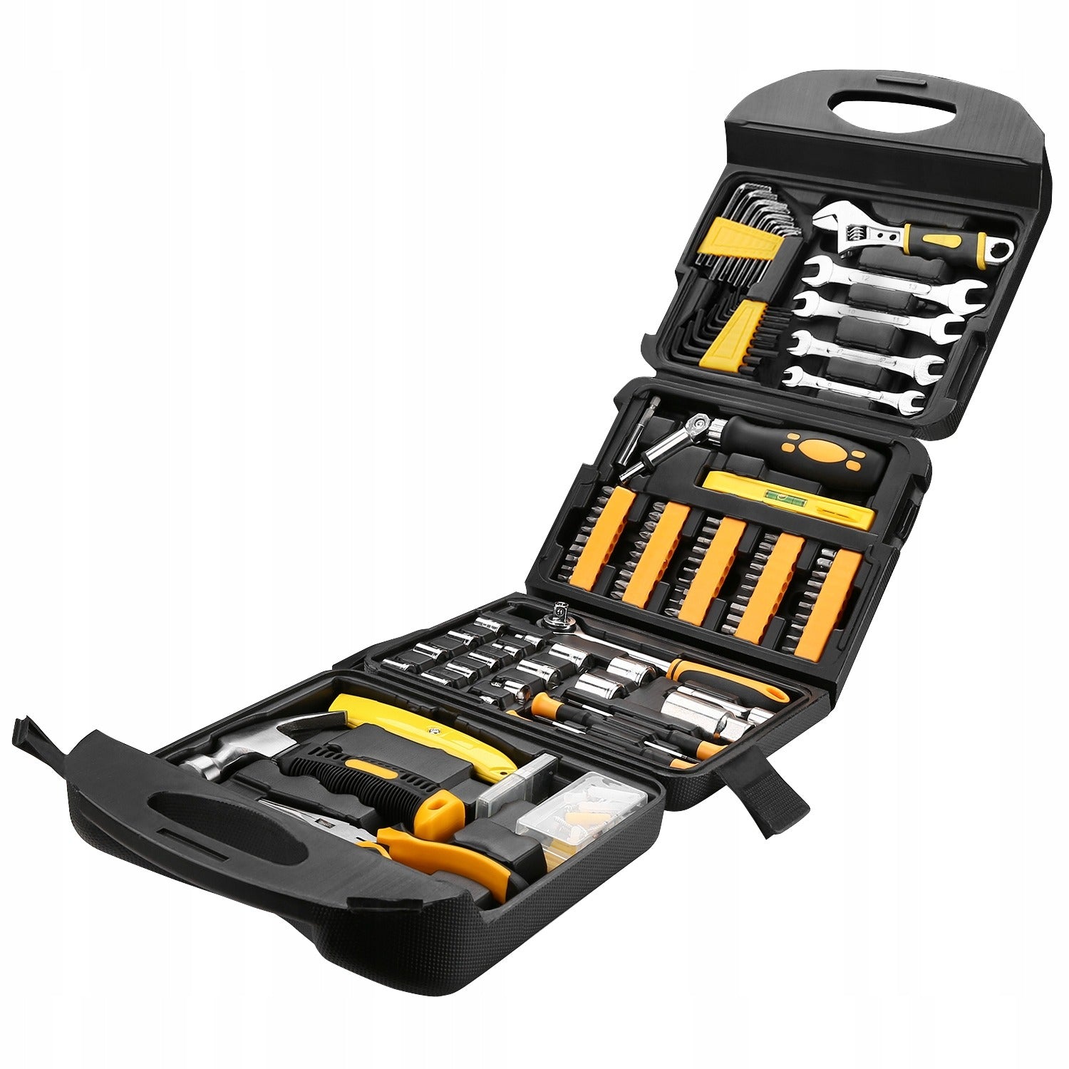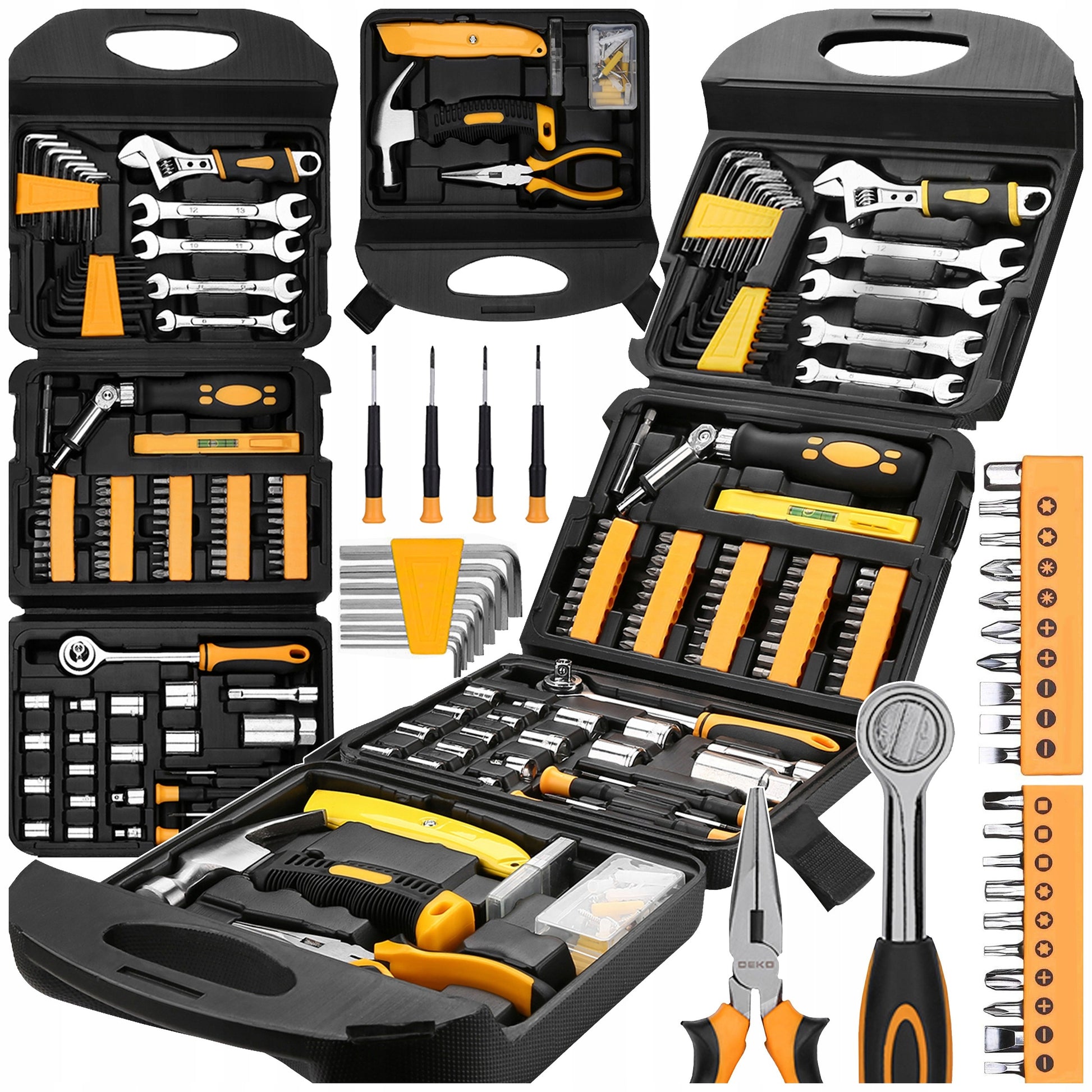 - Į komplektą įeina: plaktukas, terkšlė 3/8", galvutės (1/4" ir 3/8"), žvakės galvutė, antgaliai (50 vnt.), atsuktuvai, presiziniai atsuktuvai, peilis su papildomais ašmenimis, lygis, universalinės replės, reguliuojamas raktas, dvigubi atviri raktai, šešiakampiai raktai, prailgintuvai, magnetinis laikiklis ir kt.