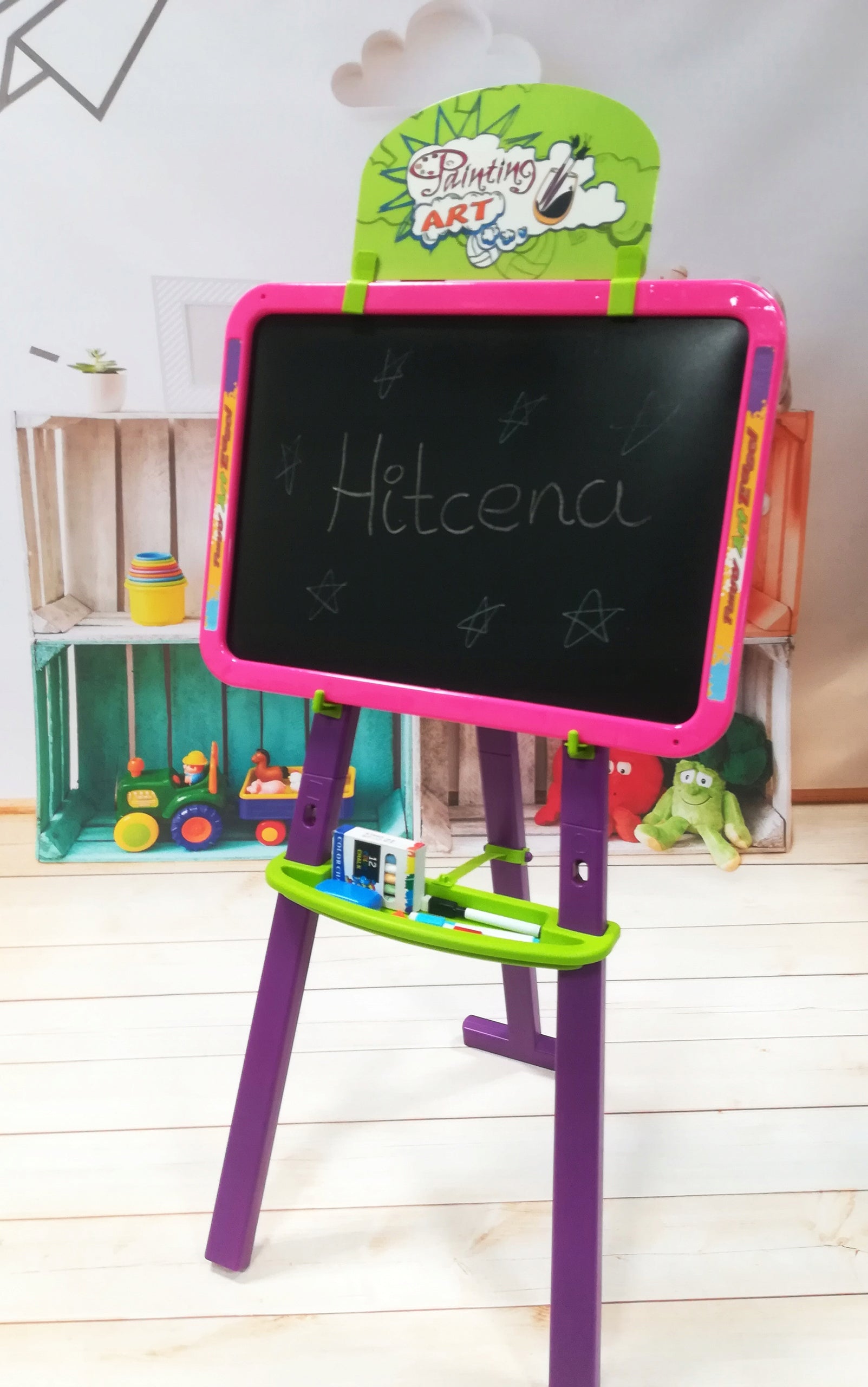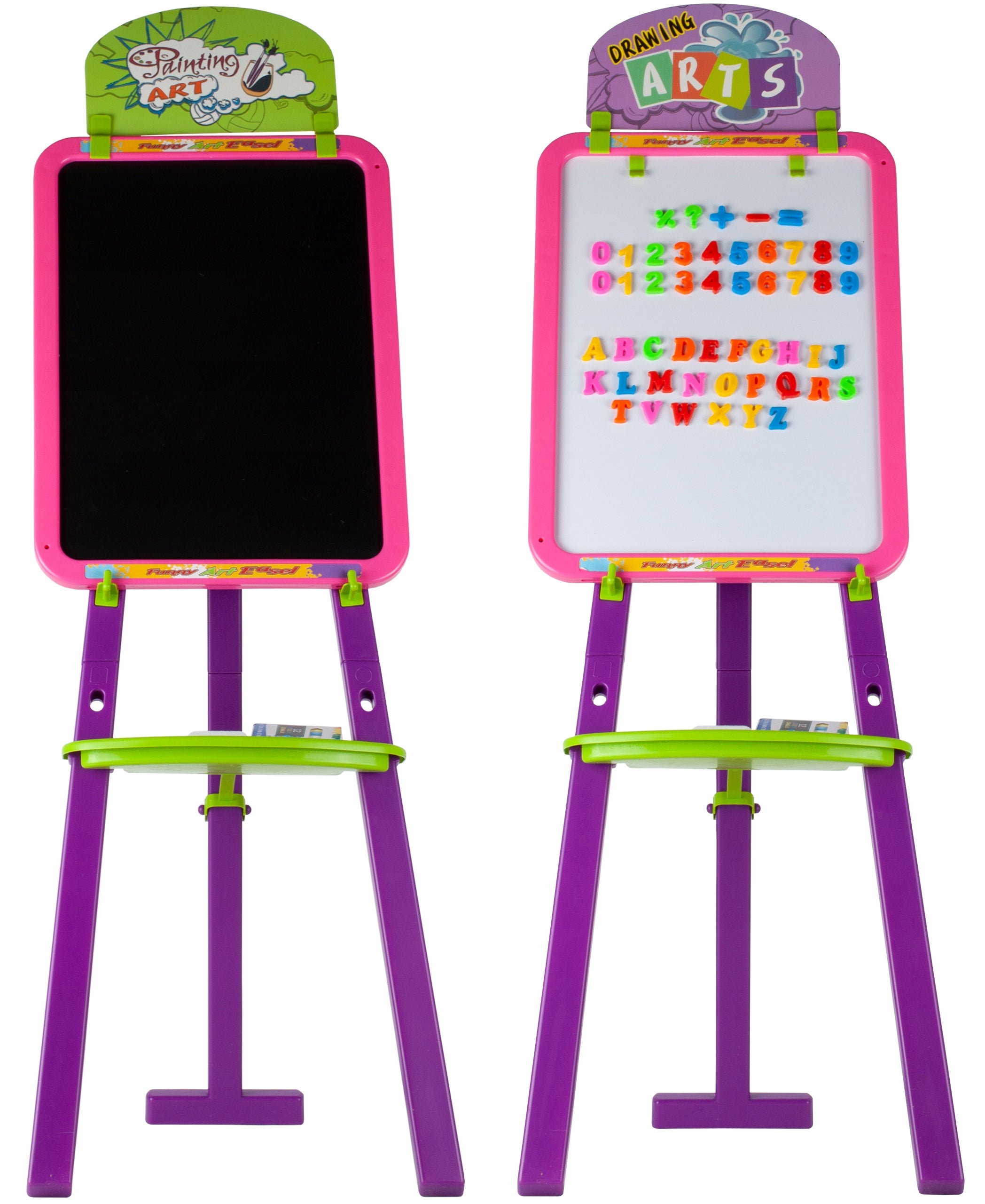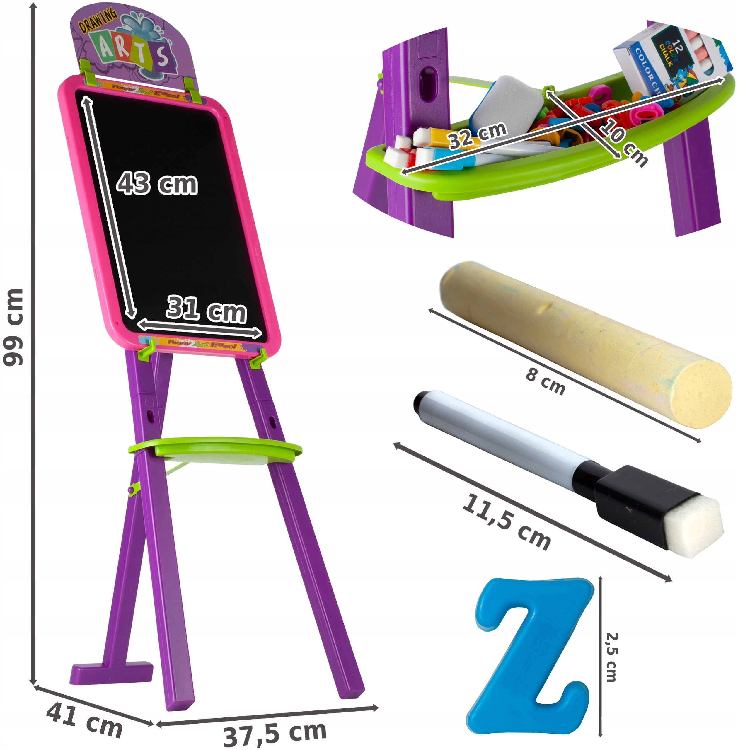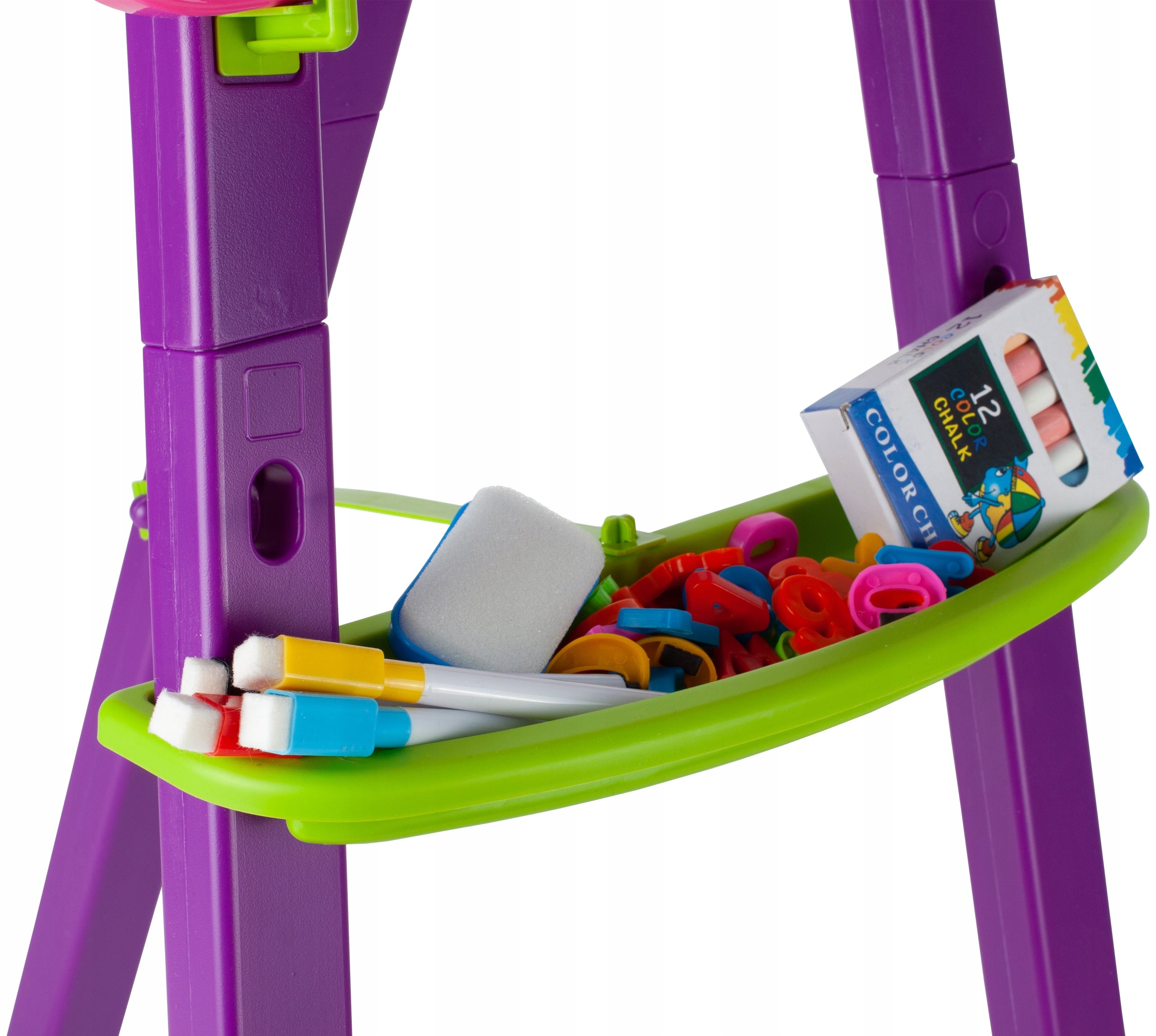 Ši didelė, universali magnetinė lenta yra puikus pasirinkimas jūsų vaikams, skatinantis kūrybiškumą ir mokymąsi per žaidimą. Tai ne tik erdvė piešti ir rašyti, bet ir edukacinis žaislas, turintis dvipusį paviršių: vienoje pusėje galėsite rašyti ir piešti spalvota kreida, o kitoje – sausai valomais markeriais. Dėl reguliuojamo aukščio (2 lygiai) lenta prisitaiko prie vaiko ūgio, užtikrinant patogų naudojimą ilgus metus. Jos kompaktiški matmenys bei tvirtas stovas daro ją stabilia ir saugia naudoti net aktyviausiems mažyliams. Lentos dizainas su ryškiomis spalvomis ir praktiškomis detalėmis pavers ją mėgstamiausia žaidimų ir mokymosi priemone.