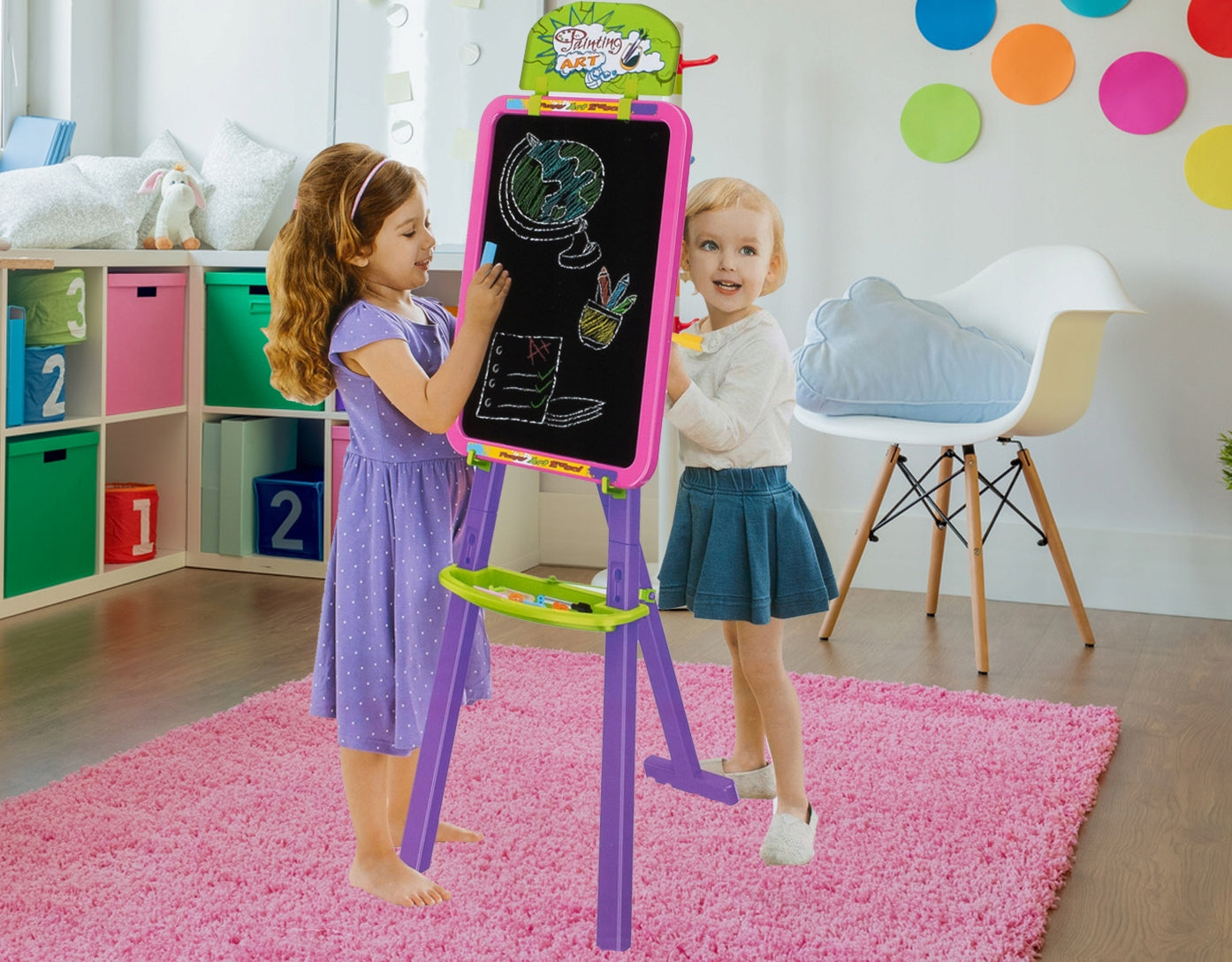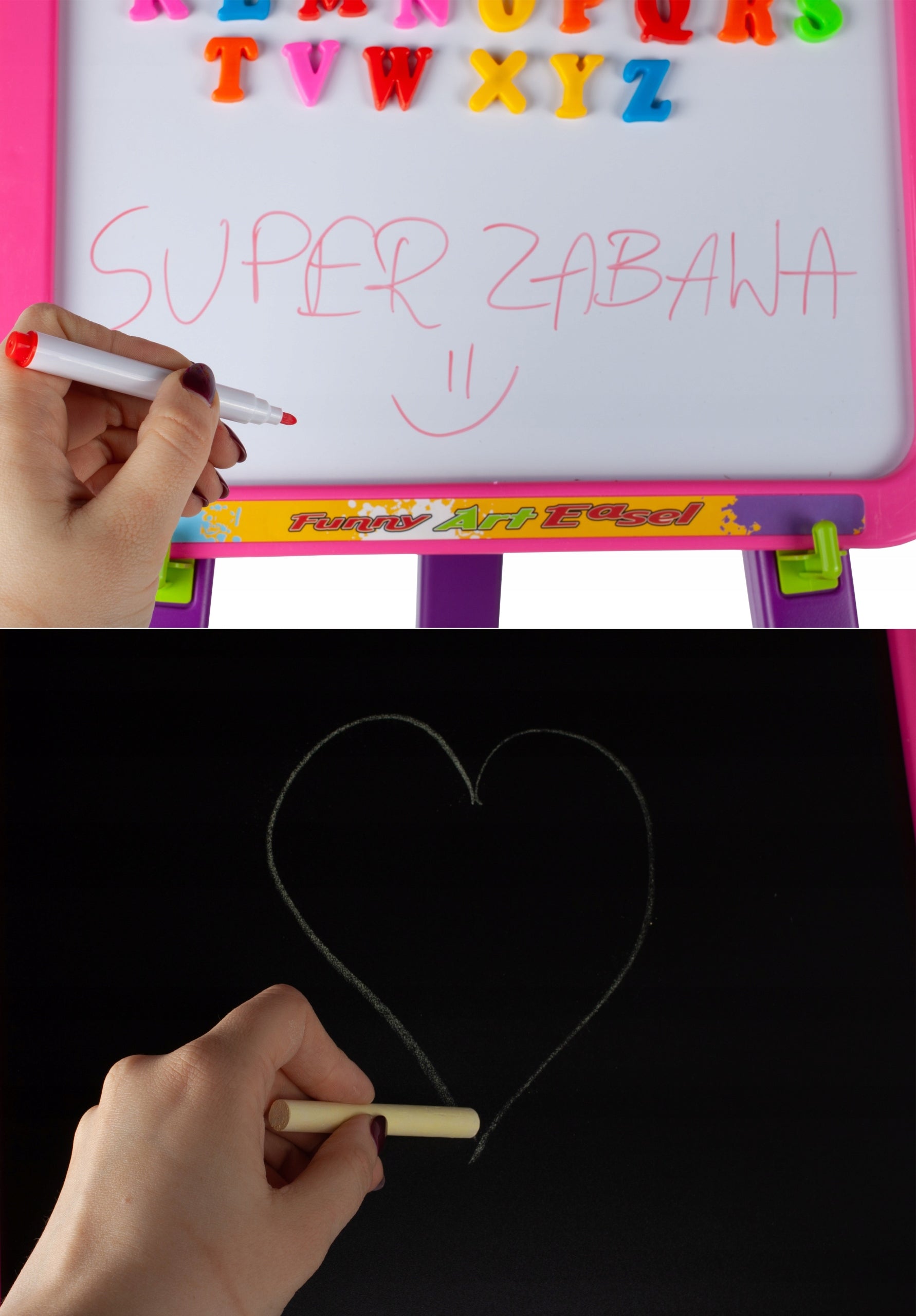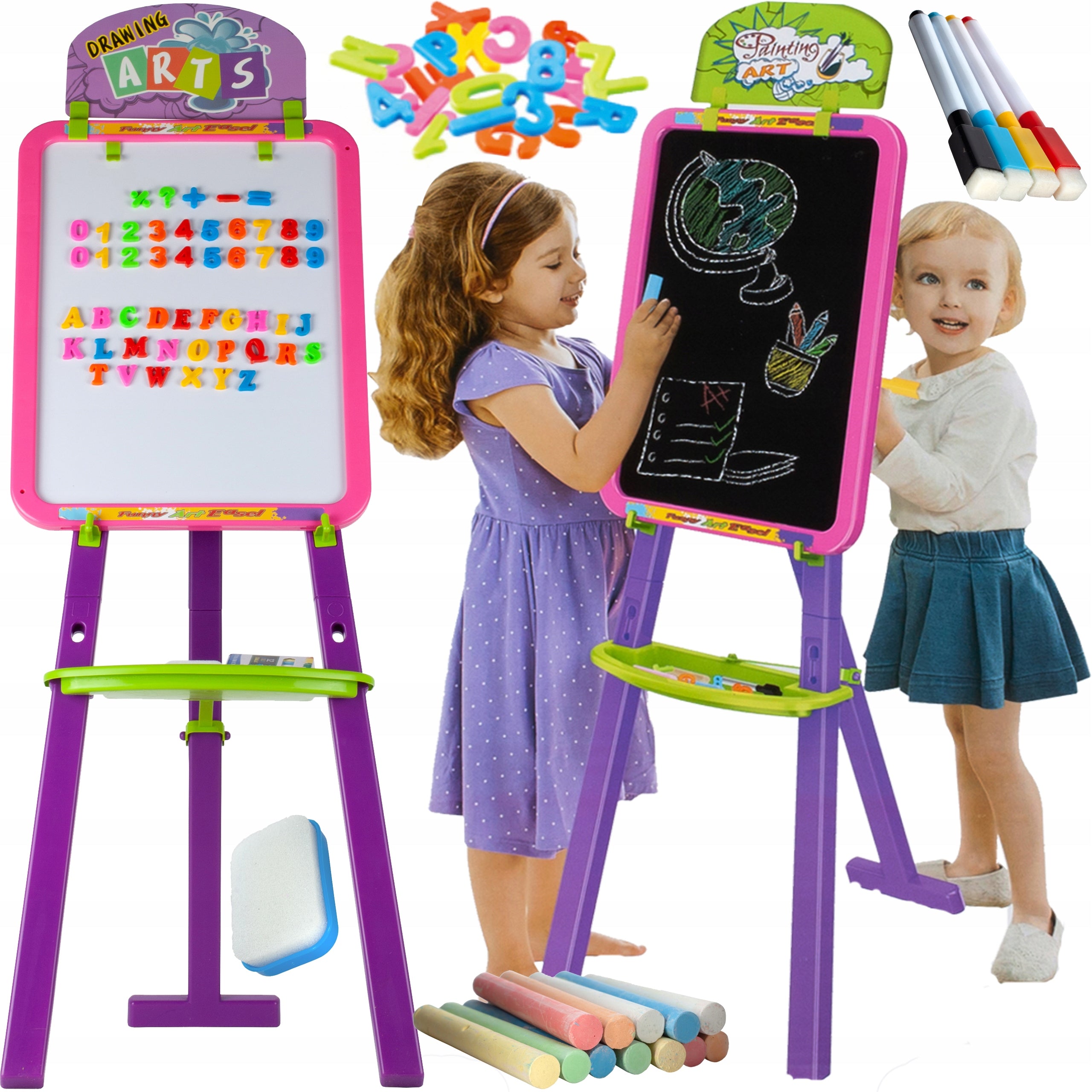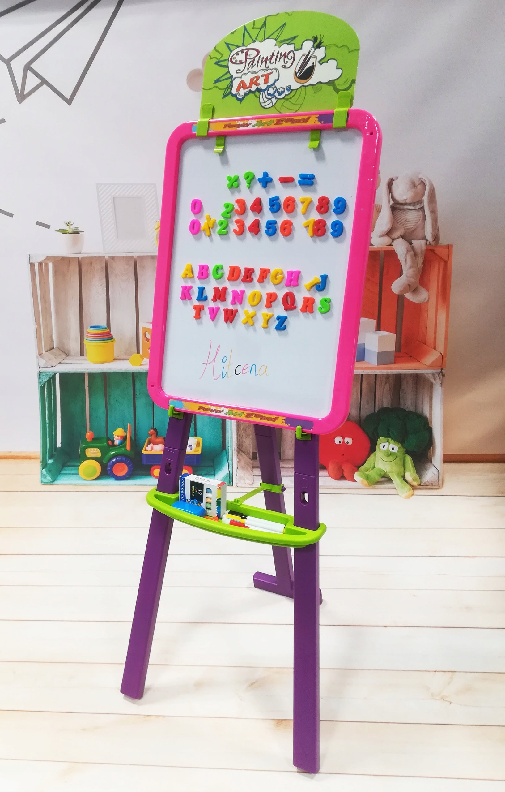 Ši didelė, universali magnetinė lenta yra puikus pasirinkimas jūsų vaikams, skatinantis kūrybiškumą ir mokymąsi per žaidimą. Tai ne tik erdvė piešti ir rašyti, bet ir edukacinis žaislas, turintis dvipusį paviršių: vienoje pusėje galėsite rašyti ir piešti spalvota kreida, o kitoje – sausai valomais markeriais. Dėl reguliuojamo aukščio (2 lygiai) lenta prisitaiko prie vaiko ūgio, užtikrinant patogų naudojimą ilgus metus. Jos kompaktiški matmenys bei tvirtas stovas daro ją stabilia ir saugia naudoti net aktyviausiems mažyliams. Lentos dizainas su ryškiomis spalvomis ir praktiškomis detalėmis pavers ją mėgstamiausia žaidimų ir mokymosi priemone.
