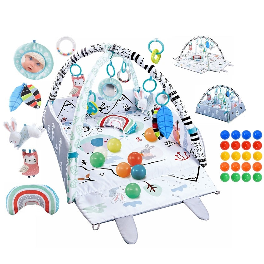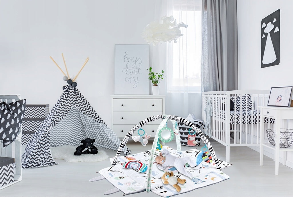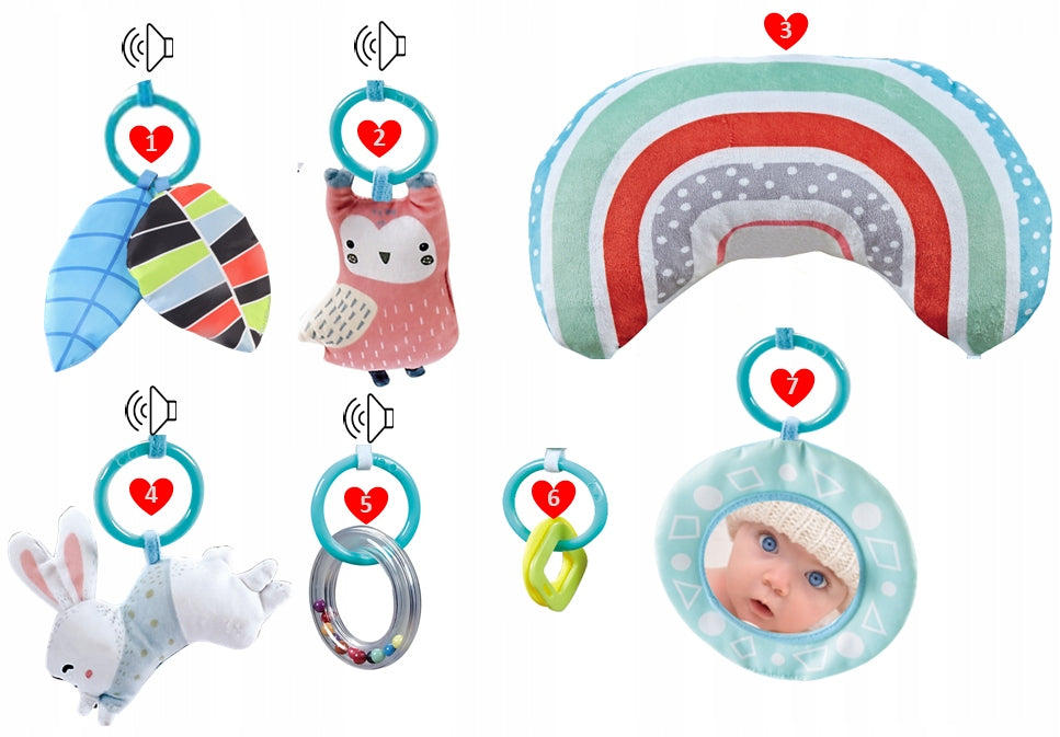 - Interaktyvūs žaislai: komplekte yra 7 žaislai, įskaitant garsinius ir tekstūrinius elementus.