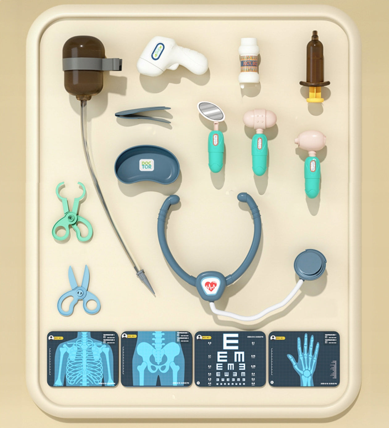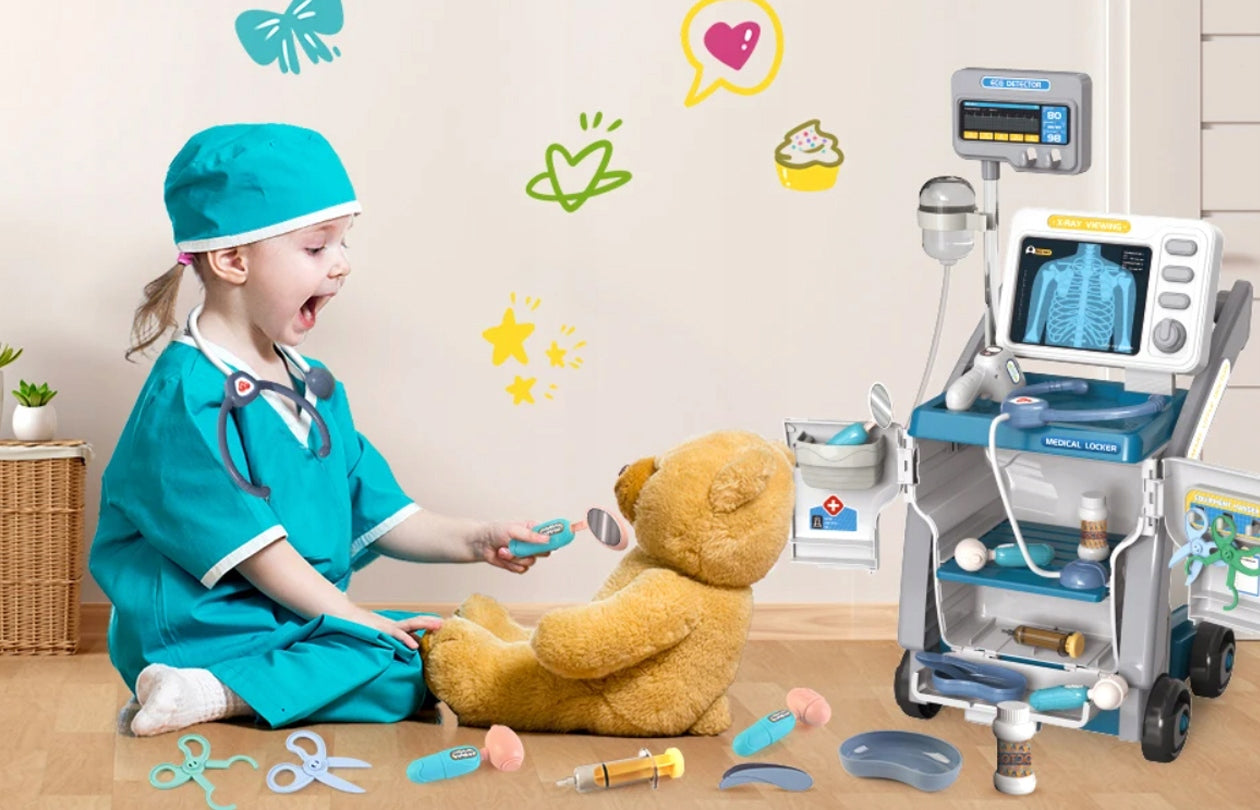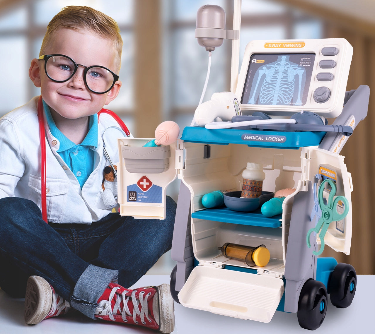 Šis išsamus medicininis rinkinys sukurtas atsižvelgiant į visas vaikų žaidimo ir mokymosi reikmes. Jis apima viską, ko reikia, kad vaikai galėtų pajusti tikrą gydytojo patirtį. Visos priemonės patogiai sutalpinamos ant specialaus vežimėlio, kurį vaikas gali lengvai transportuoti. Aiškiai suprasdami, ką sudaro jų „darbo vieta“, vaikai mokosi organizuoti ir prižiūrėti savo žaislus.