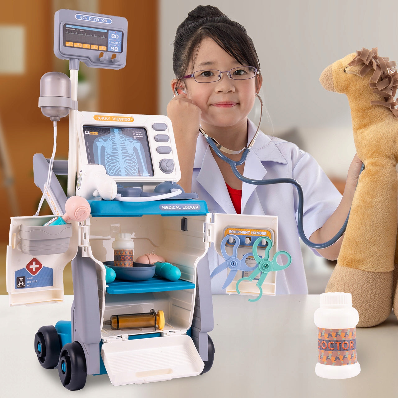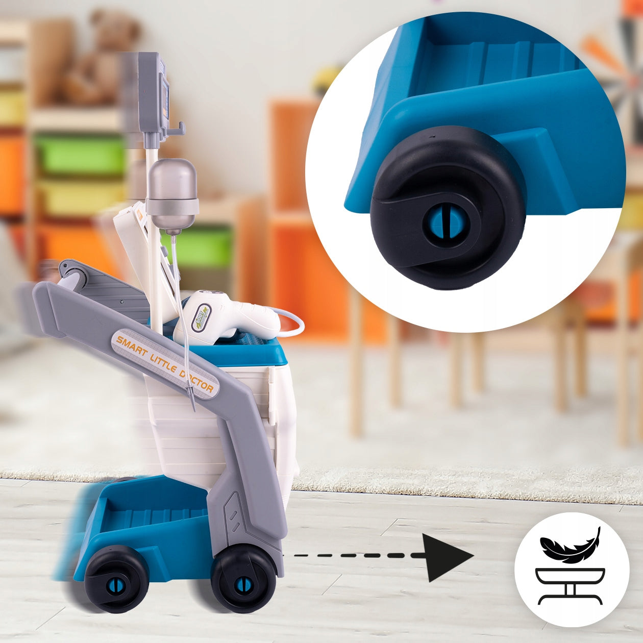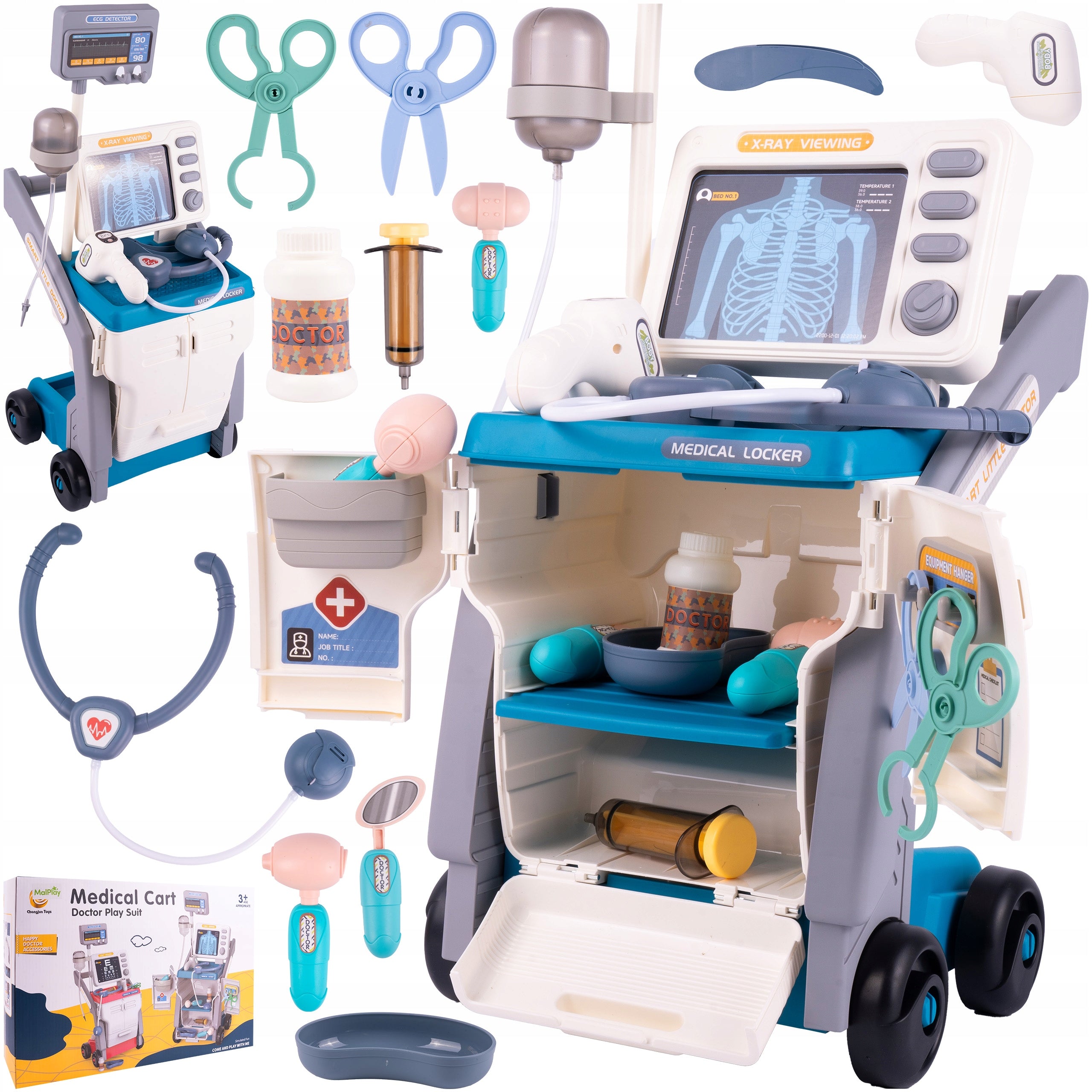 Šis išsamus medicininis rinkinys sukurtas atsižvelgiant į visas vaikų žaidimo ir mokymosi reikmes. Jis apima viską, ko reikia, kad vaikai galėtų pajusti tikrą gydytojo patirtį. Visos priemonės patogiai sutalpinamos ant specialaus vežimėlio, kurį vaikas gali lengvai transportuoti. Aiškiai suprasdami, ką sudaro jų „darbo vieta“, vaikai mokosi organizuoti ir prižiūrėti savo žaislus.
