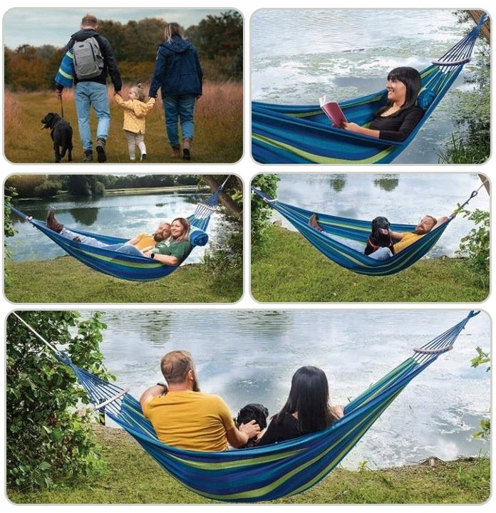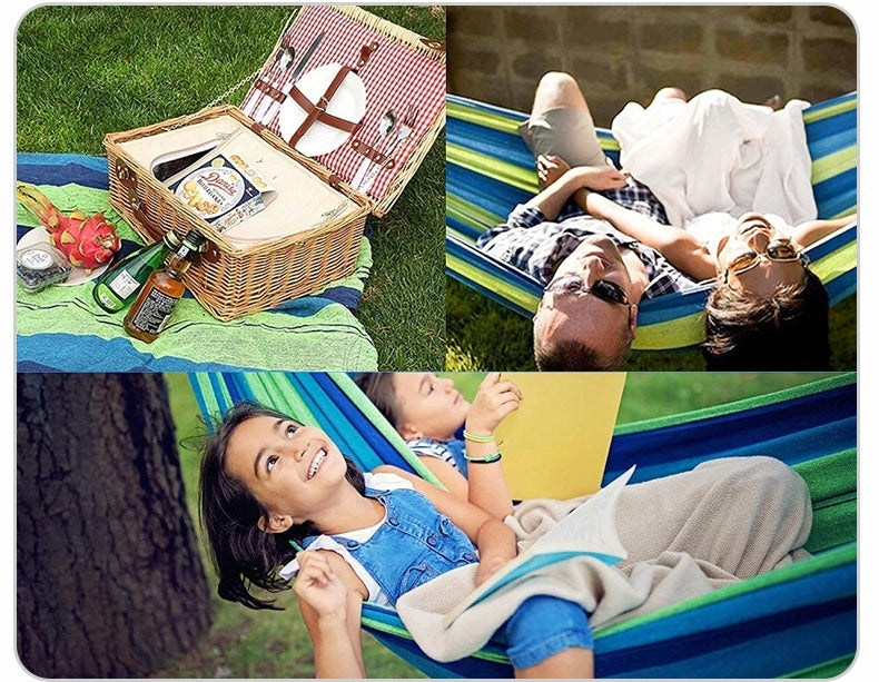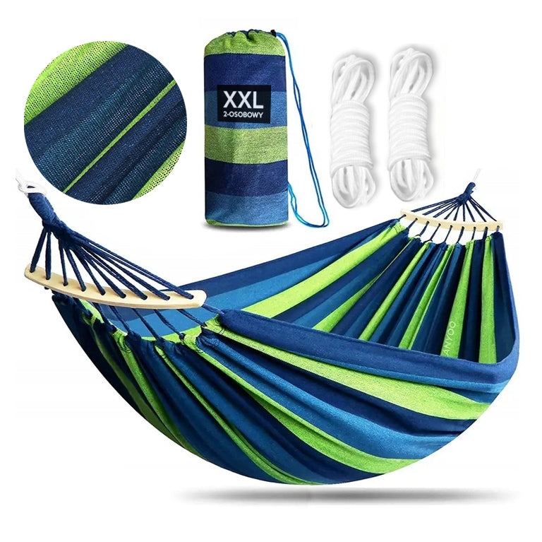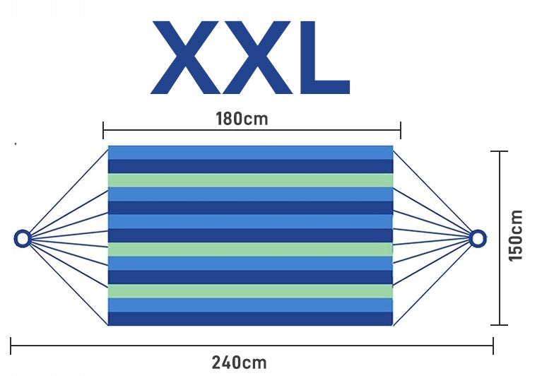Didelis hamakas dviems išlaikantis iki 200KG. Hamako ilgis 240cm ir plotis 150cm.