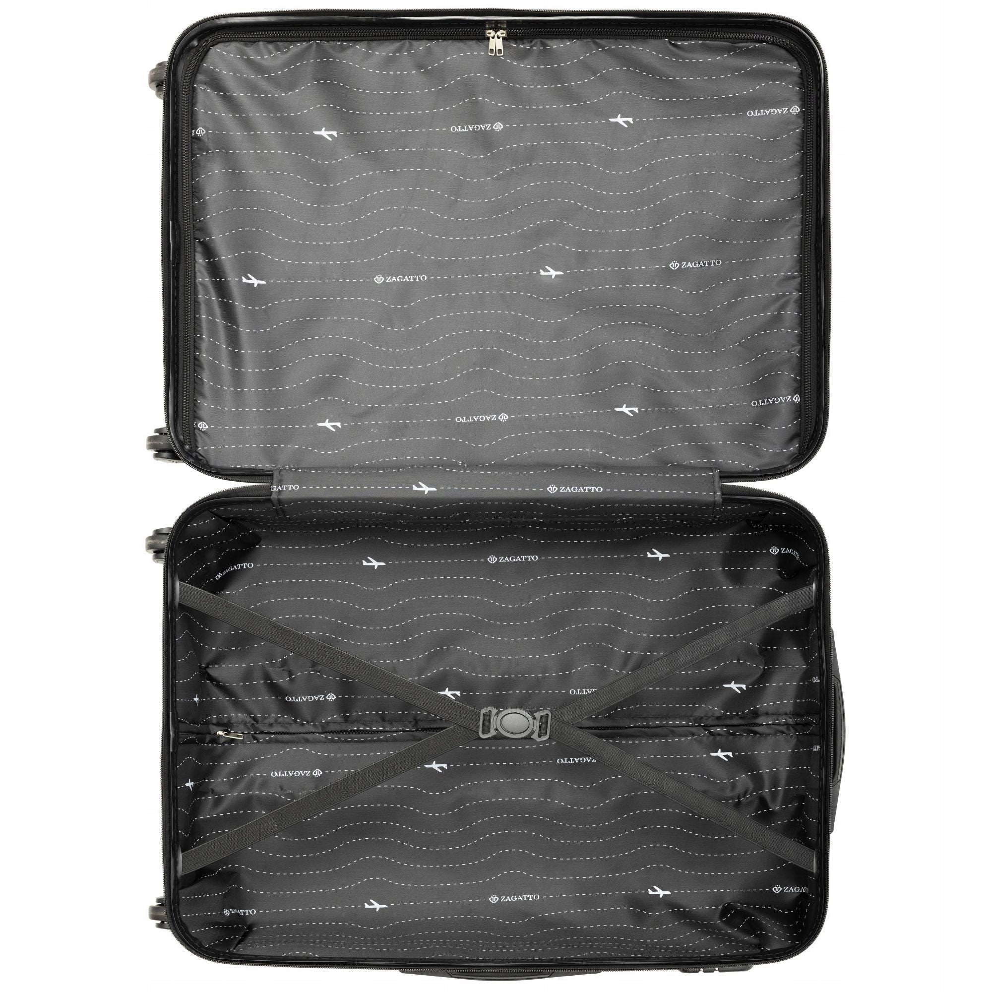 Atidarius lagaminą, Jūsų dėmesį patrauks stilingas vidus, išklotas elegantišku pamušalu su ZAGATTO R logotipu ir skiriamuoju lėktuvėlio motyvu. Siekiant užtikrinti maksimalų daiktų organizavimą ir apsaugą, lagaminas turi dvi atskiras erdves. Pirmojoje kompartimente yra elastingos tvirtinimo juostos, kurios stabilizuoja Jūsų drabužius ir daiktus, neleisdamos jiems slidinėti kelionės metu. Antroji dalis užsegama užtrauktuku, suteikdama papildomą saugią erdvę smulkesniems daiktams ar dokumentams.