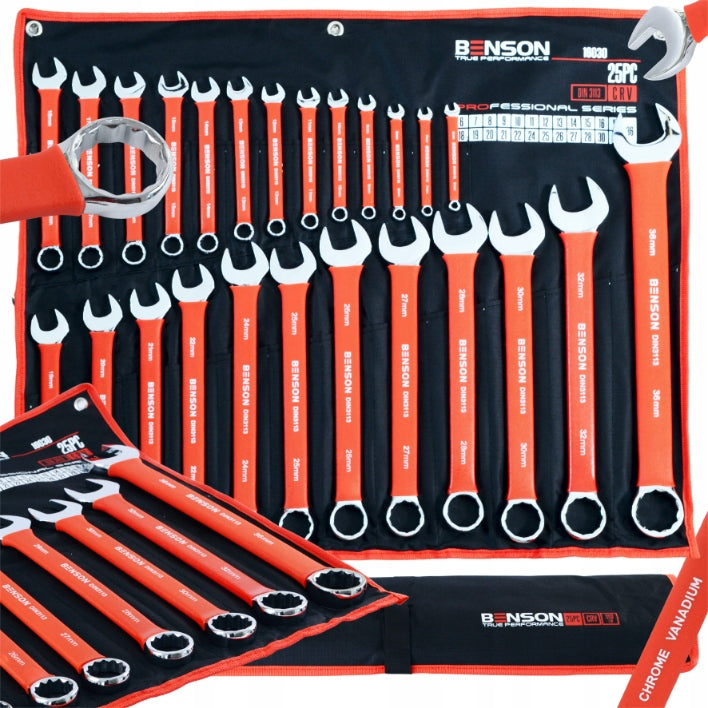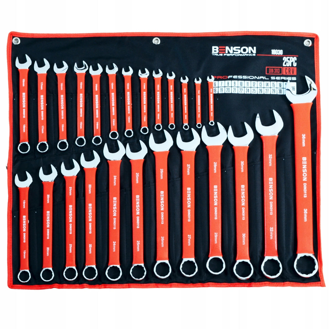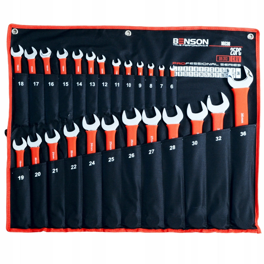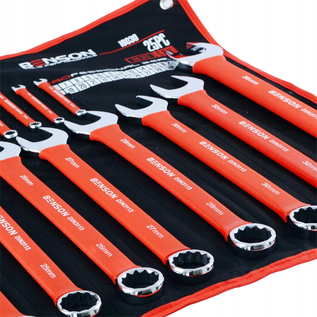Didelis plokščių raktų komplektas su guminėmis rankenomis 6-36mm, 25 vnt., kilimėlis BENSON BY BLACK