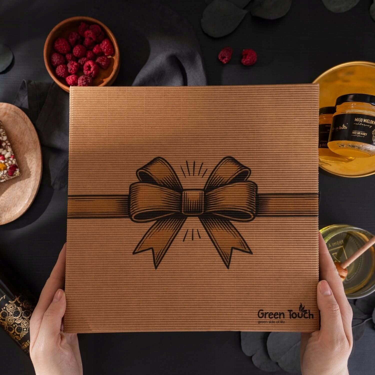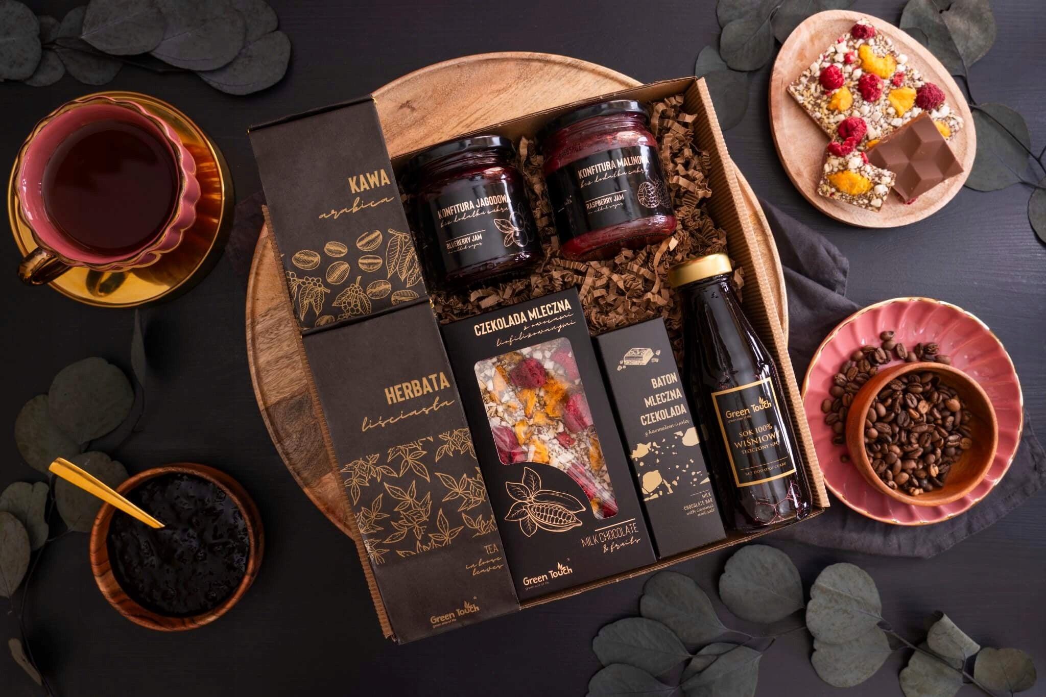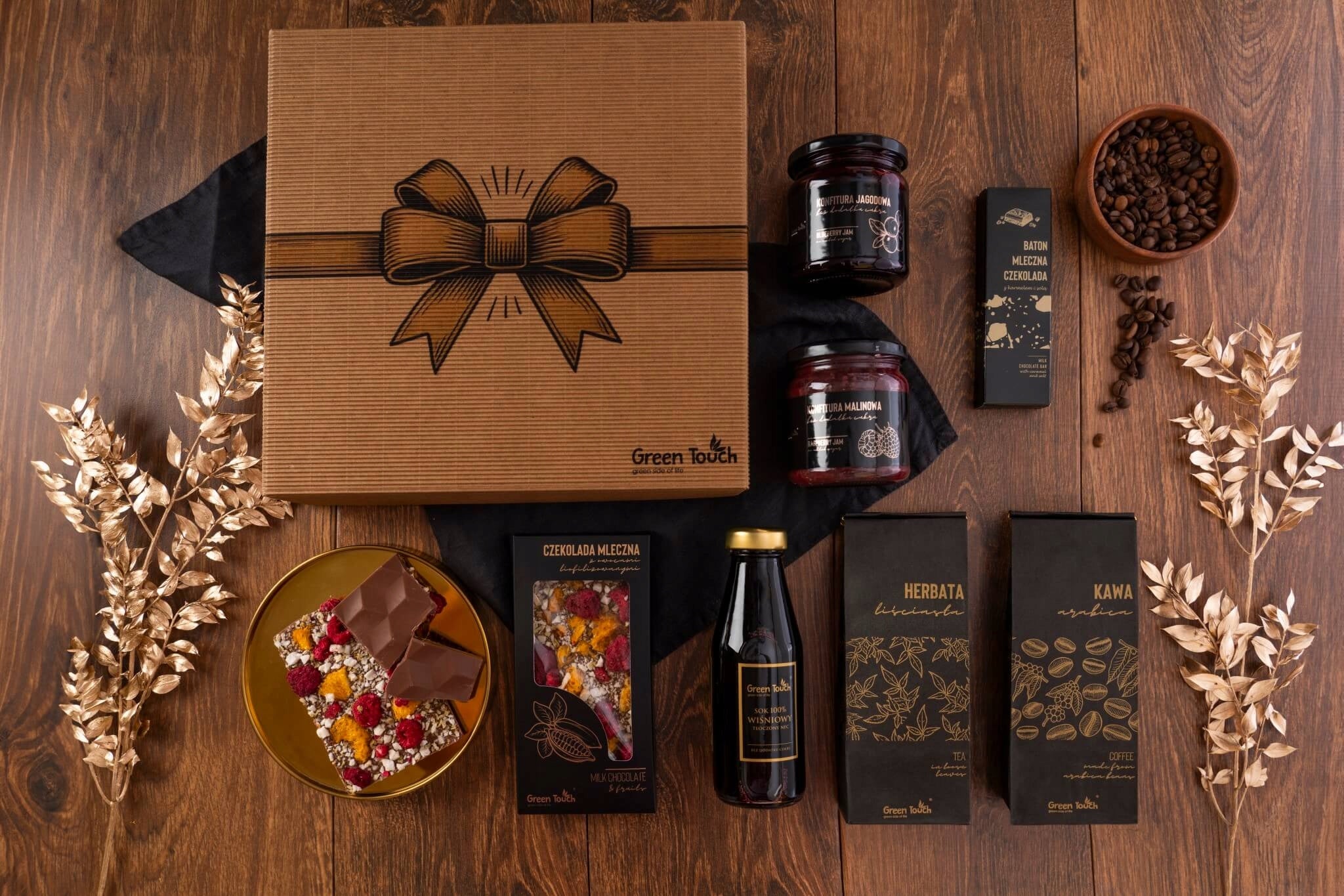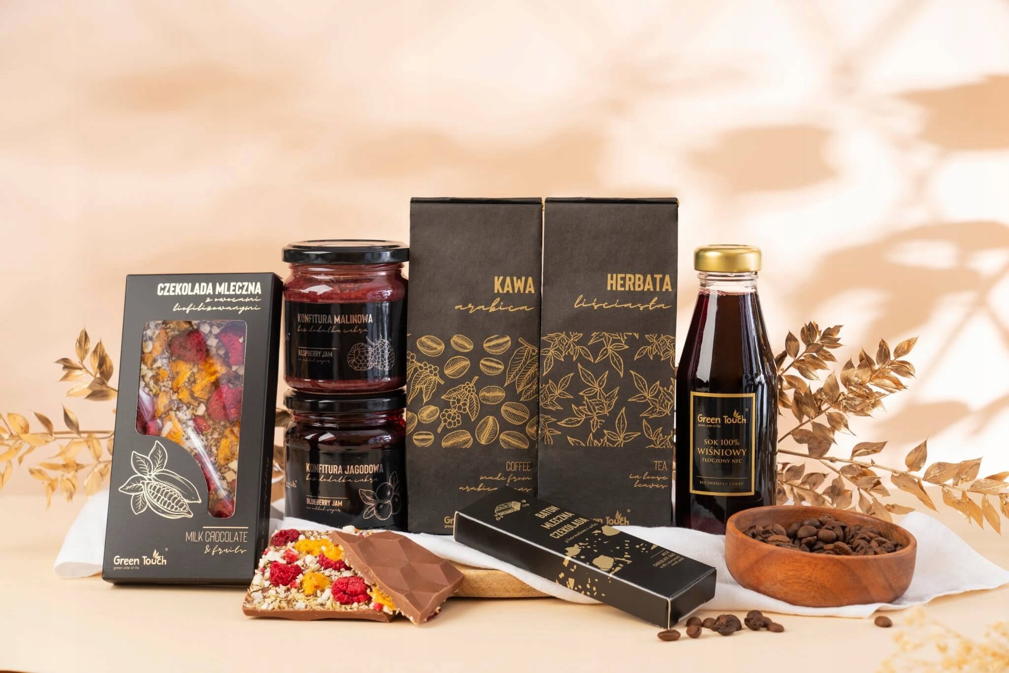 Mūsų išskirtinis rinkinys vilioja gomurį įvairiapusiškumu. Jame rasite šviežiai maltą 100% Arabica kavą „Brazilia Yellow Bourbon“, pasižyminčią švelniu saldumu ir subtiliomis riešutų natomis. Verta paminėti ir juodąją lapinę arbatą su vaisių priedais, kuri sužavi savo sodriu aromatu. Kompoziciją papildo kruopščiai atrinkti delikatesai: pieninis šokoladas su liofilizuota mandarina, avietele ir obuoliu, šokoladinis batonėlis su sūdyto karamelės skoniu bei dvi natūralios, be pridėtinio cukraus, uogienės – miško uogų ir aviečių. Viską papildo natūralus, šaltai spaustas lenkiškas NFC vyšnių sulčių gėrimas, puikiai derantis su arbata ar tiesiog gaivinantis.