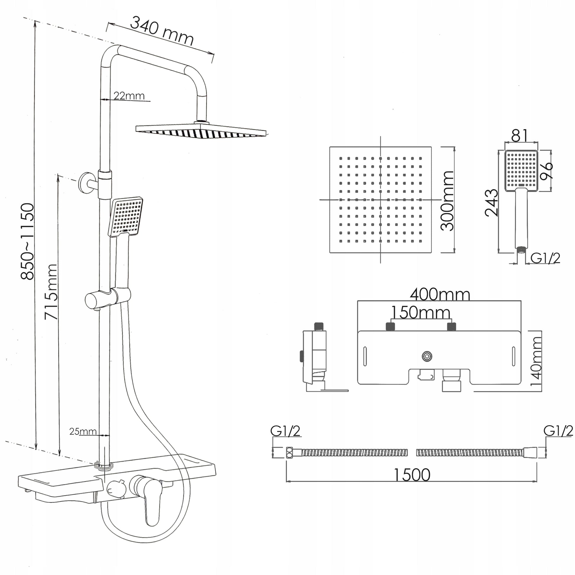 - Komplekto tipas: Sieninis, dviejų angų, vienos svirties, su perjungikliu, 30 x 30 cm lietaus dušu ir rankiniu dušu