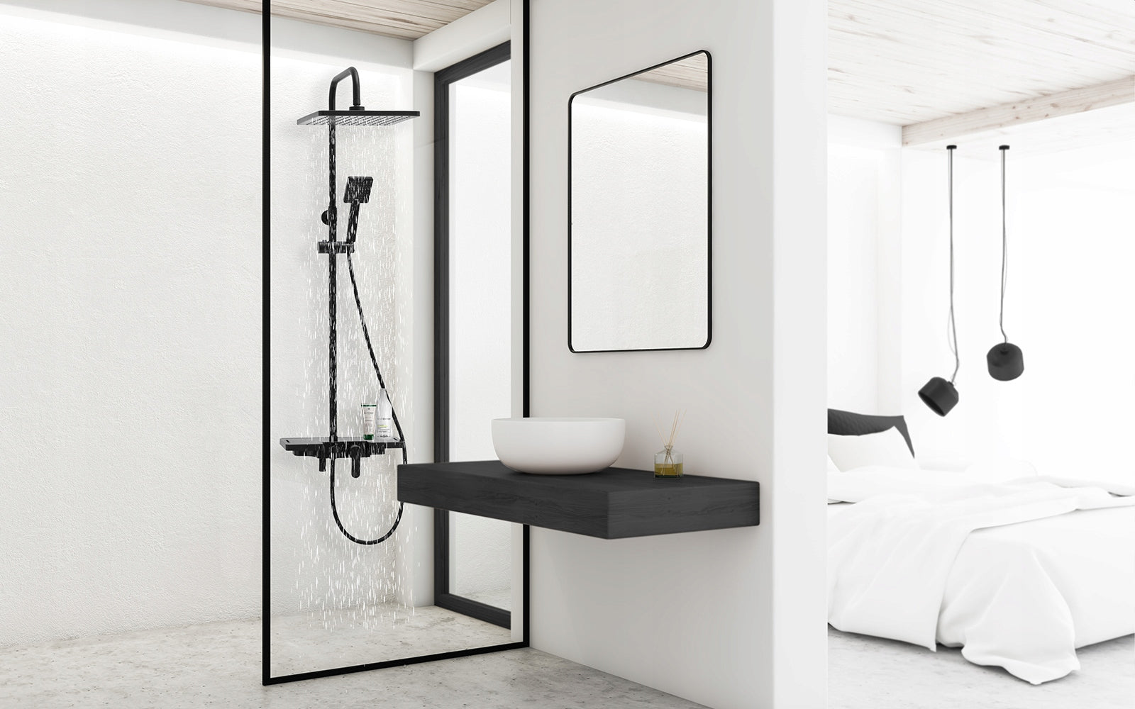 Dušo komplektas, sistema su lentyna ir maišytuvu - Juodas
