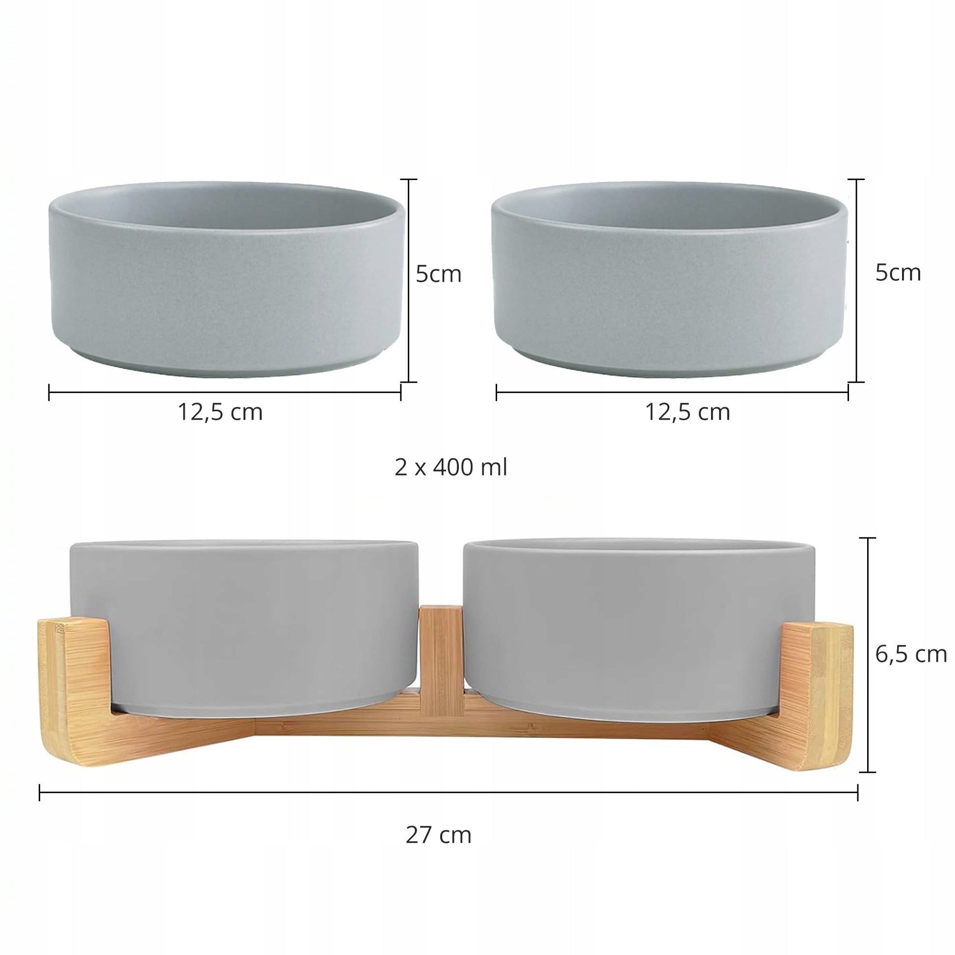 Dvigubi keraminiai šuns ir katės dubenėliai Mersjo Gerda 2x400 ml su neslystančiu mediniu stovu – pilkos spalvos, aukštos kokybės keramika, patogus ir higieniškas maitinimo rinkinys augintiniams