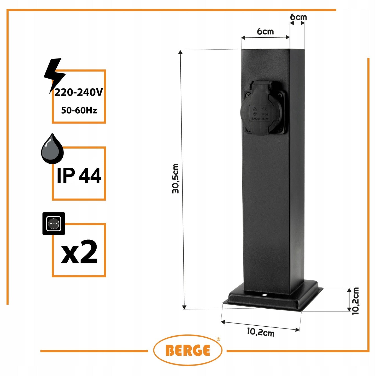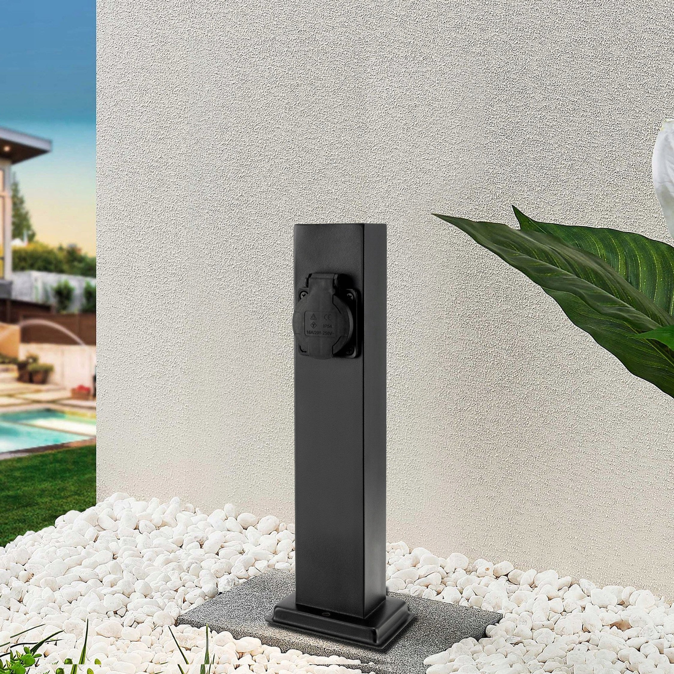 Šis unikalus lauko šviestuvas yra aprūpintas dviem hermetiškais 230V lizdais, kurių kiekvienas gali atlaikyti iki 16A srovę ir iki 3680W galią. Tai reiškia, kad galite saugiai prijungti įvairius sodo įrankius, tokius kaip vejapjovės, gyvatvorių žirklės, dulkių siurbliai ar kitą elektrinę įrangą, tiesiai sode, be poreikio naudoti papildomus prailgintuvus. Dvigubas lizdas suteikia didelį patogumą, leidžiant vienu metu naudoti du įrenginius, taip ženkliai palengvinant sodo priežiūros darbus ar lauko vakarėlių organizavimą. Stulpelio aukštis yra 30 cm, todėl jis diskretiškai įsilieja į aplinką, bet pakankamai matomas, kad atliktų savo funkcijas.