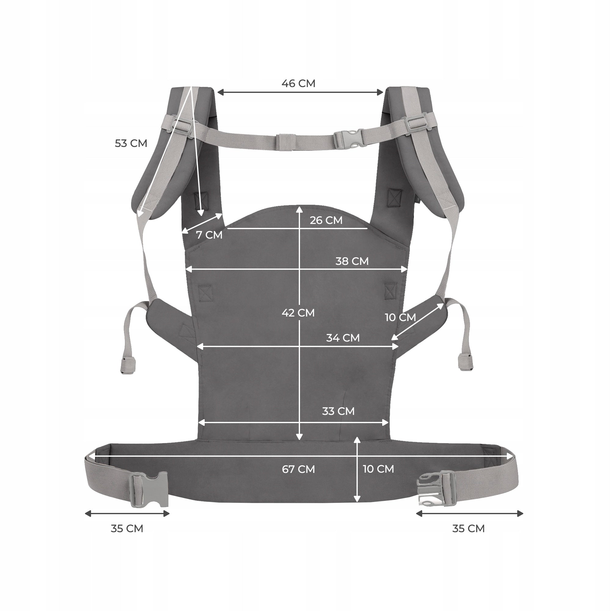 - Reguliuojamumas: Skirtingi dydžiai ir poreikiai atitinka reguliuojamas panelis, klubų diržas ir petnešėlės.