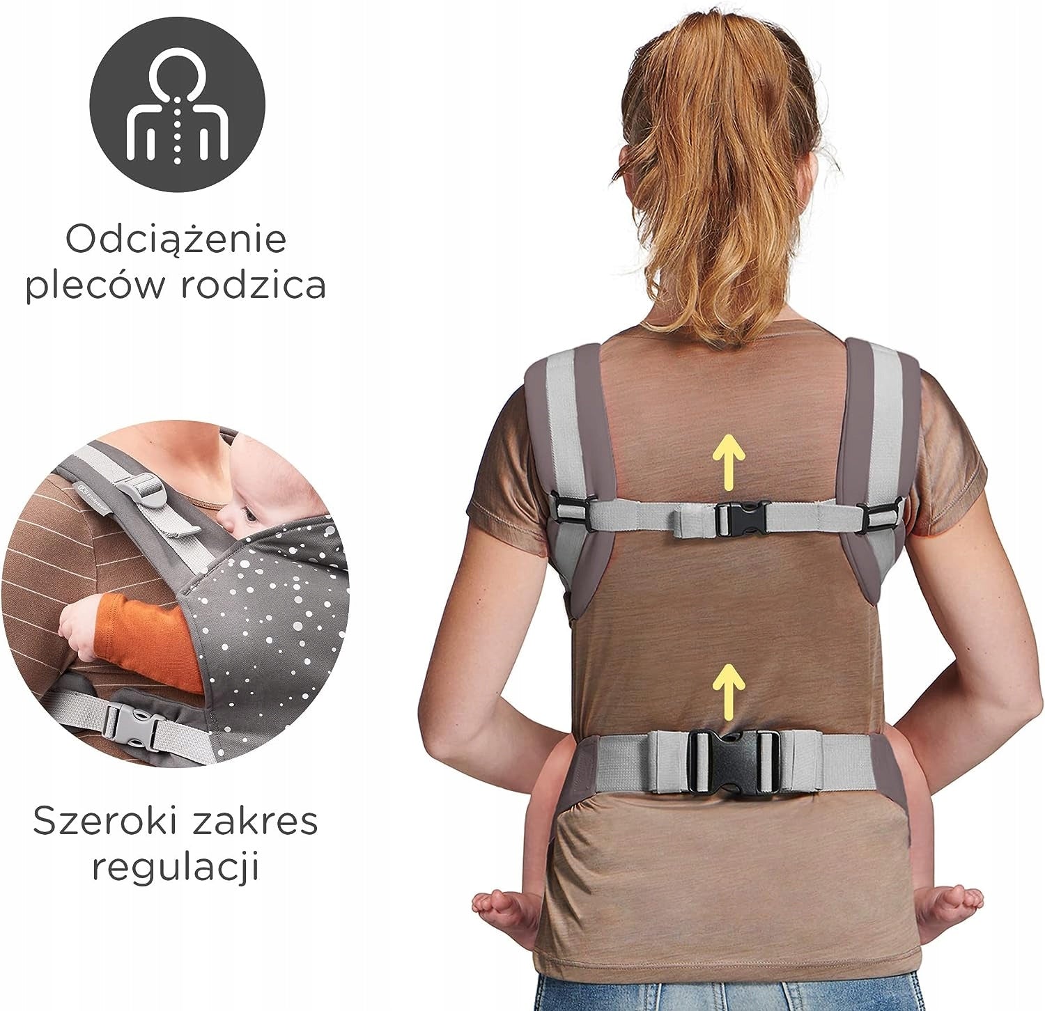- Komfortas tėvams: Platūs, paminkštinti dirželiai ir klubų diržas tolygiai paskirsto svorį.