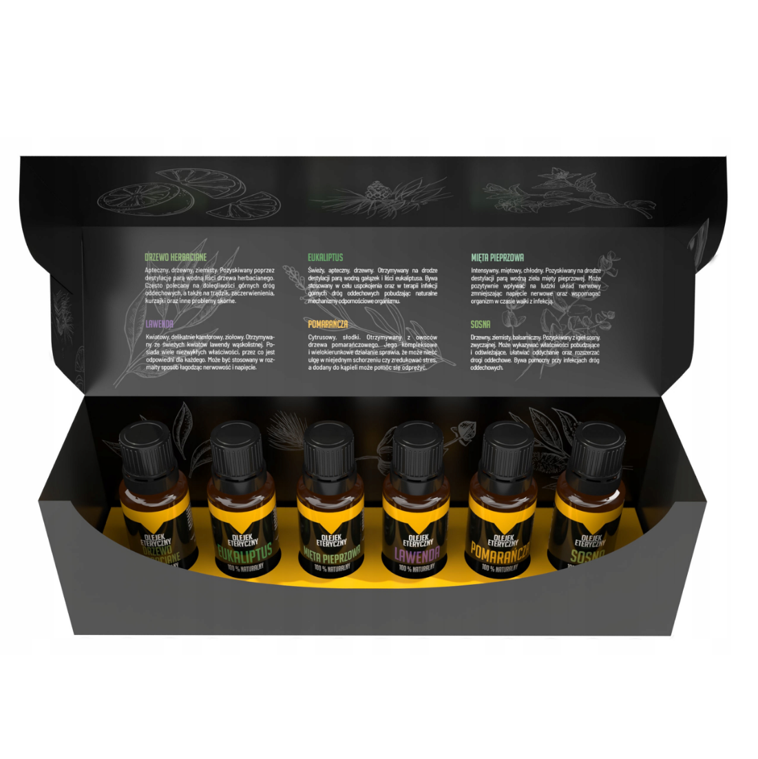 Elegantiškoje juodai geltonoje dėžutėje yra net šeši 100% natūralūs Bilovit eteriniai aliejai. Rinkinys buvo sukurtas labai kruopščiai, todėl tikrai tiks kaip dovana.