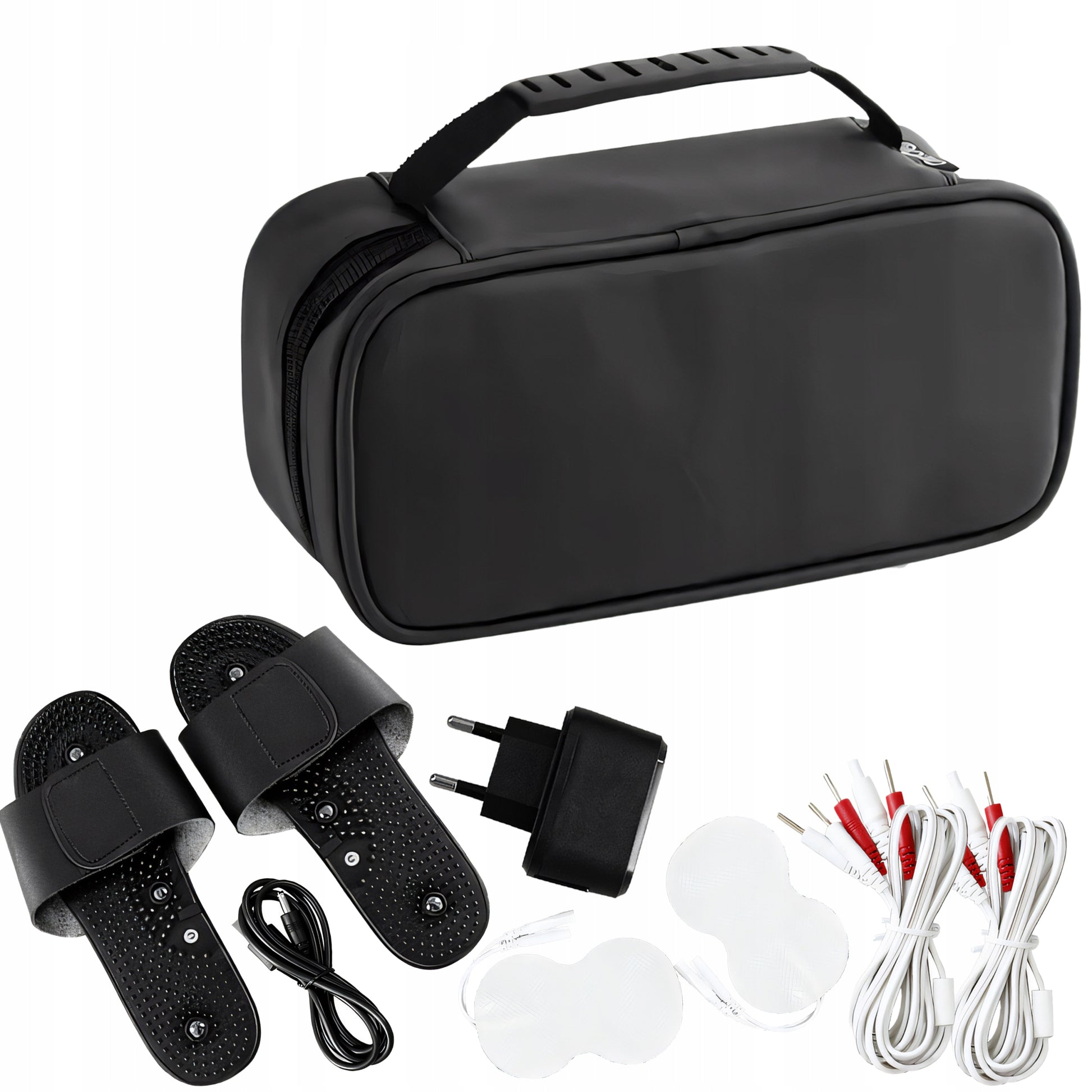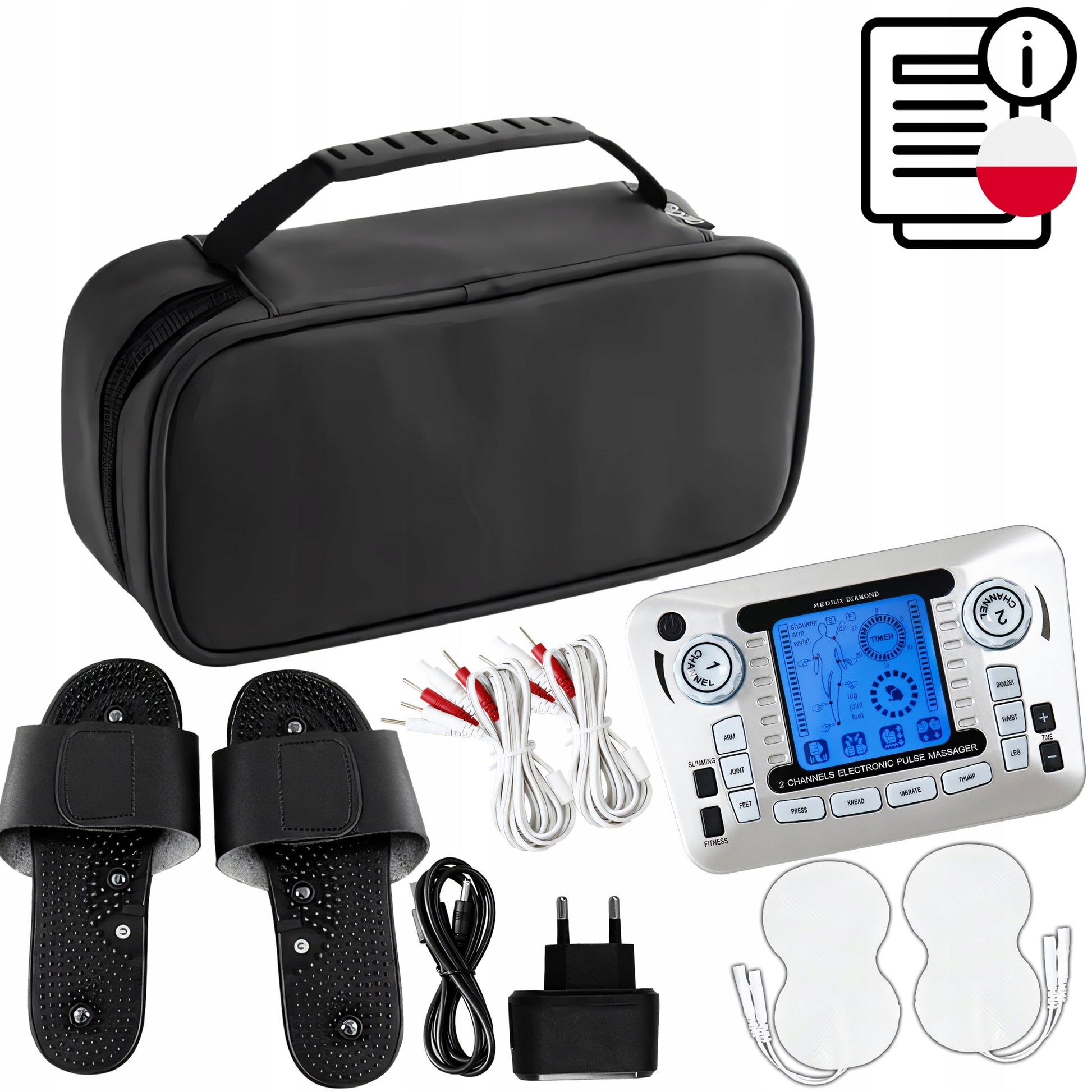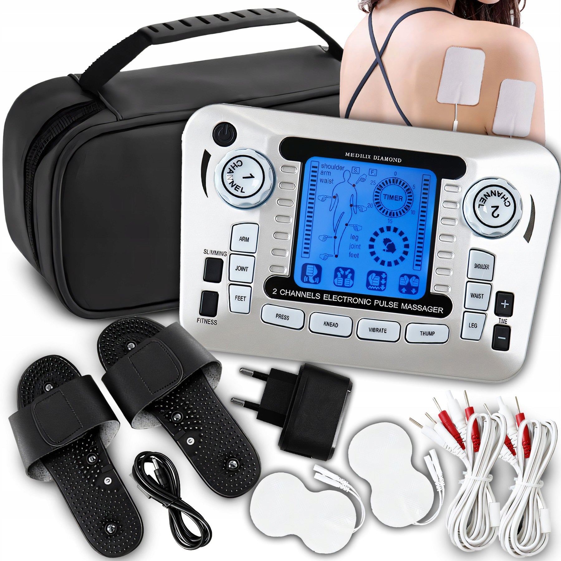 Galingas dviejų kanalų elektrostimuliatorius TENS EMS srovės, elektrodai, rinkinys, dėklas